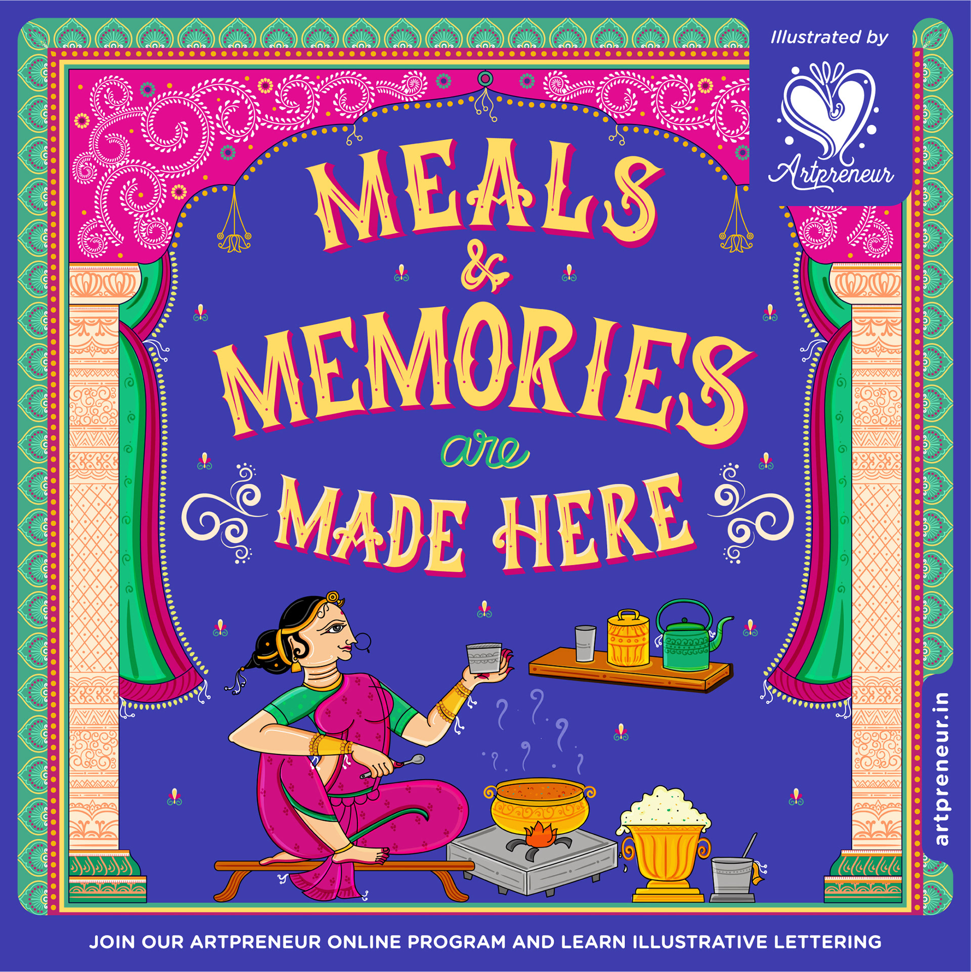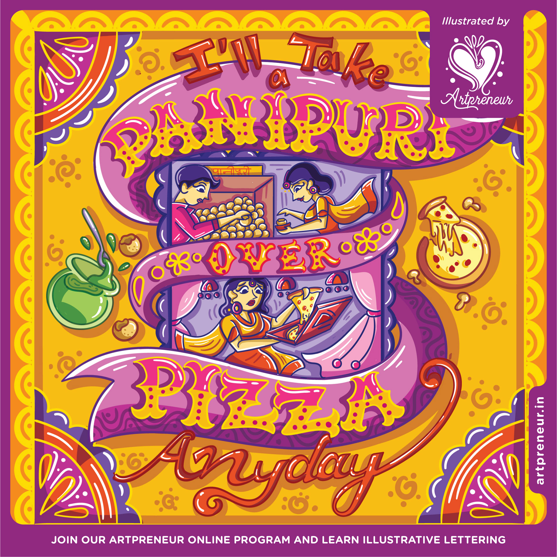 Pattachitra inspired illustrative lettering poster on food