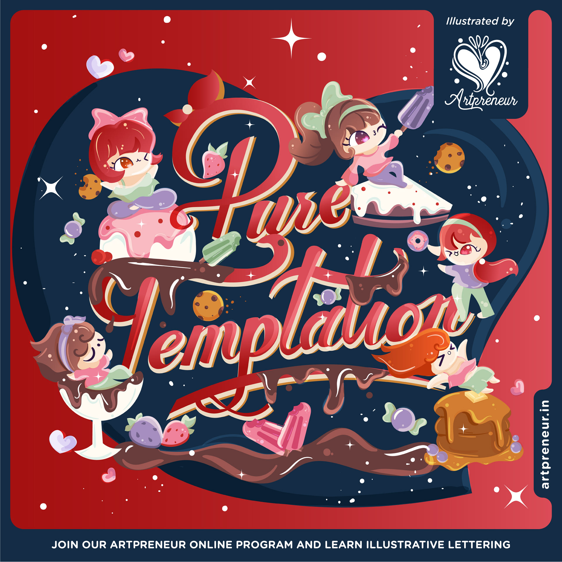 Temptations of chocolates & desserts in cute Kawaii style Illustrative retro style Lettering