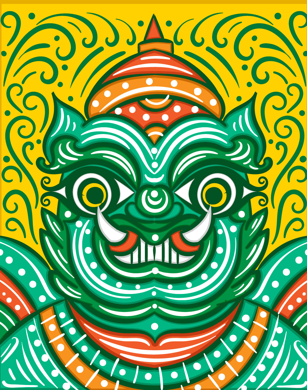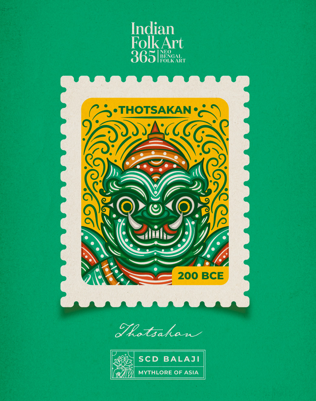 🖼️ The illustration, is a visual blend of Thai Folk Art, Pha Lai Thai, and Indian Folk Art, Bengal Pattachitra. Thotsakan is typically shown wearing green garments or having green skin. However, the specific details of Thotsakan's appearance can vary depending on the region, time period, and cultural context in which he is depicted.
