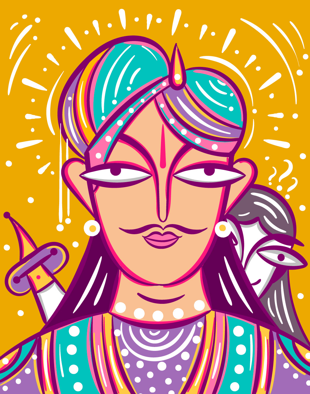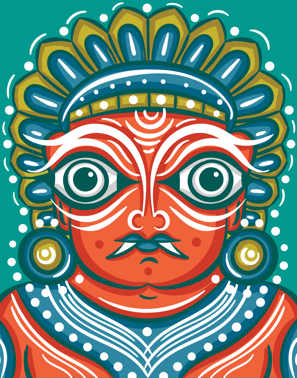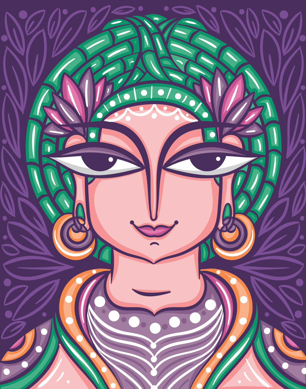 I am delighted to have the opportunity to showcase my Neo Bengal Folk Art Portraits with you. My artistic journey began with the desire to explore Bengal Folk Art Faces in a contemporary style. I started with rough pencil sketches in my sketchbook, and after seeing their potential, I experimented with ink brush strokes. Eventually, I digitized the illustrations using Adobe Illustrator and shared them on my social media platform, Instagram. The positive response from my audience has been truly inspiring and encouraged me to create a series of evolved illustrations.