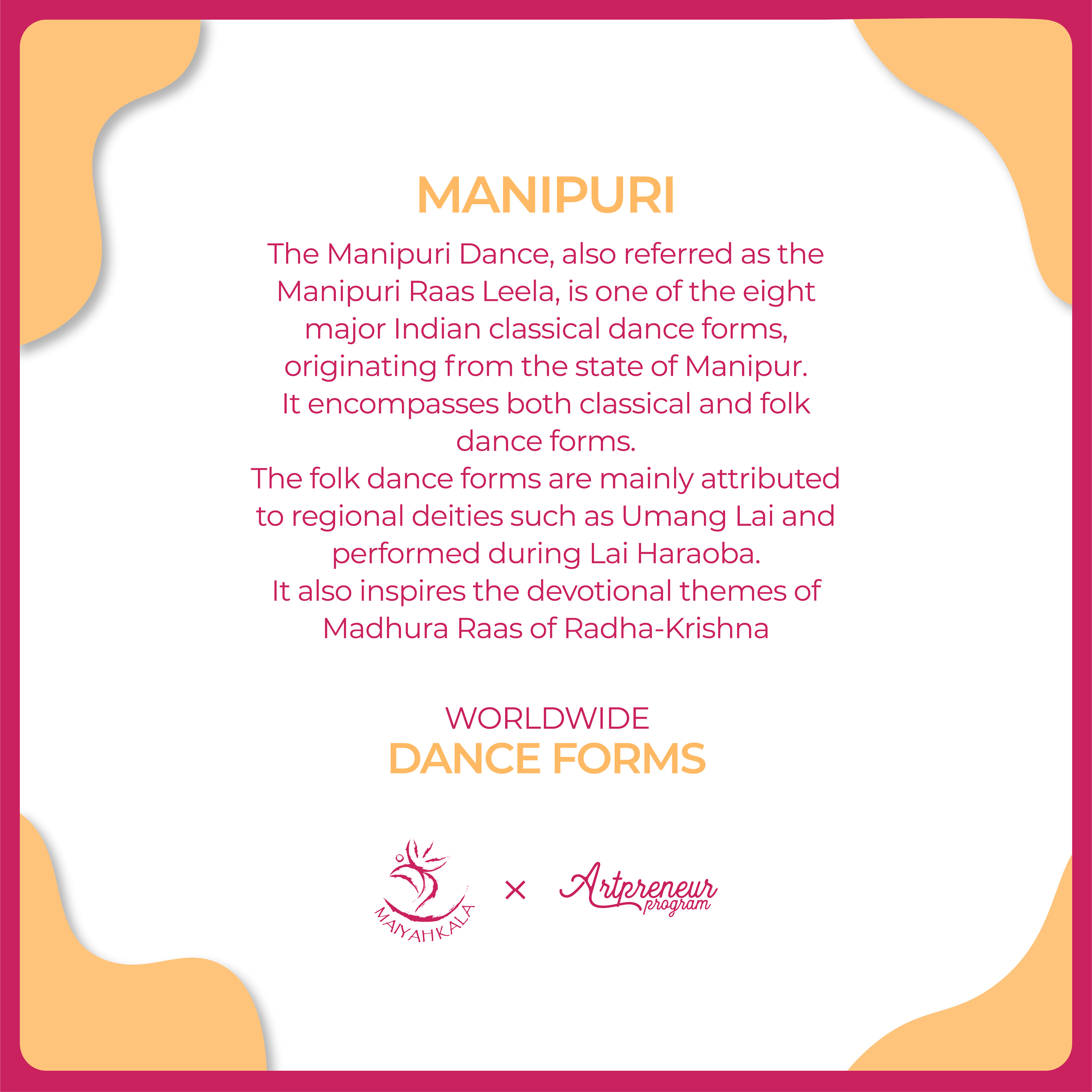 The 'Manipuri Dance', also referred as the "Manipuri Raas Leela", is one of the eight major Indian classical dance forms, originating from the state of Manipur.