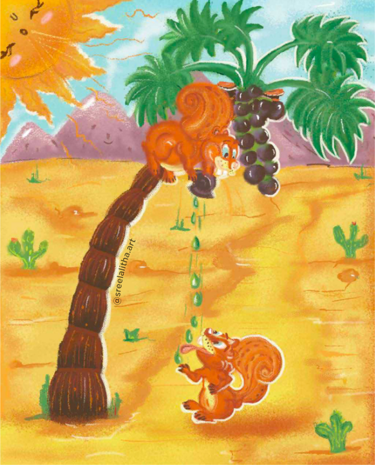 A scene featuring a palm tree, where two friendly squirrels quench their thirst with the refreshing drink of padhaneer. It serves as a reminder that nature offers a bountiful array of nourishing beverages, and padhaneer is among them.