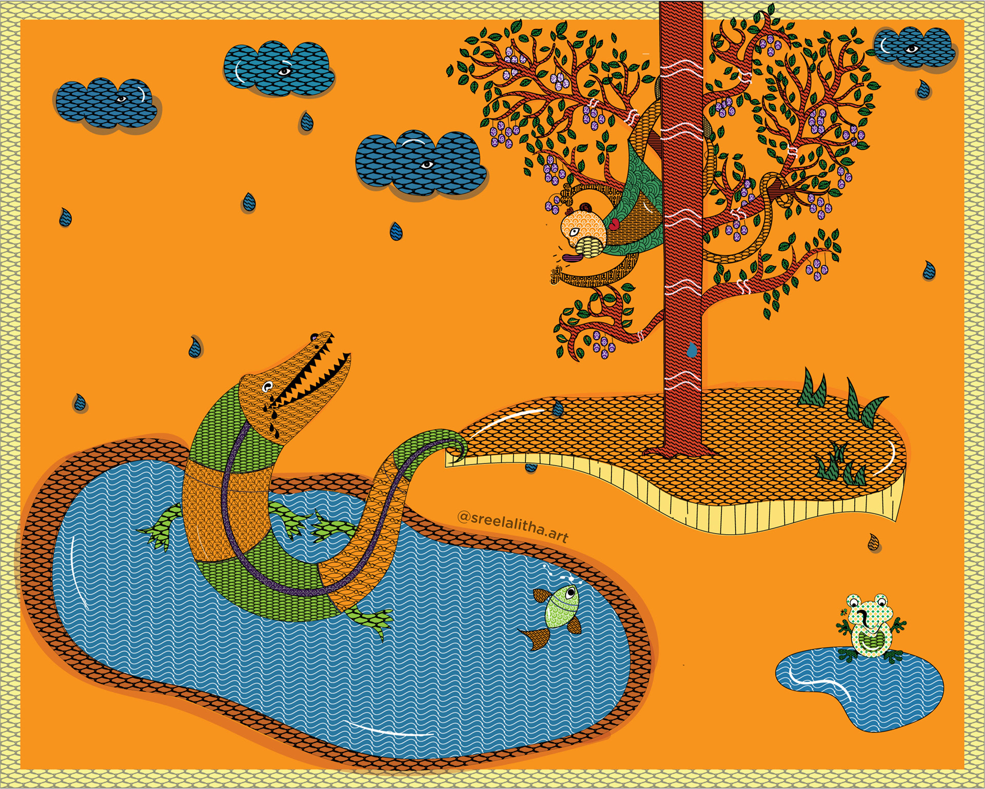 Illustrated in the enchanting Gond art form, this painting portrays the timeless tale of the monkey and the crocodile from the Panchatantra tales. It showcases the ingenuity of the clever monkey, skillfully evading the clutches of the cunning crocodile.