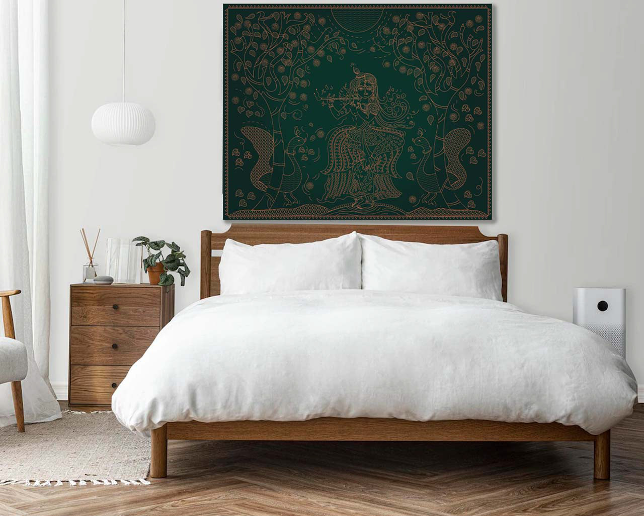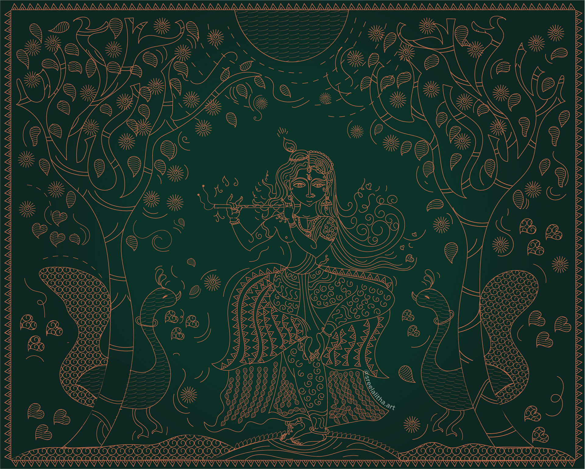 A heartfelt tribute to Krishna's beloved Kadamba tree. This artwork captures the enchanting presence of Krishna and Radha, their love radiating beneath the fragrant embrace of the Kadamba tree in the contour art form.