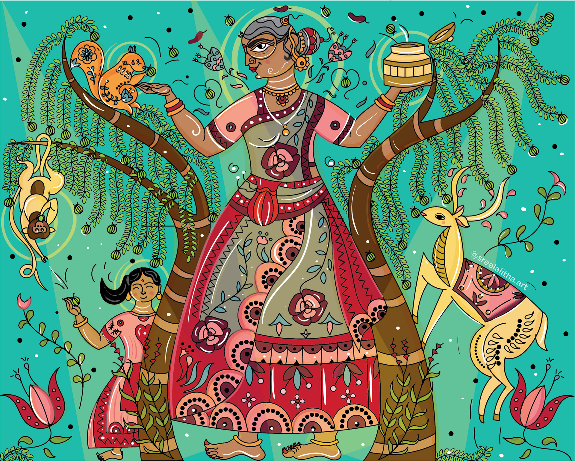 Drawing inspiration from the Scandinavian art style, this piece depicts an Amla tree with abundant fruits, grown at Grandma's home. During the summer vacation, Grandma affectionately crafts zesty Amla pickle, imbued with fragrant spices. She shares it with her granddaughter, a squirrel, a deer, and a monkey—symbolising her boundless love and kindness. The illustration also captures how her affection complements the inherent virtues of the Amla Fruit.