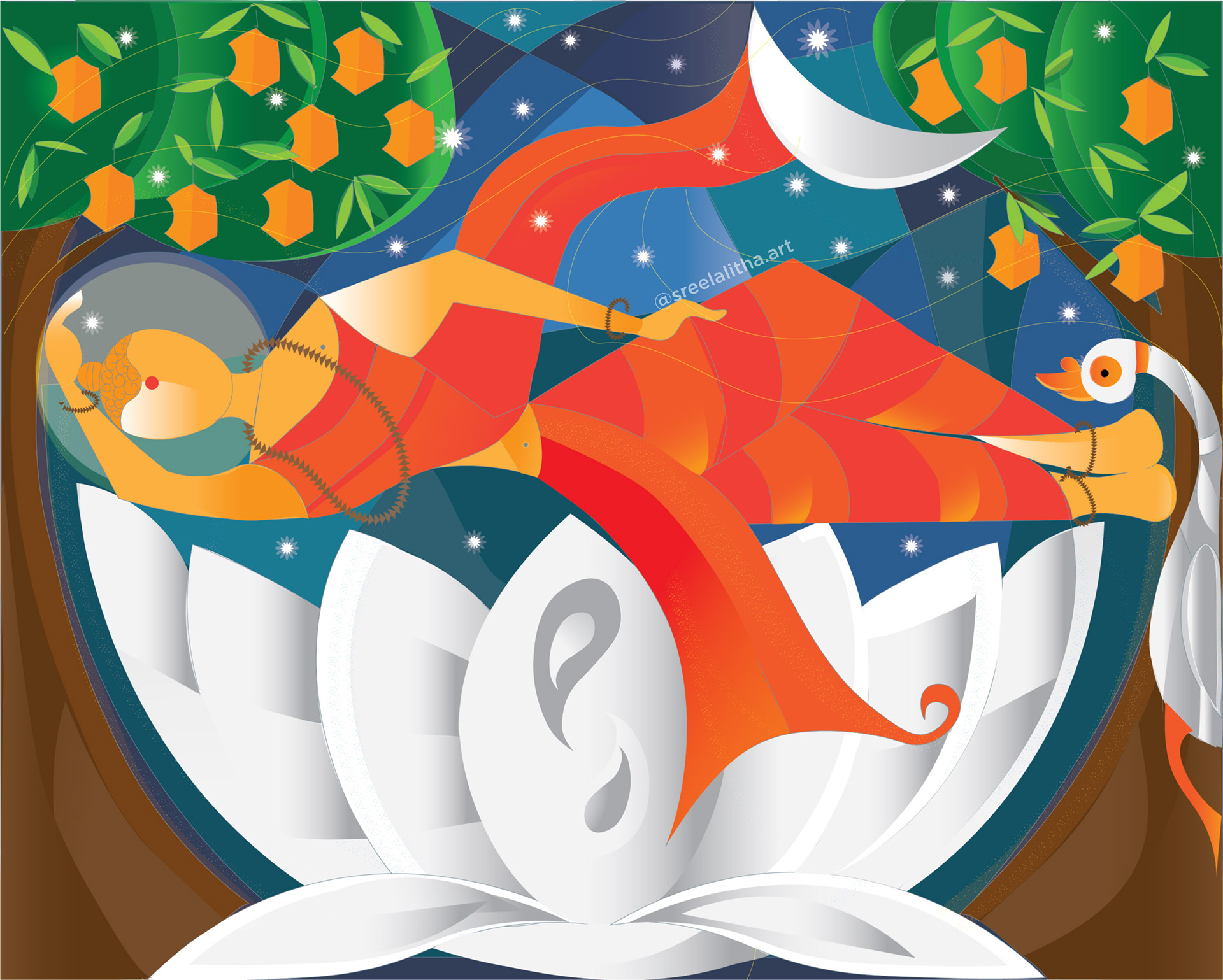 Kolam is a mesmerizing art form that combines geometric designs, straight lines, curves, and loops to create enchanting patterns. This piece depicts Shiva and Parvathi in a serene setting—a coconut grove—where they blissfully unwind while savoring the beauty of the sunrise.