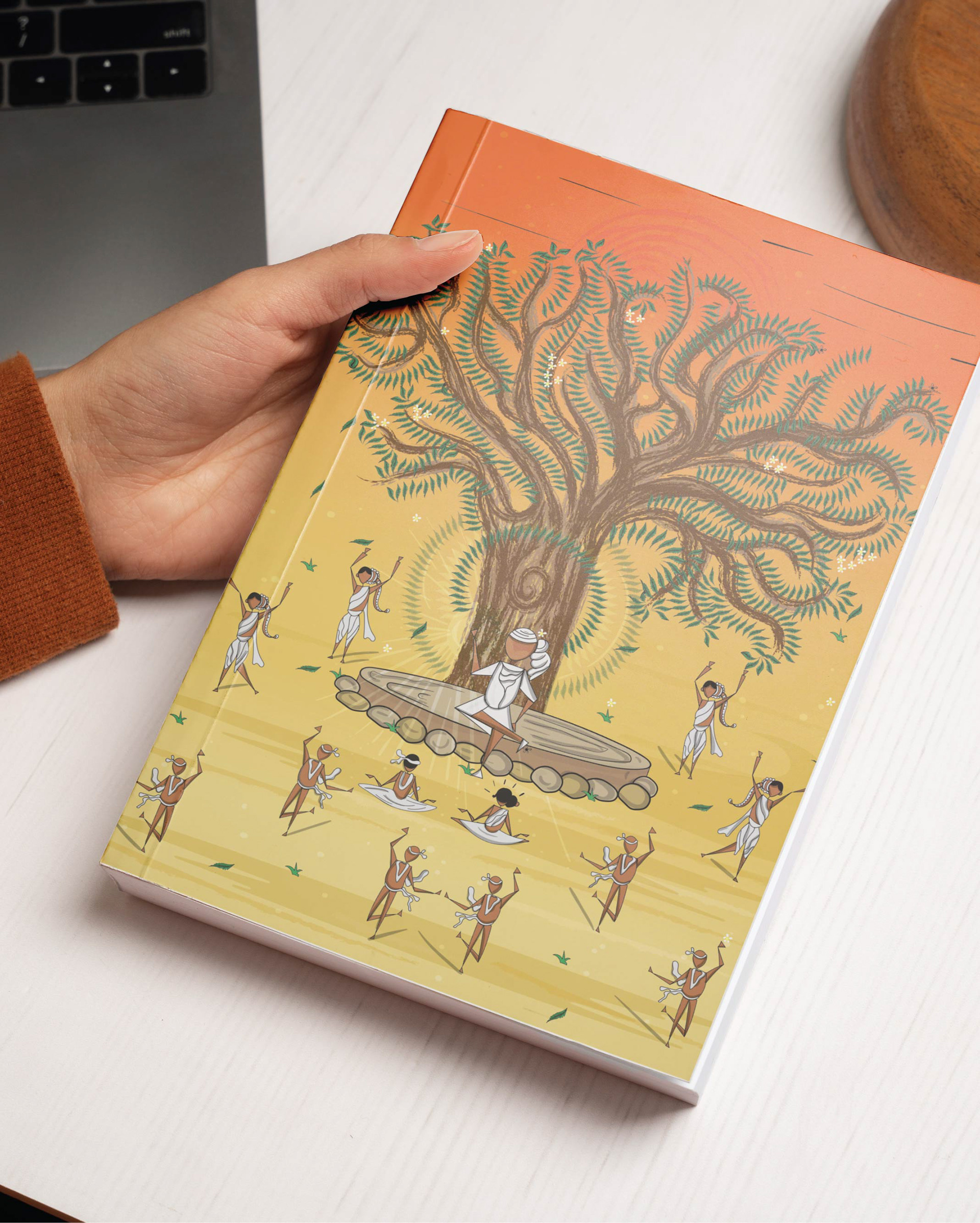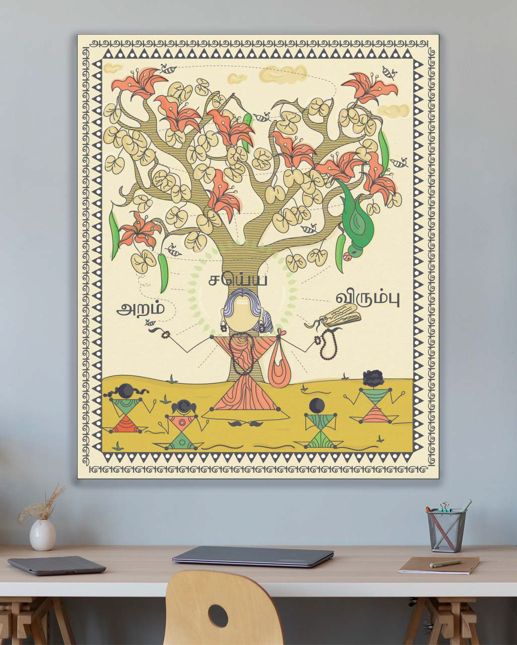 Presenting a warli Illustration of the Mandharai tree, a source of sustenance and healing through seeds, blossoms, and bark. Echoing Avvai's path, it embodies a life of purpose and wisdom shared through a spiritual journey.