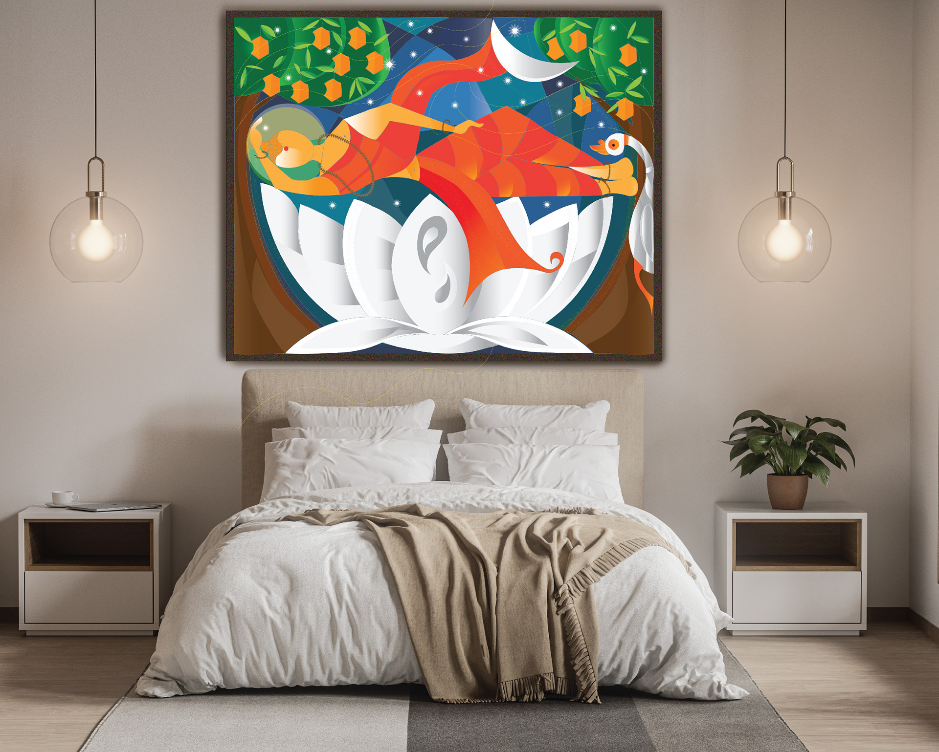 Showcasing Lord Buddha in Cubism Art Style, accompanied by a devoted crane, symbolizing a Bodhisattva. The night sky, adorned with sparkling mangoes in the Mango Grove, adds a distinctive touch to this exquisite artwork.