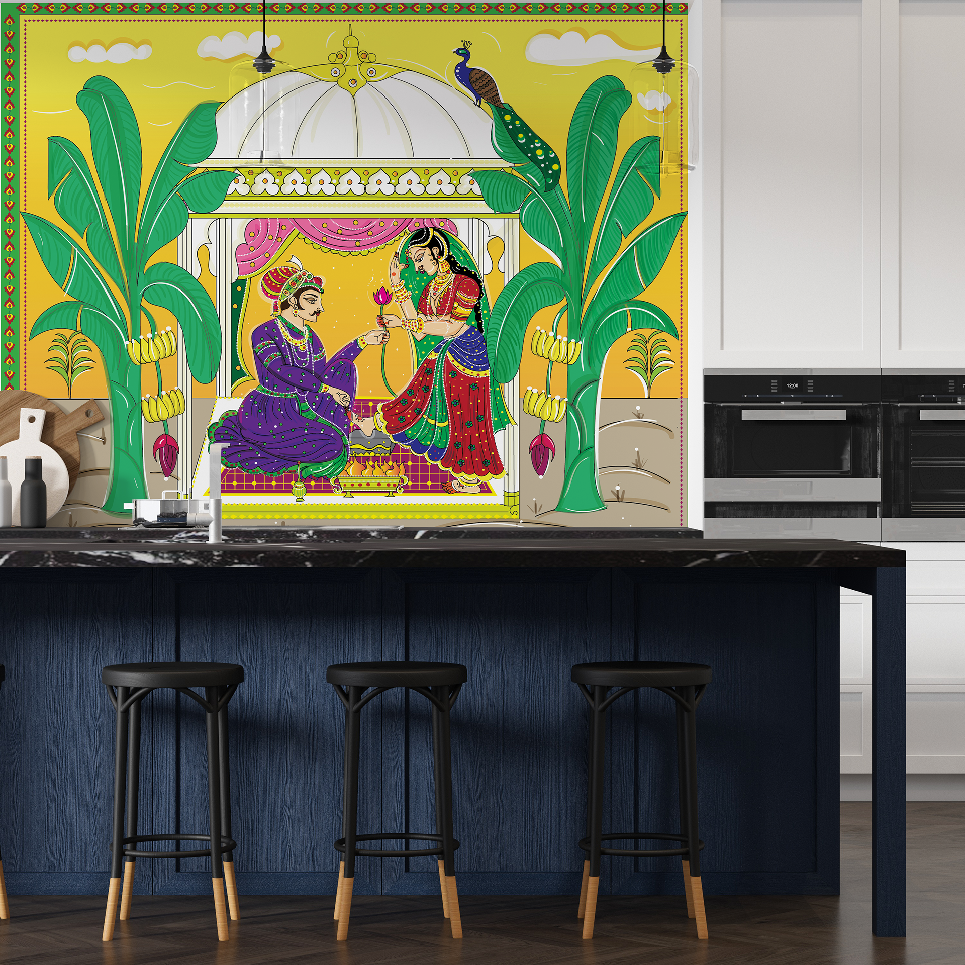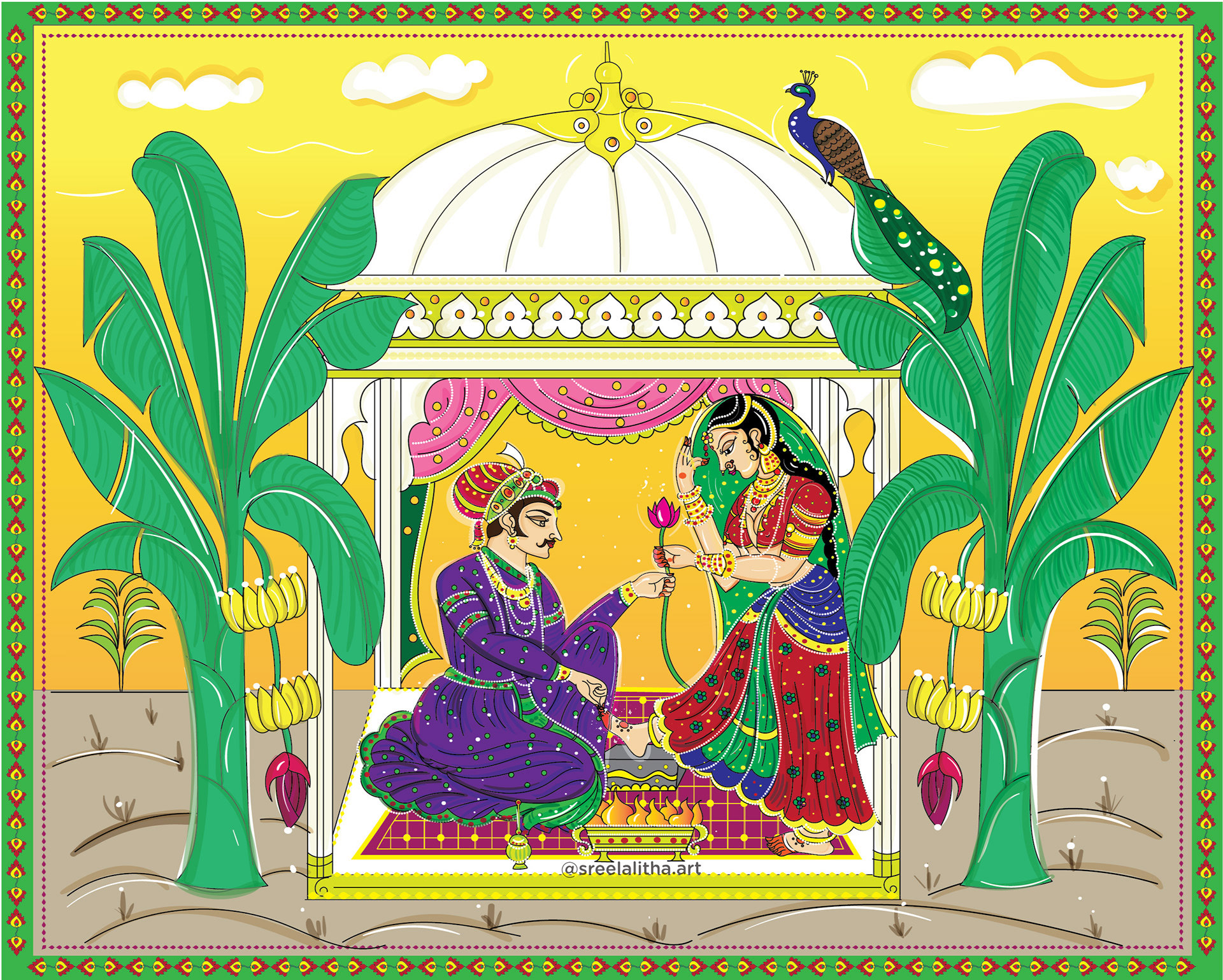 This art piece showcases a Mughal-style painting capturing a wedding amidst the lush embrace of Banana trees—an iconic element in South Indian weddings, symbolizing prosperity and new beginnings. As the Tamil phrase goes, 'Vazhai Adi Vazhai' symbolizing an eternal life to bless the newly-wedded couple.