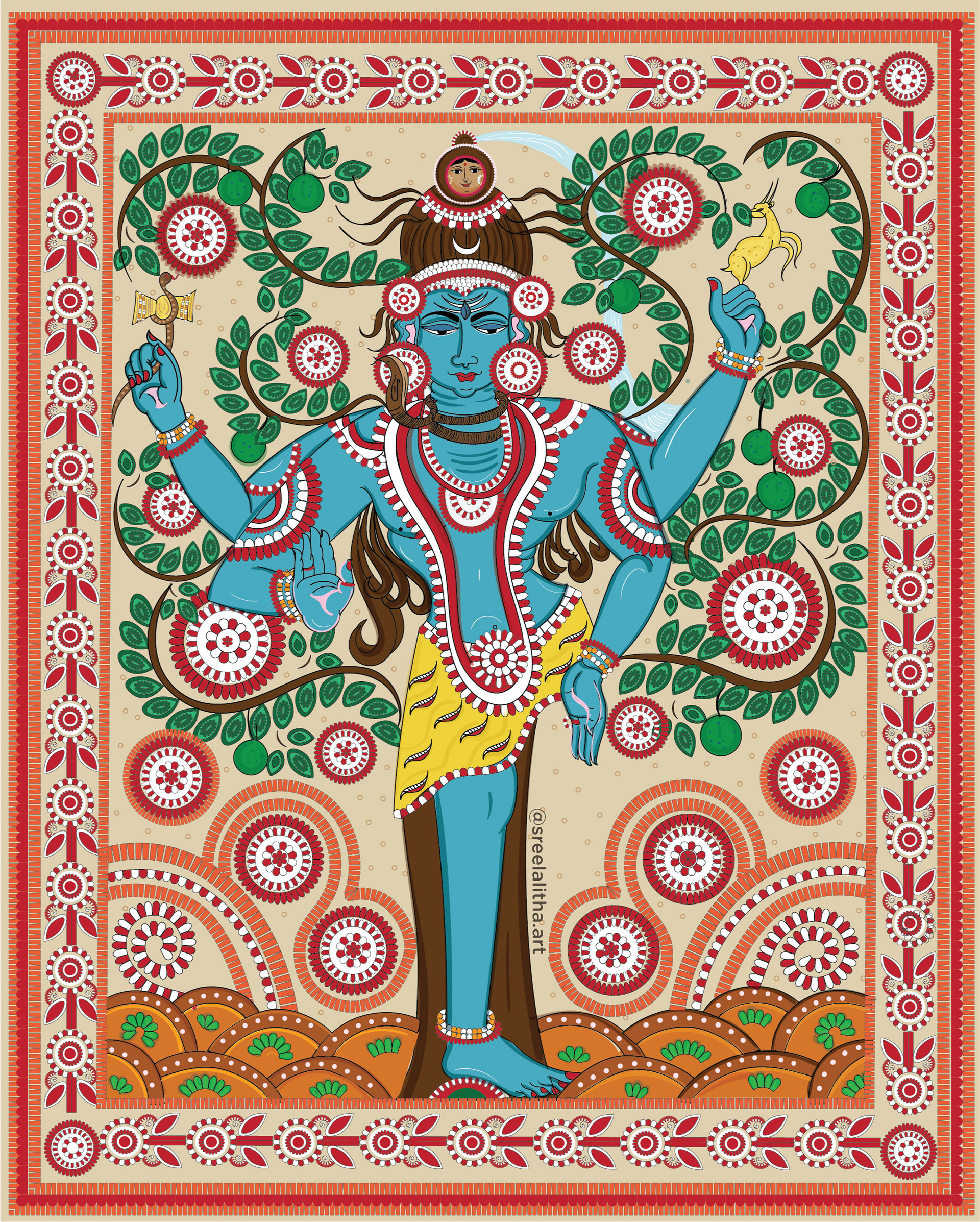 Depicting Shiva in a moment of intense focus, performing penance beneath a bael tree. This portrayal of Ekapadha (one-legged stance) is rendered in the mesmerizing leather puppetry style.