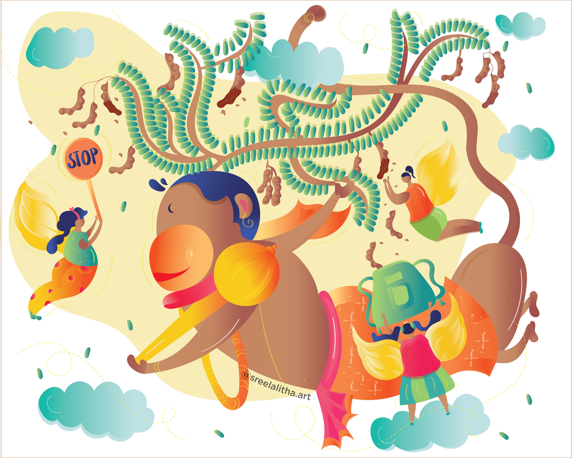 Evoking school day nostalgia, the tamarind tree's tartness sparks memories of gathering with friends on the way home. This art-deco based artwork envisions the tree with beloved Hanuman delivering the cherished fruit, further enhancing the scene's enchantment.