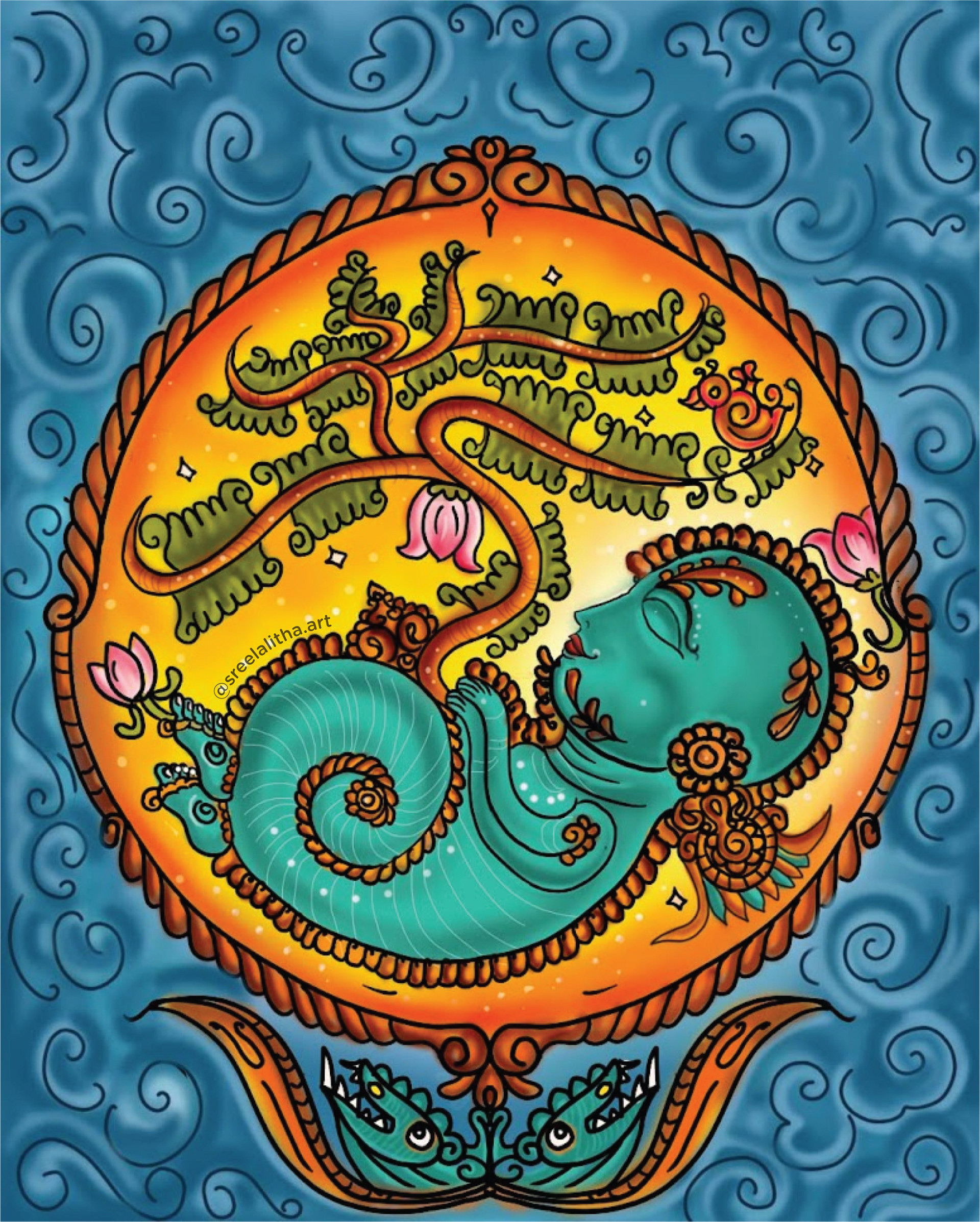 Within this mesmerizing Kerala Mural artwork, a profound symbolism emerges—a depiction of new life's birth in the expanse of the universe. The Tree of Life serves as a binding thread, bestowing the resilience to endure challenges. It represents the journey of nurturing and witnessing the emergence of a beautiful inner being.