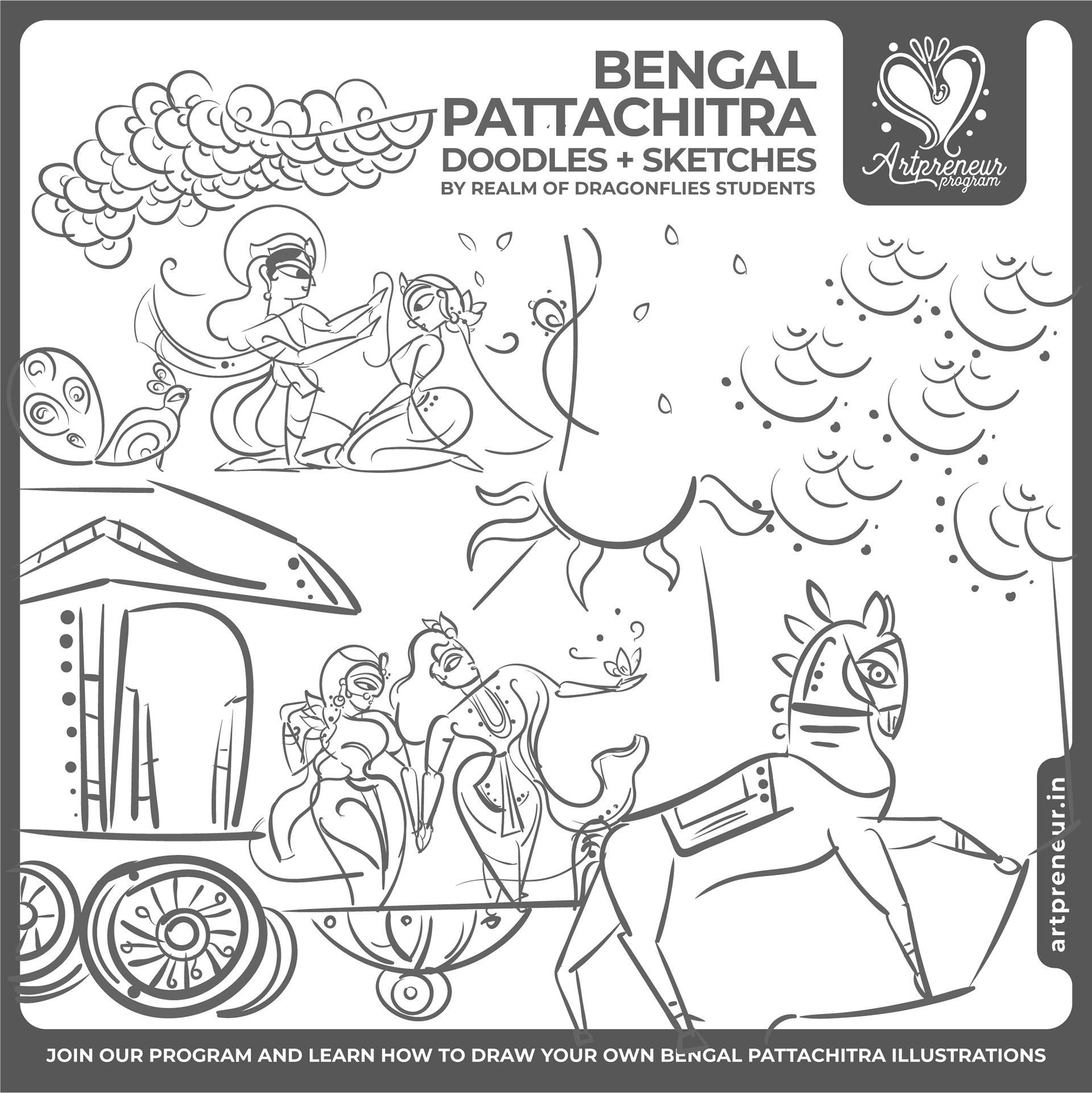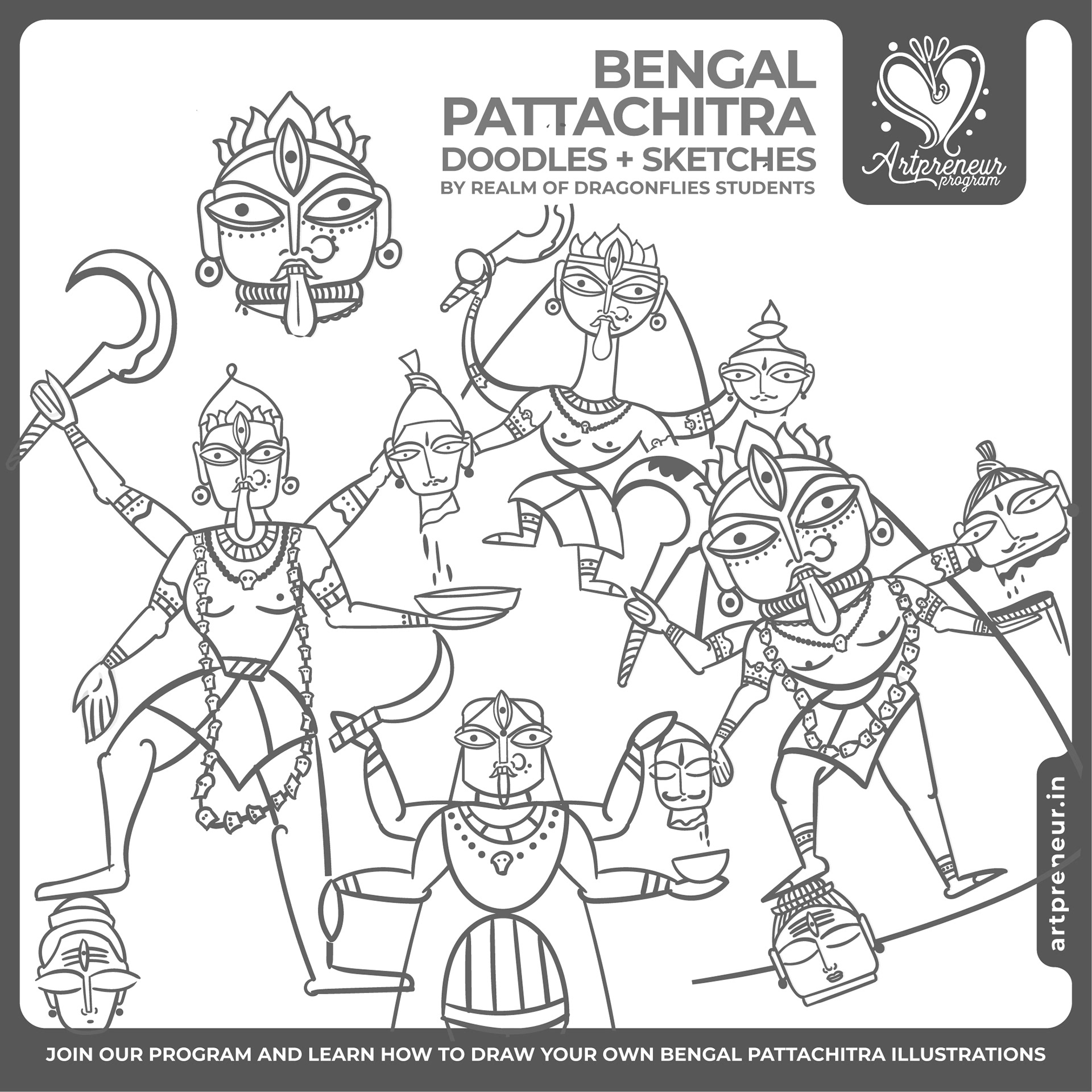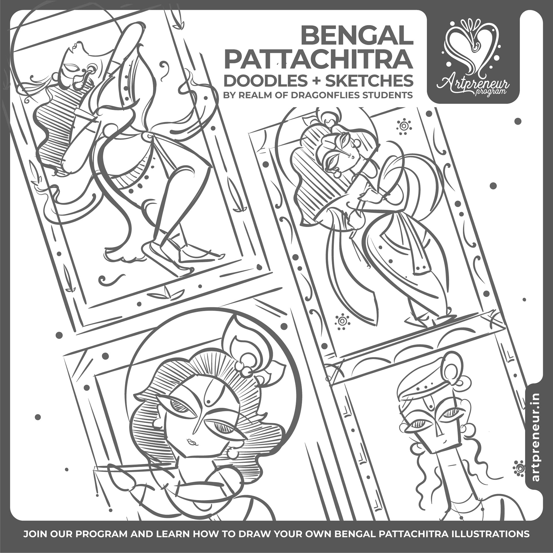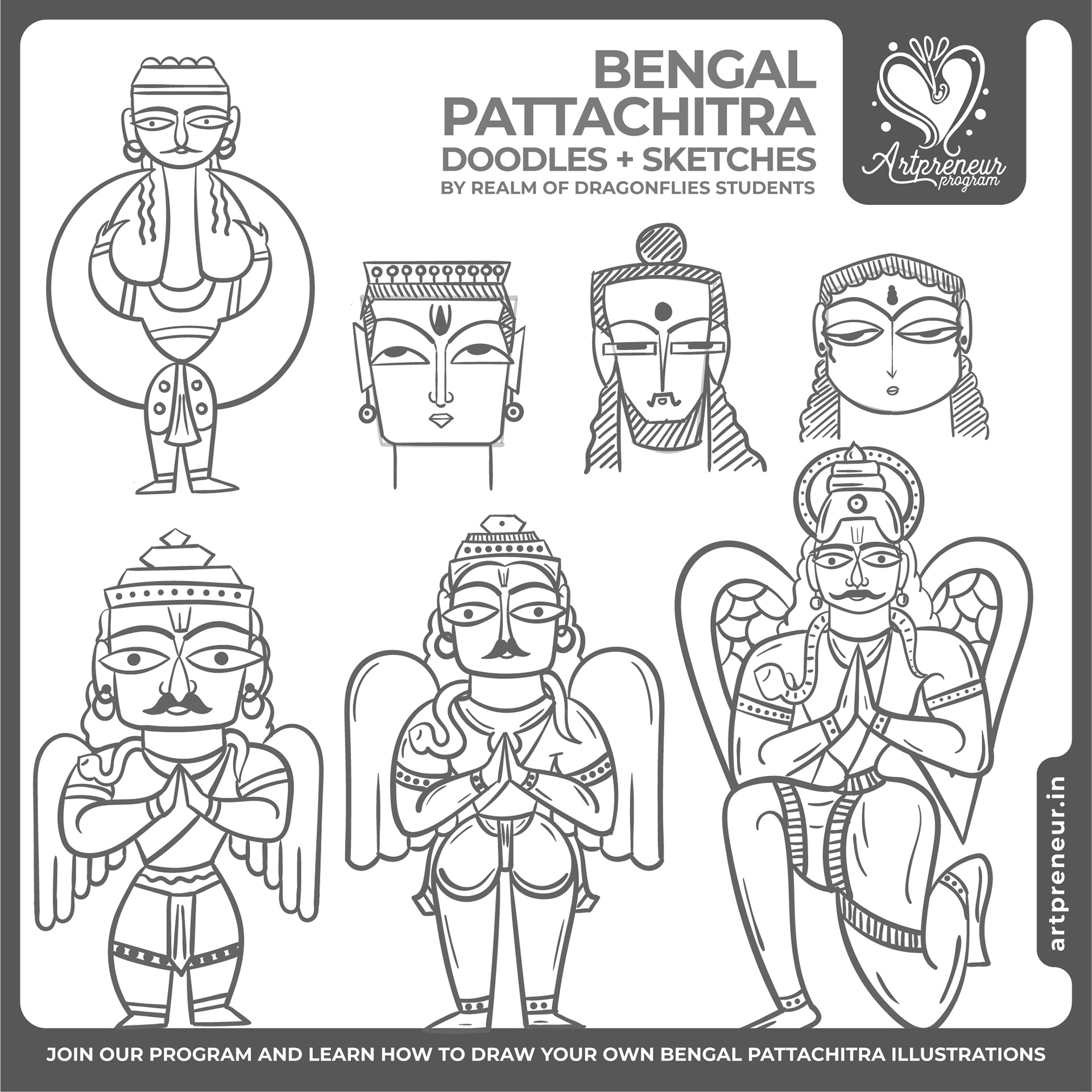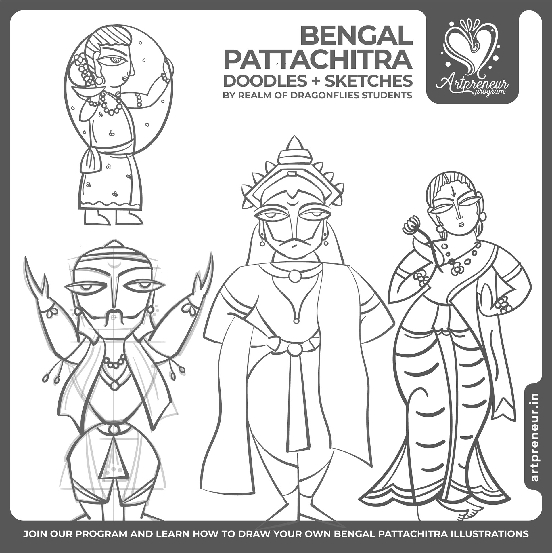 The Bengal Pattachitra Illustrations, Doodles and Sketches are done by the Realm of Dragonflies Batch students of Artpreneur Online Program. They have not had any prior experience and knowledge in illustrations or folk art forms.