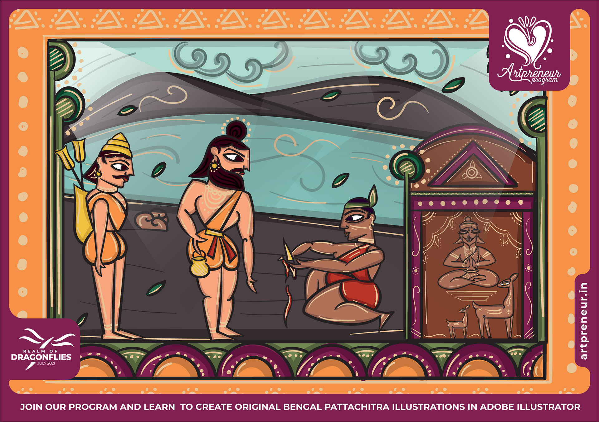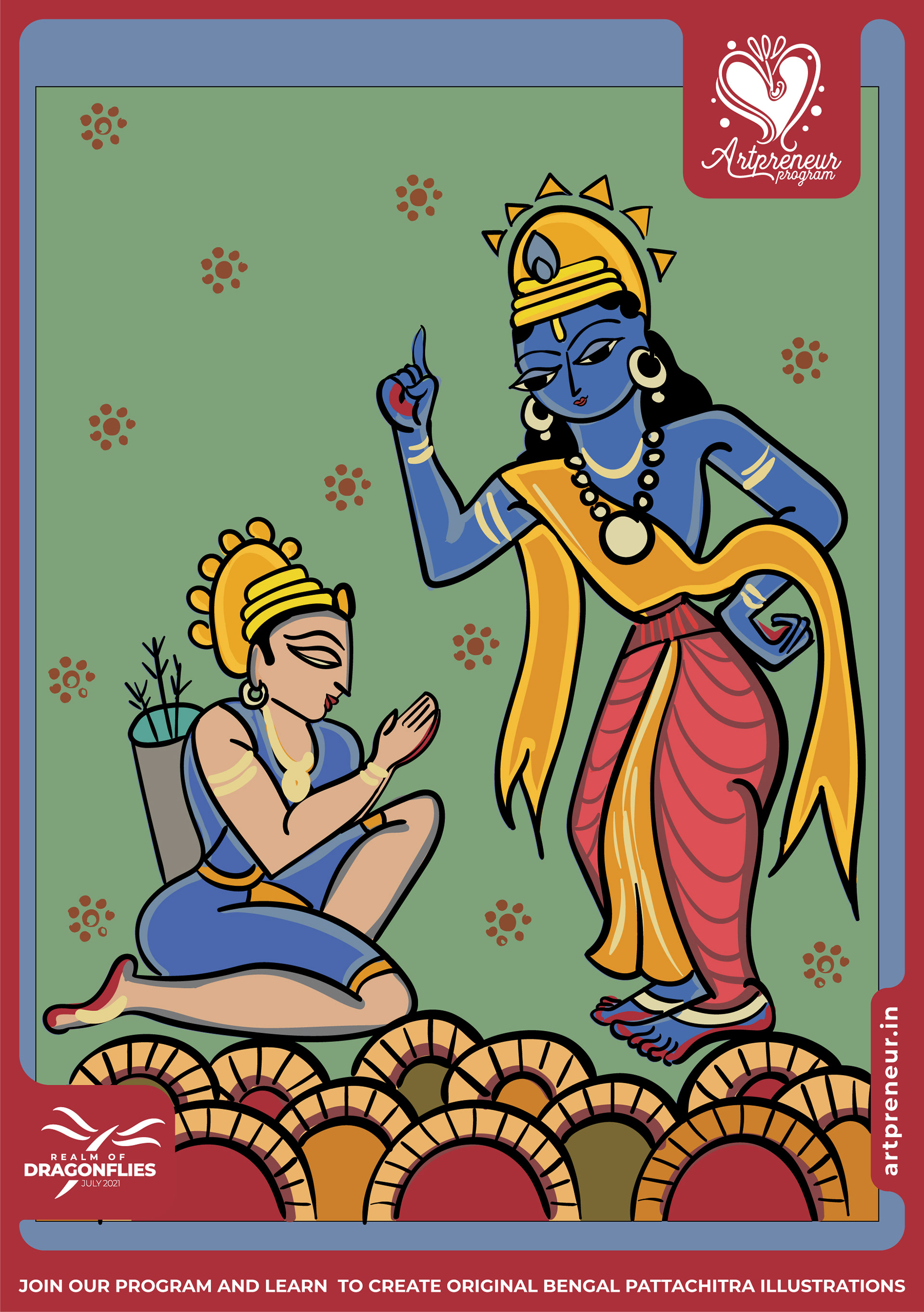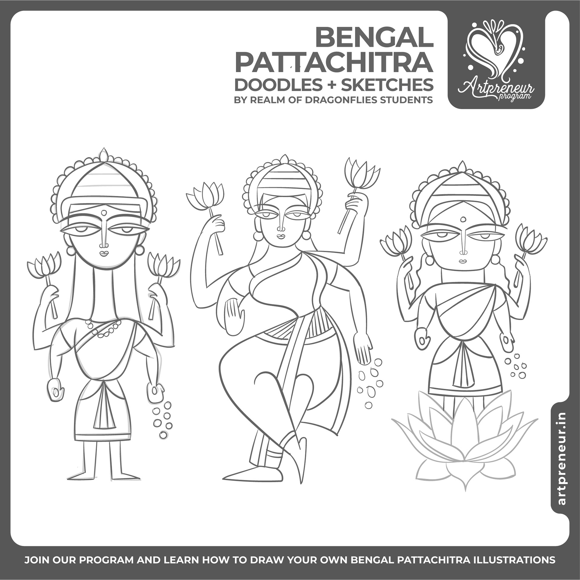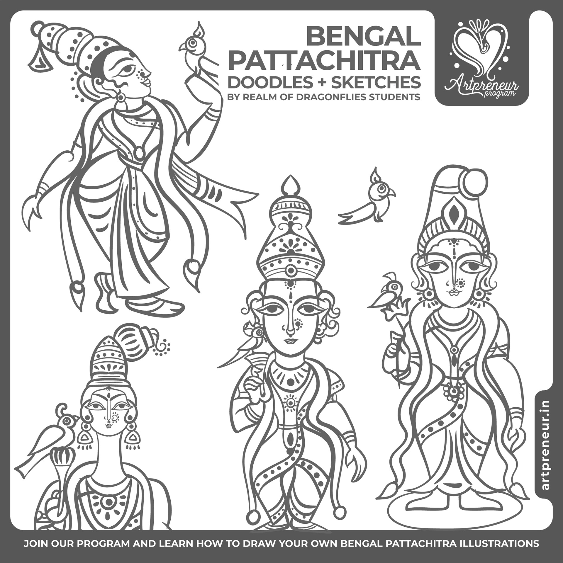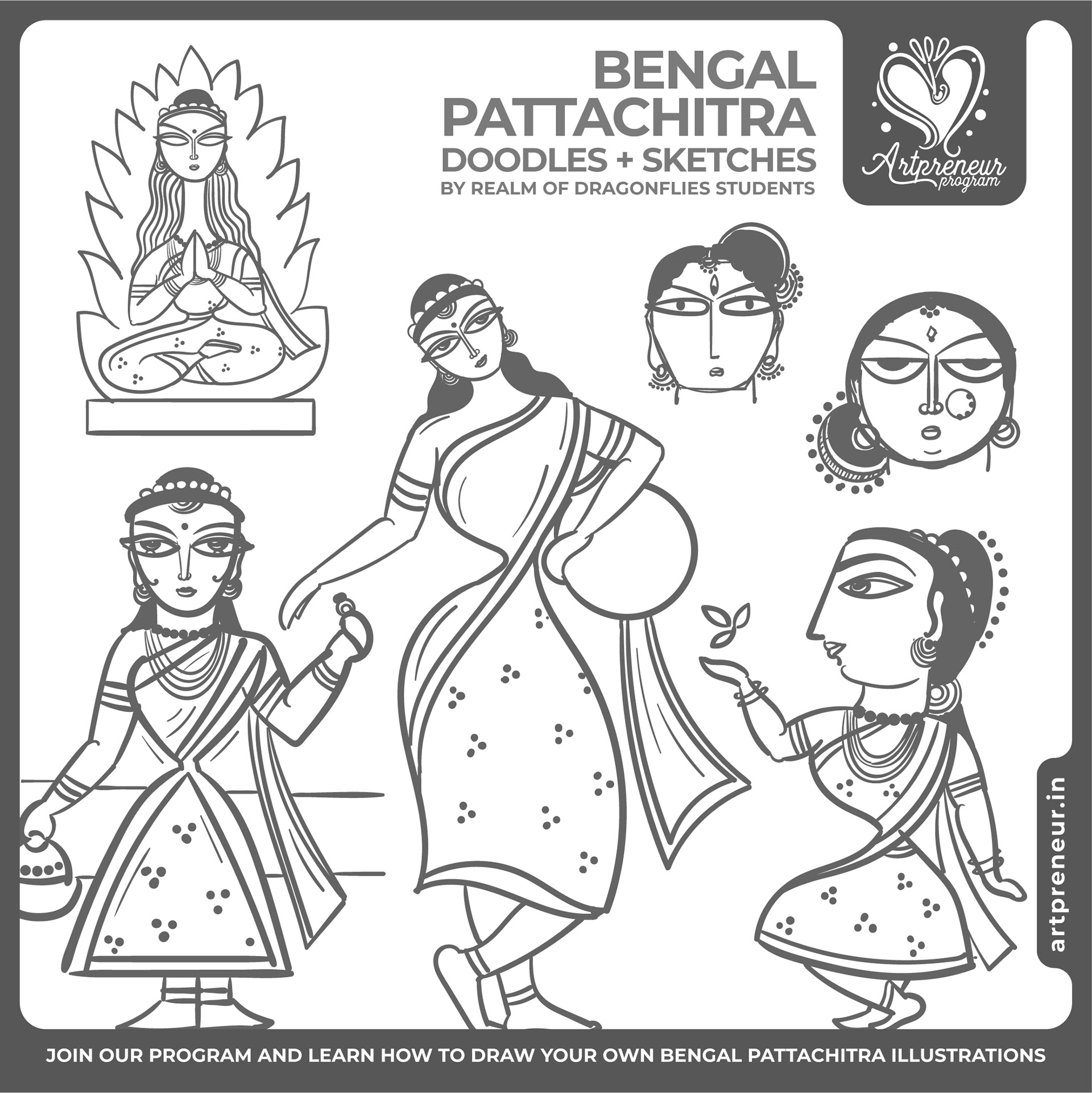 The Bengal Pattachitra Illustrations, Doodles and Sketches are done by the Realm of Dragonflies Batch students of Artpreneur Online Program. They have not had any prior experience and knowledge in illustrations or folk art forms.