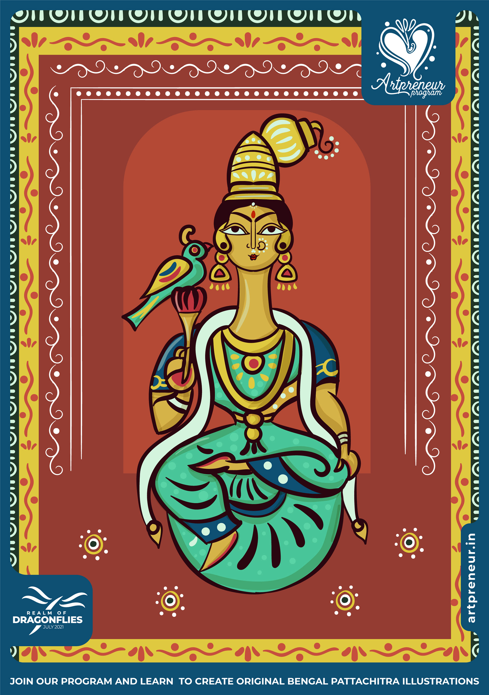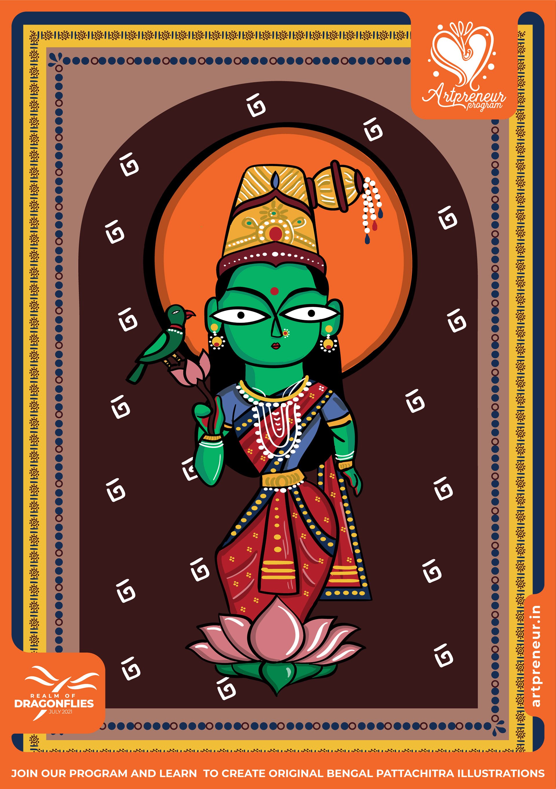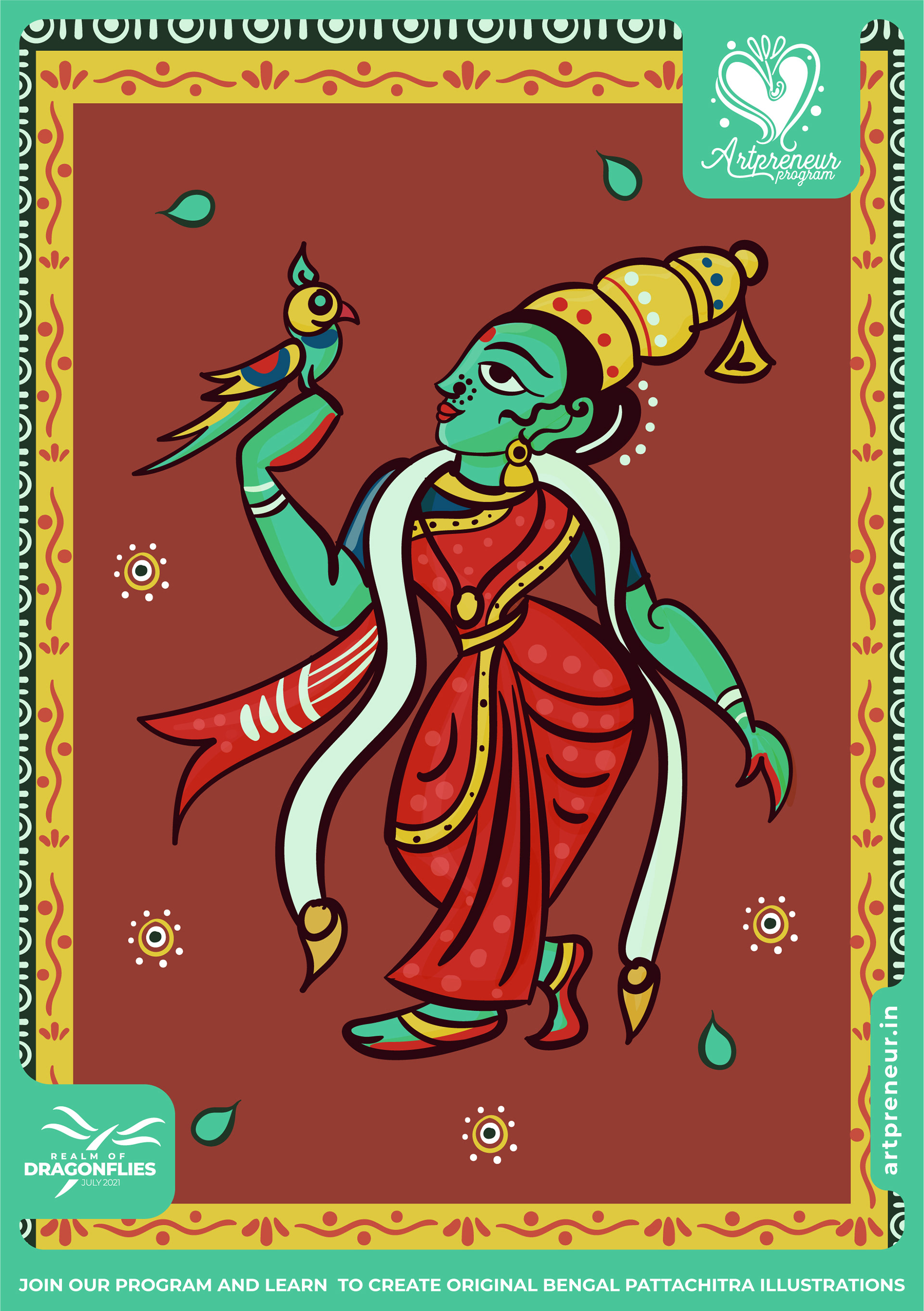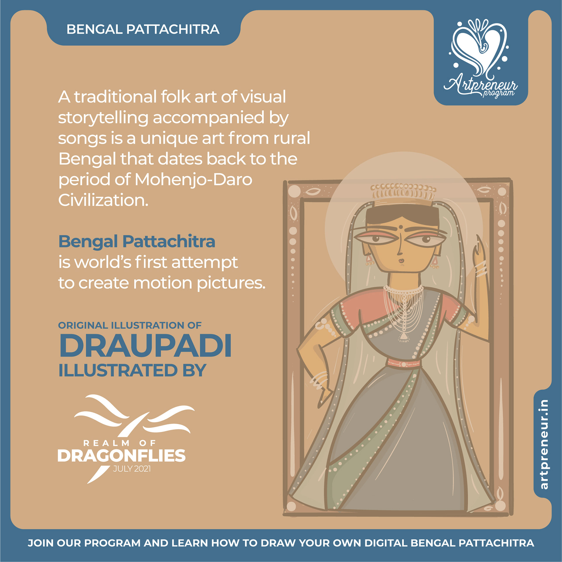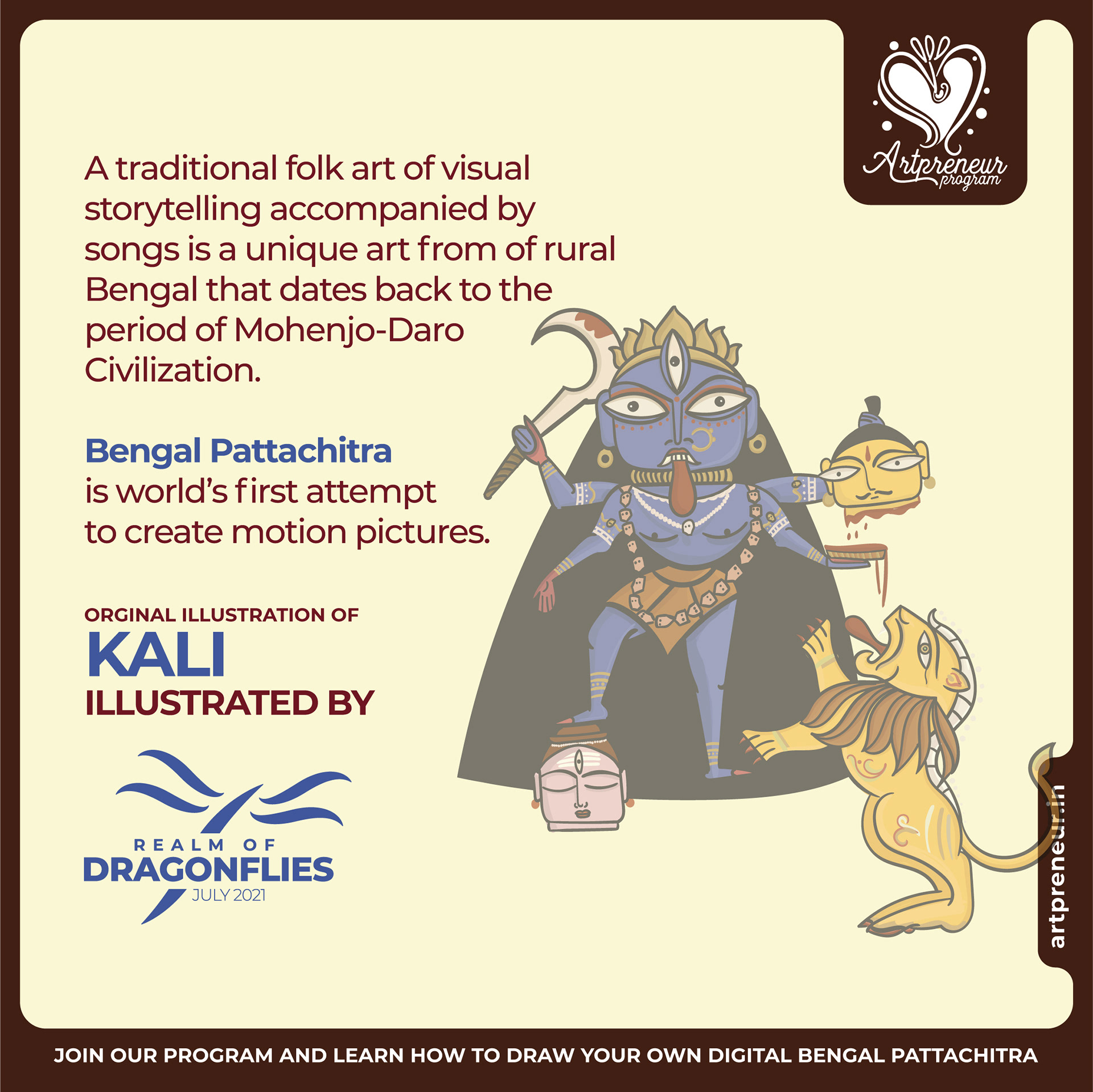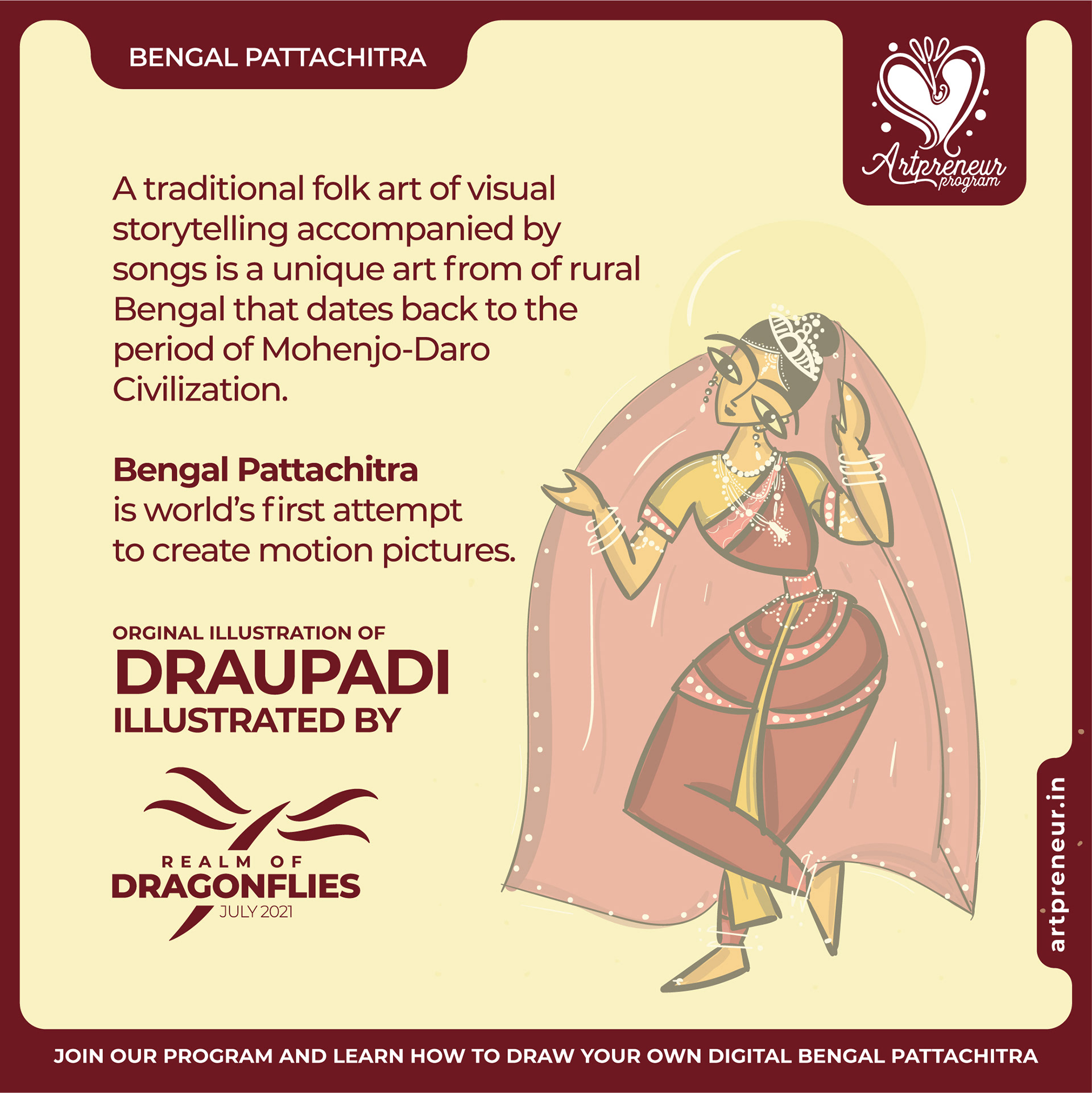 The Bengal Pattachitra Illustrations, Doodles and Sketches are done by the Realm of Dragonflies Batch students of Artpreneur Online Program. They have not had any prior experience and knowledge in illustrations or folk art forms.