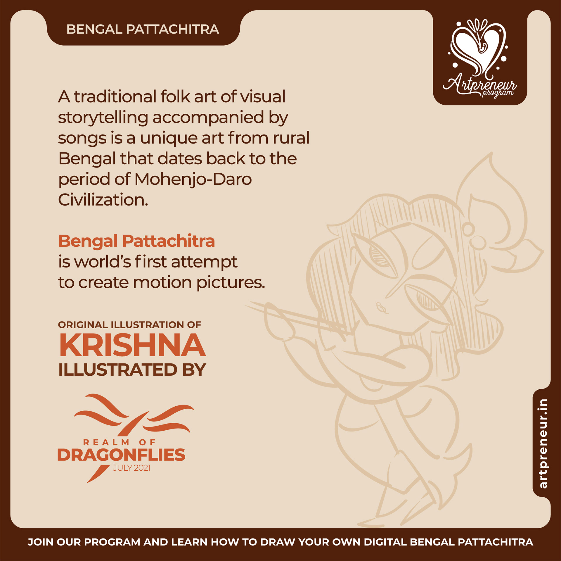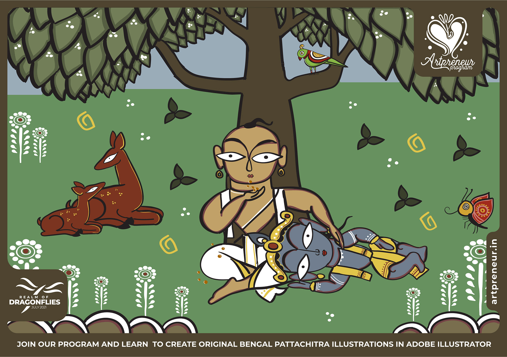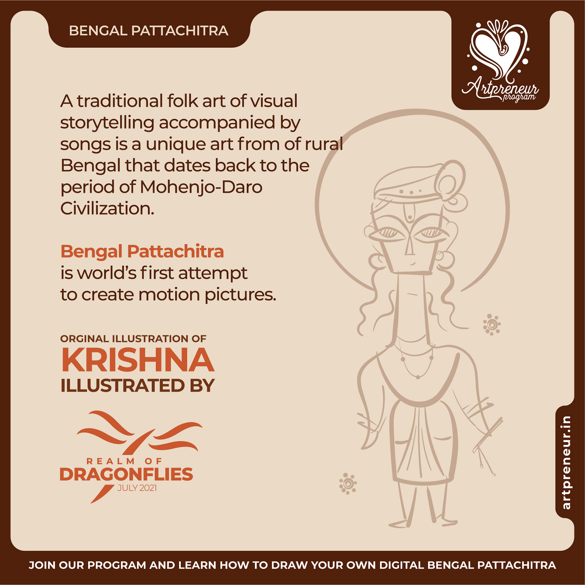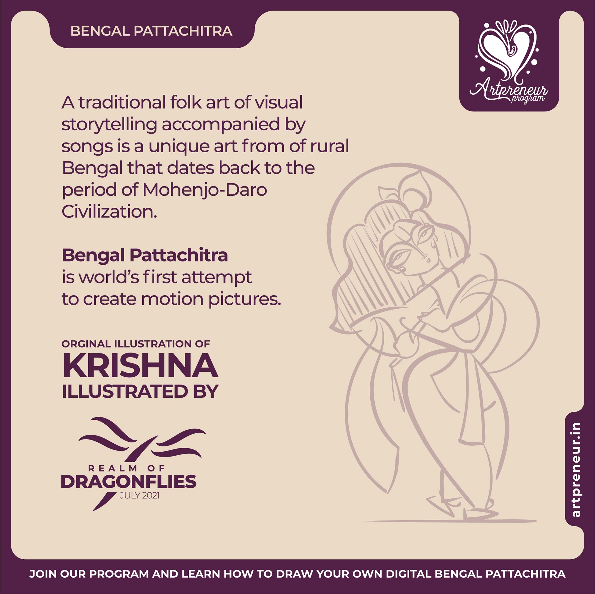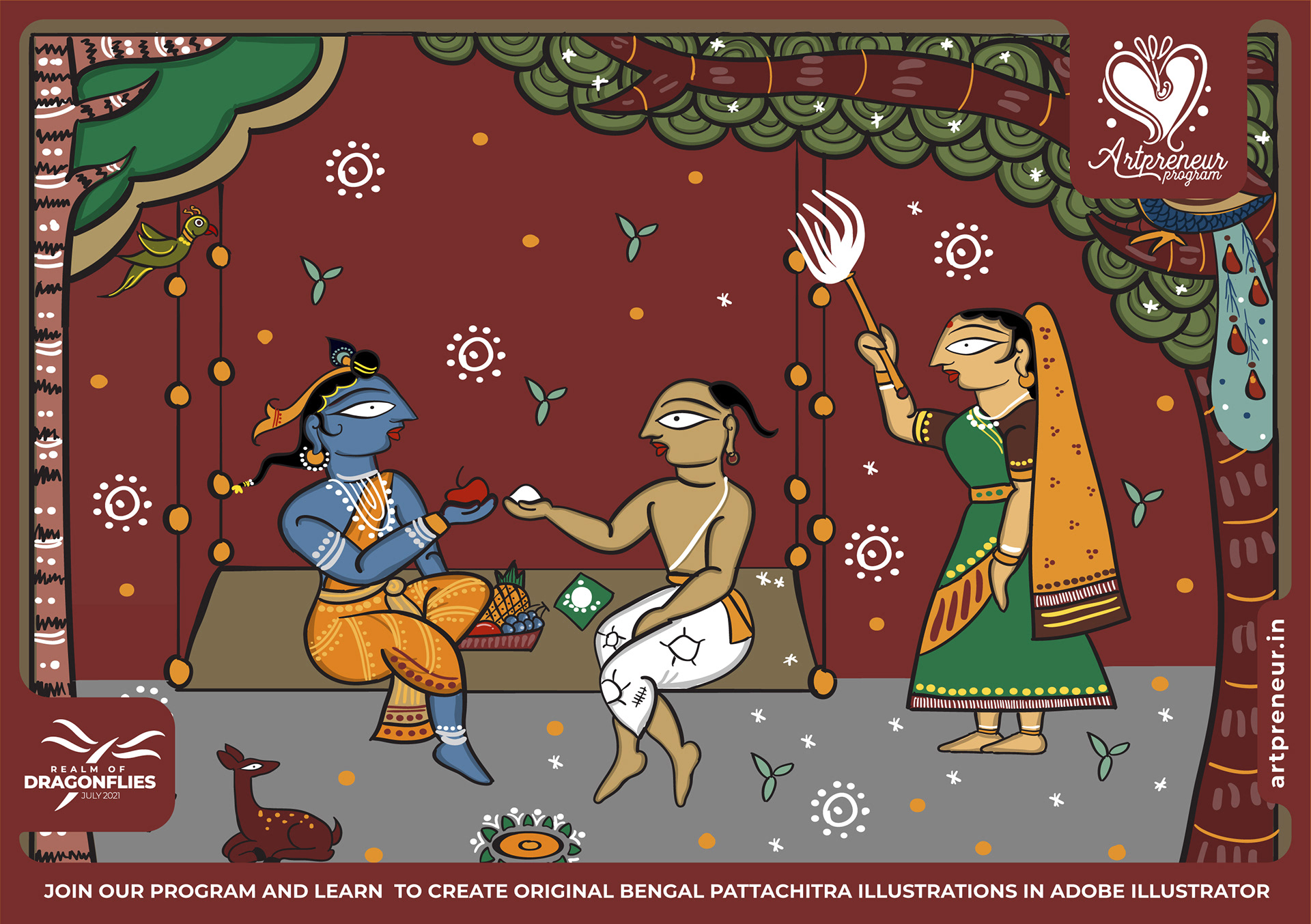 The Bengal Pattachitra Illustrations, Doodles and Sketches are done by the Realm of Dragonflies Batch students of Artpreneur Online Program. They have not had any prior experience and knowledge in illustrations or folk art forms.