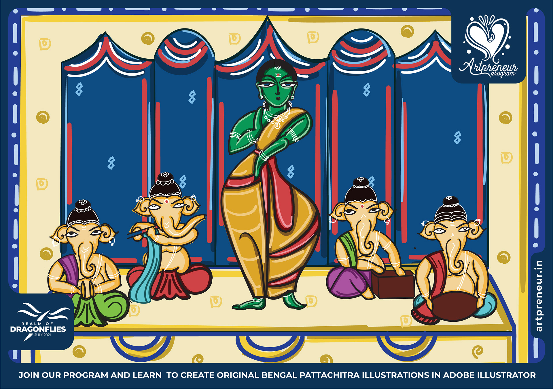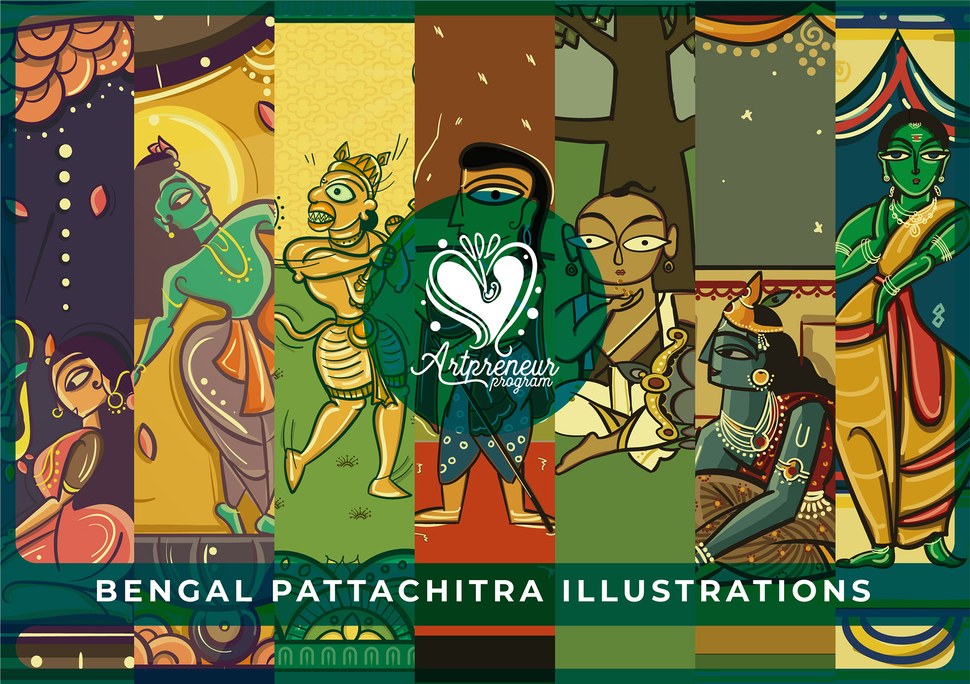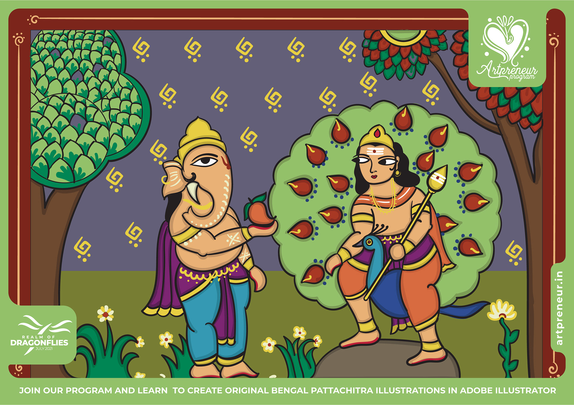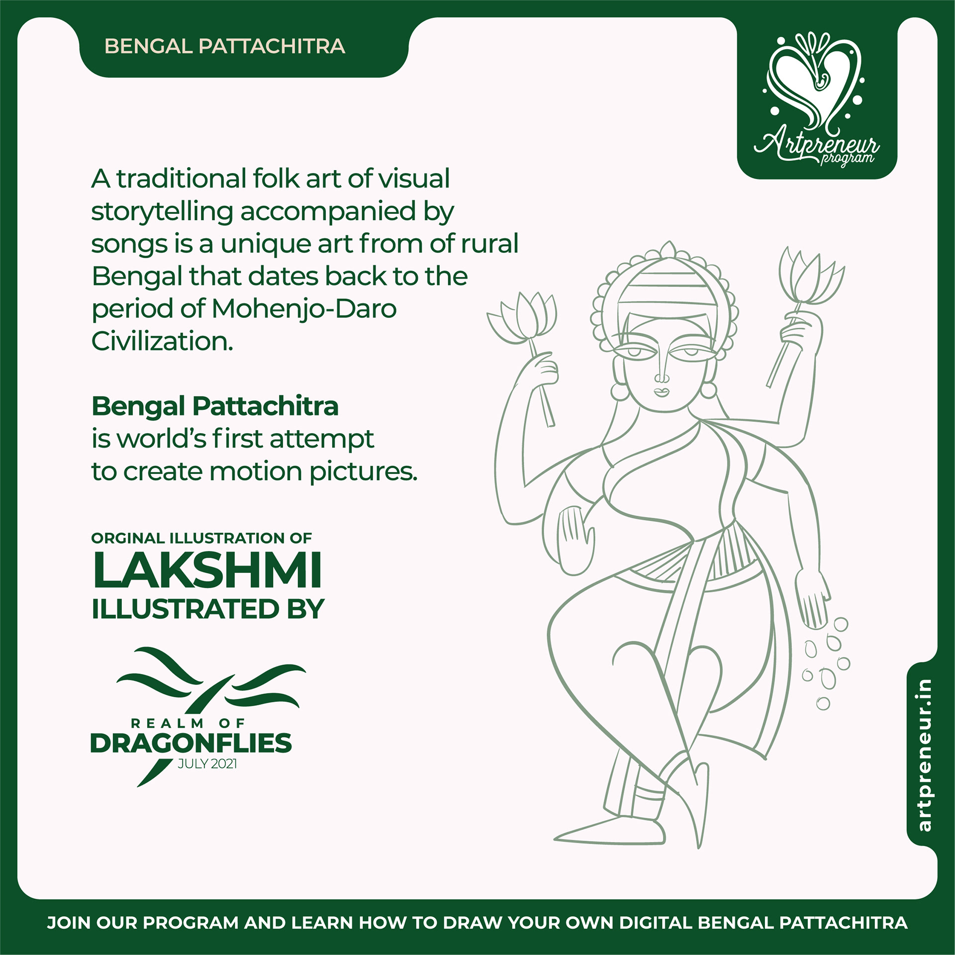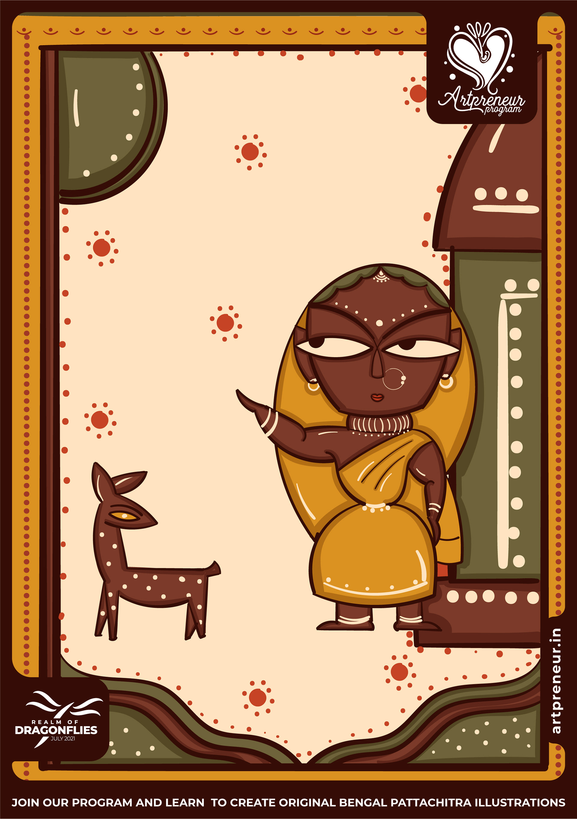 The Bengal Pattachitra Illustrations, Doodles and Sketches are done by the Realm of Dragonflies Batch students of Artpreneur Online Program. They have not had any prior experience and knowledge in illustrations or folk art forms.