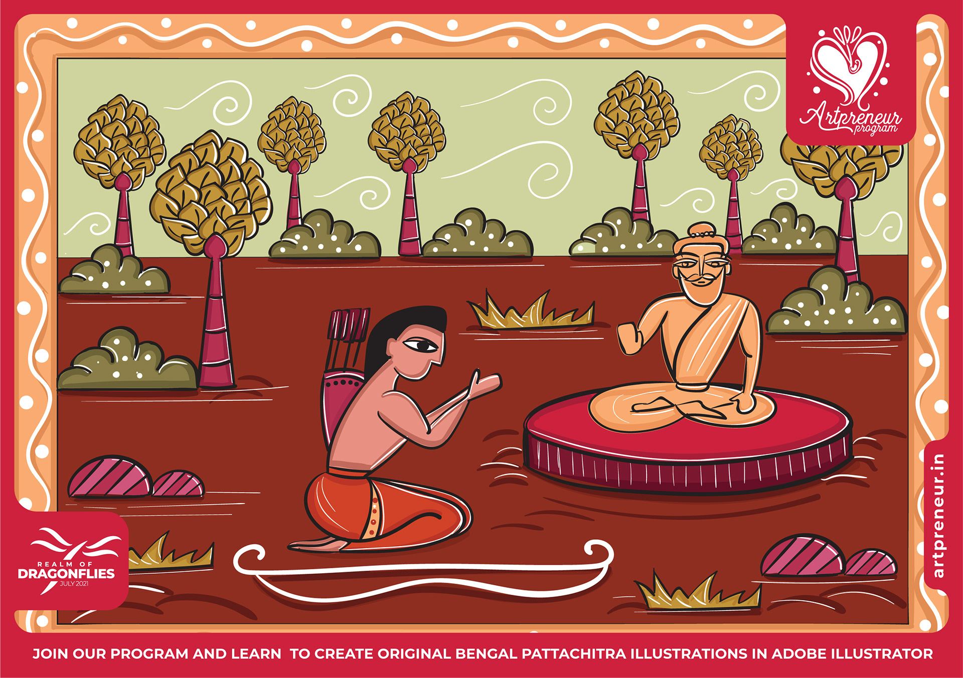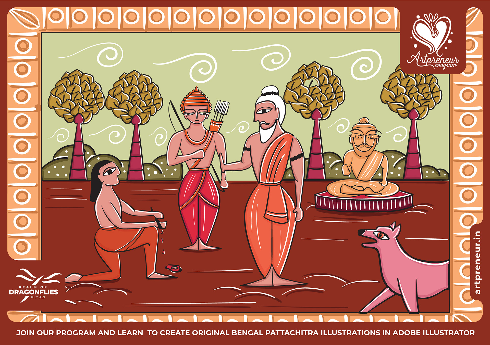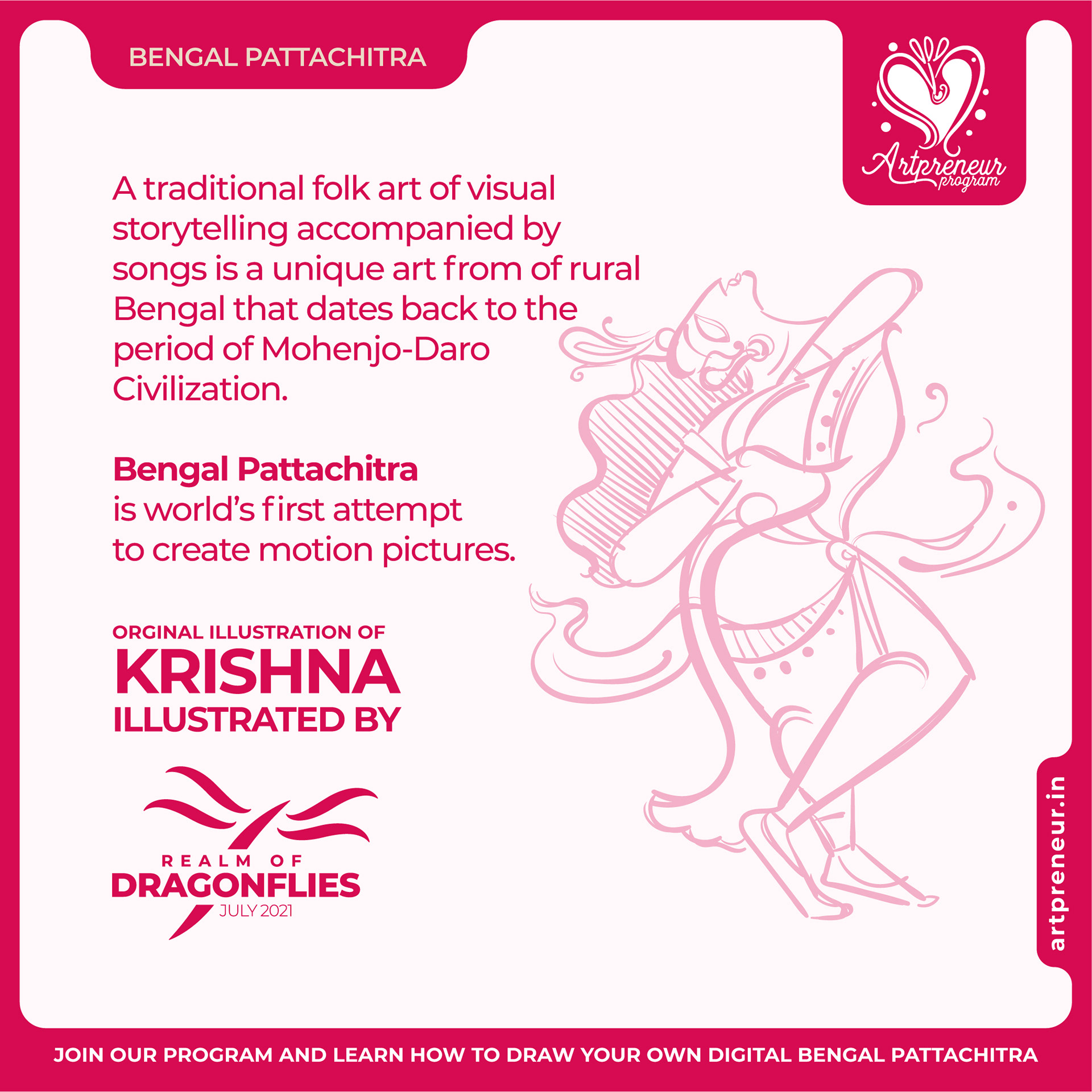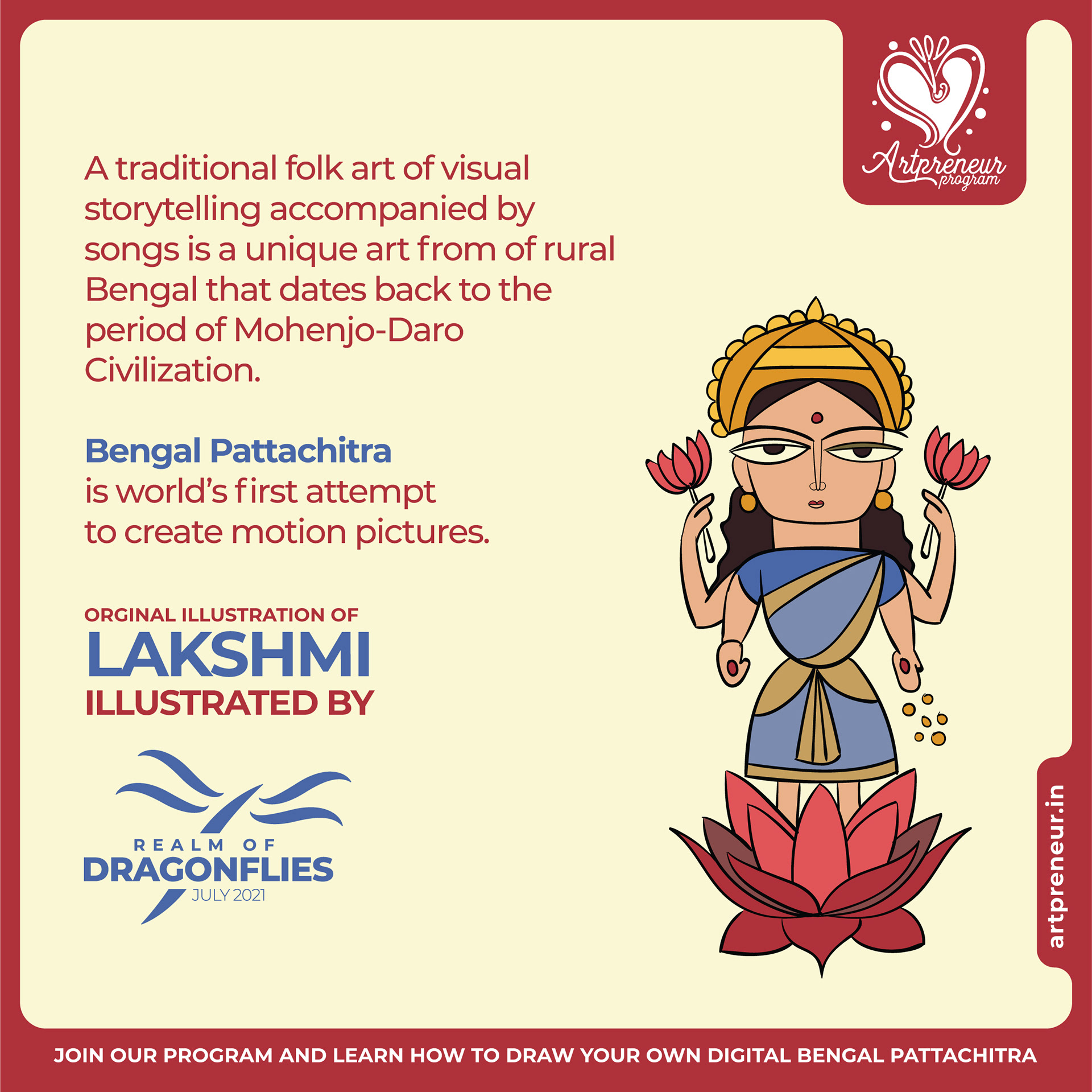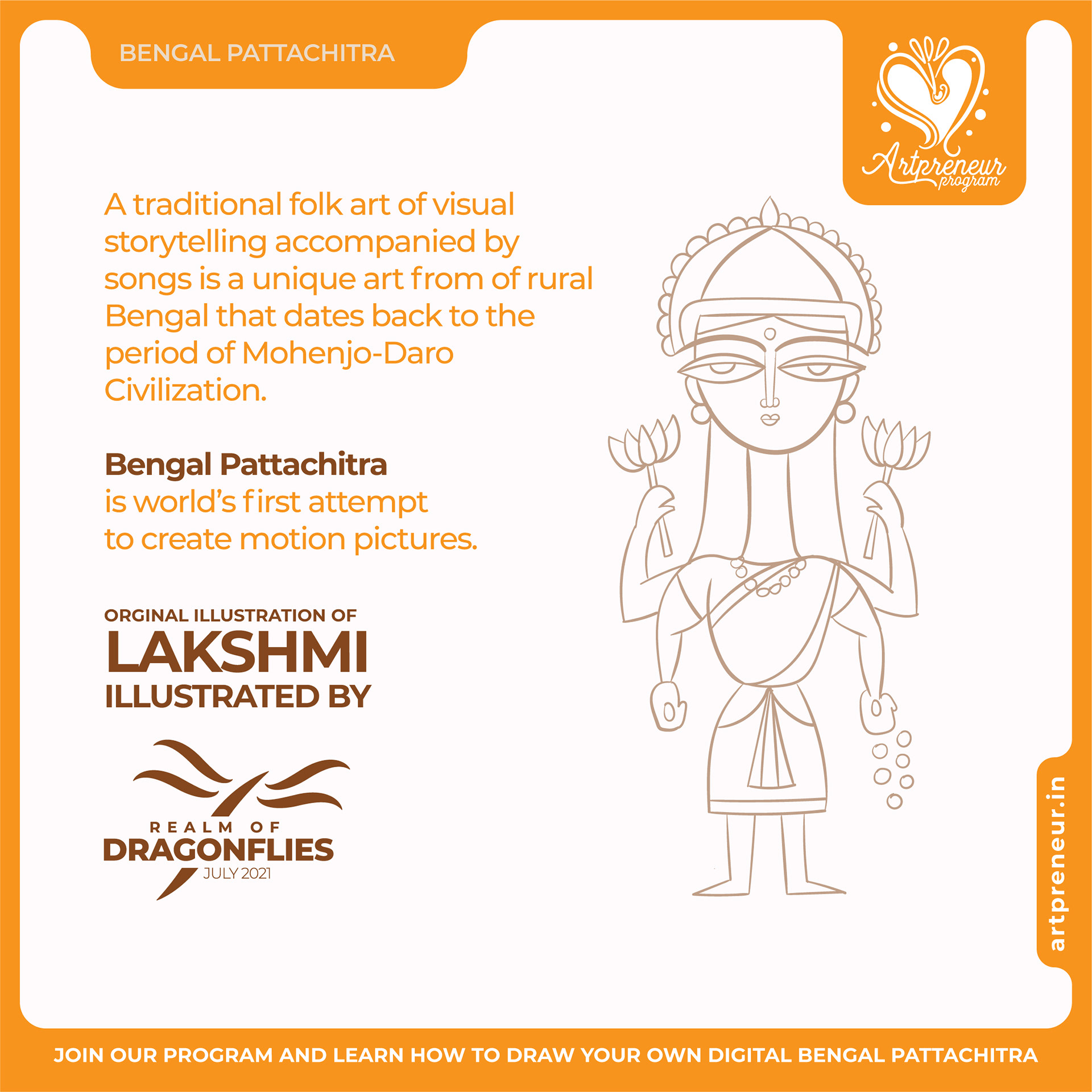 The Bengal Pattachitra Illustrations, Doodles and Sketches are done by the Realm of Dragonflies Batch students of Artpreneur Online Program. They have not had any prior experience and knowledge in illustrations or folk art forms.