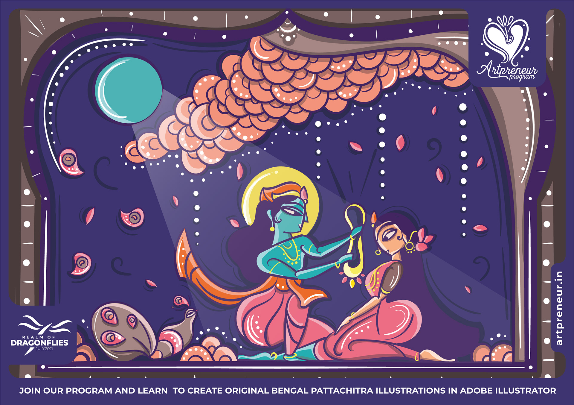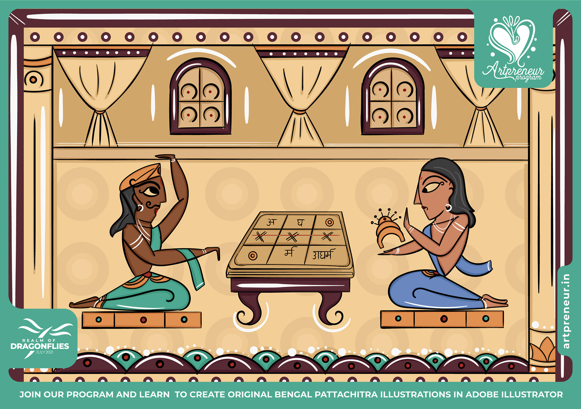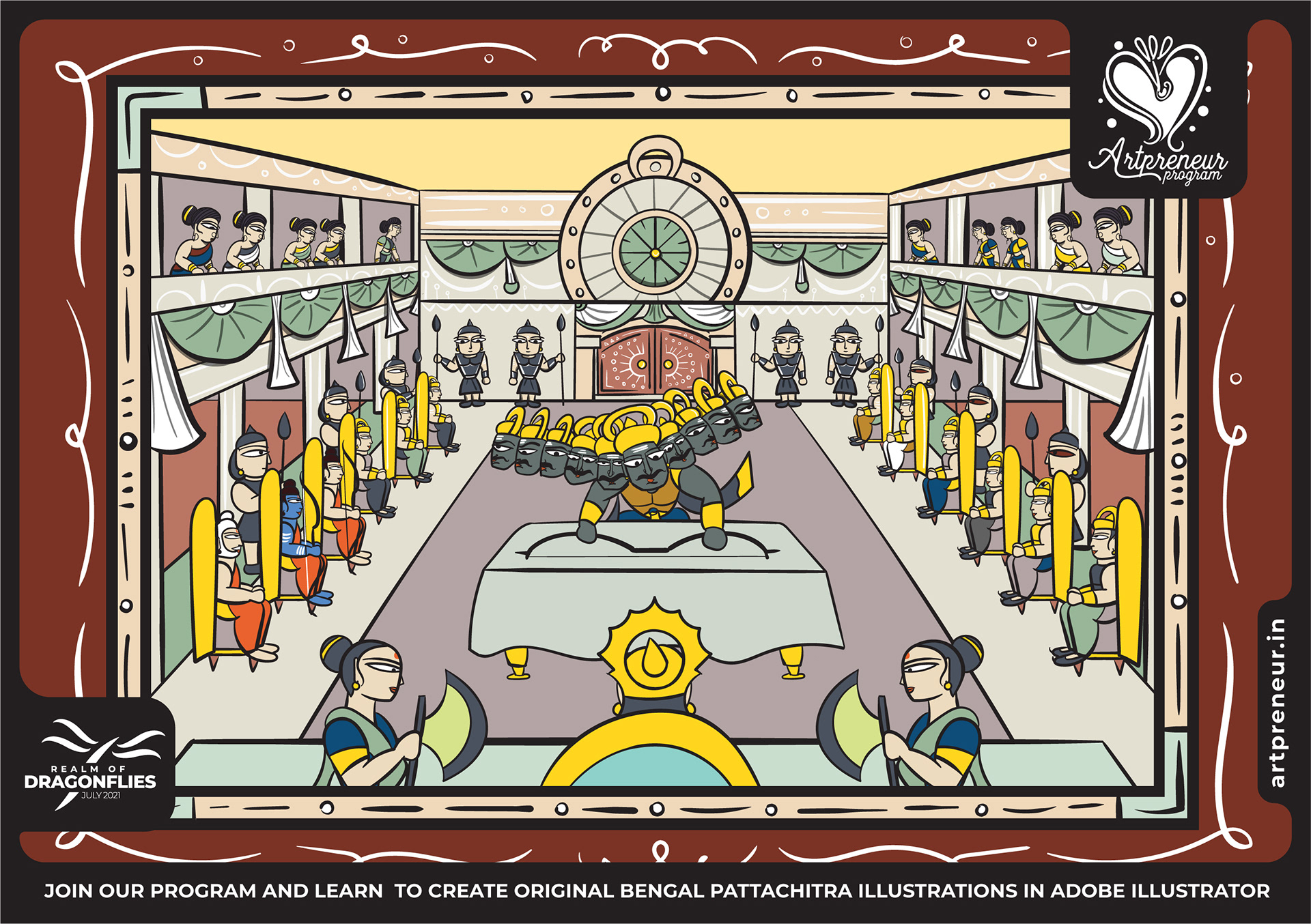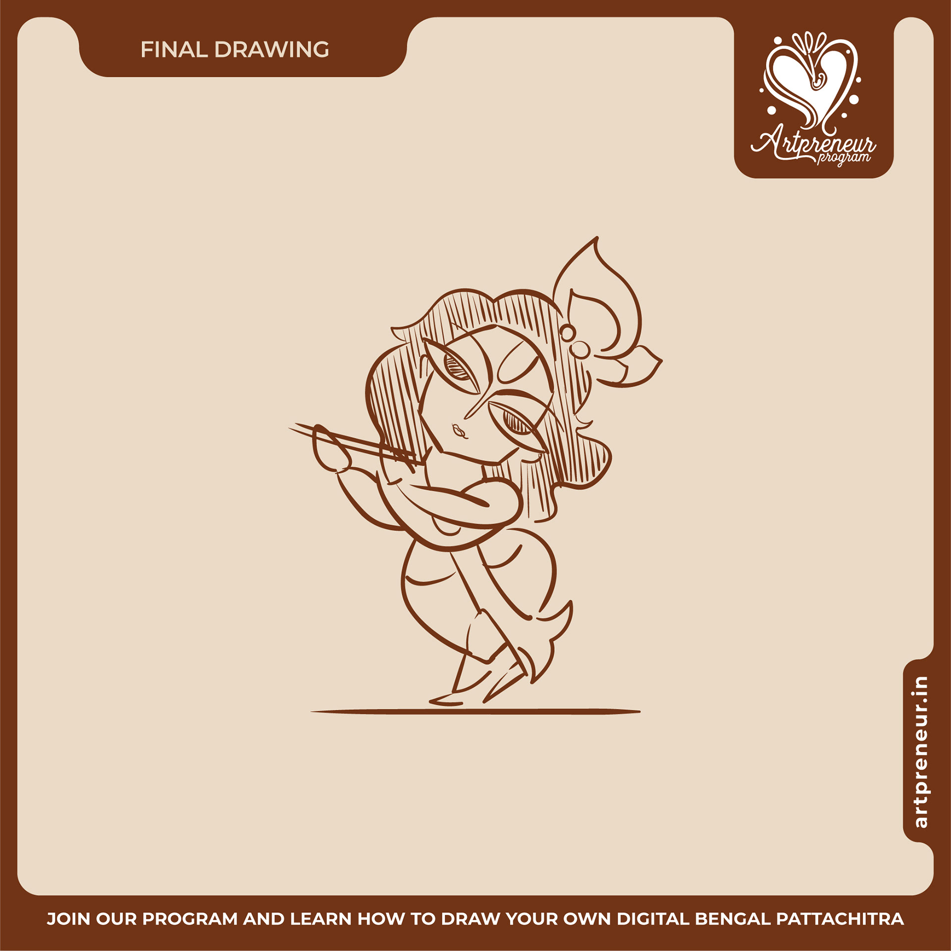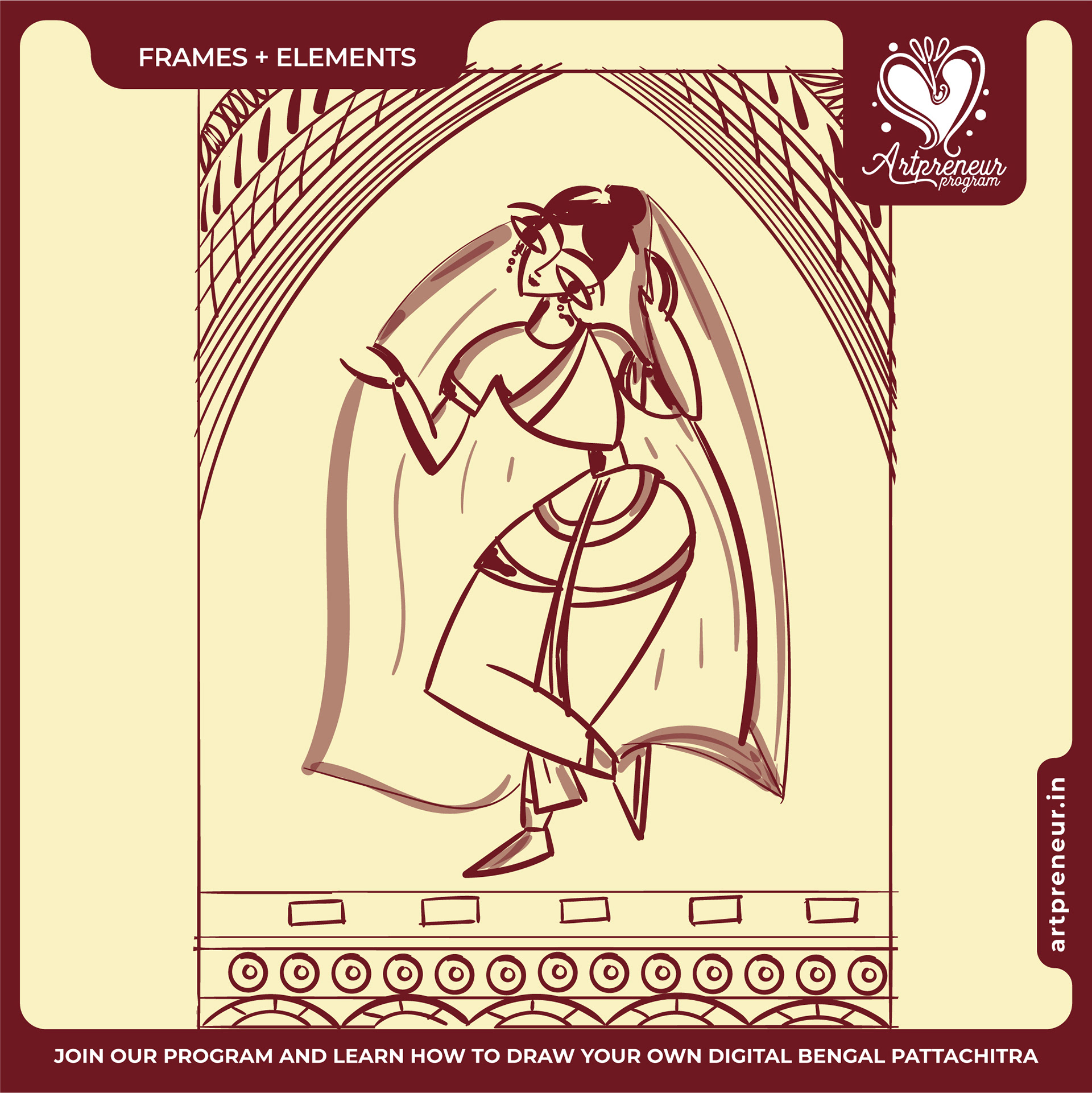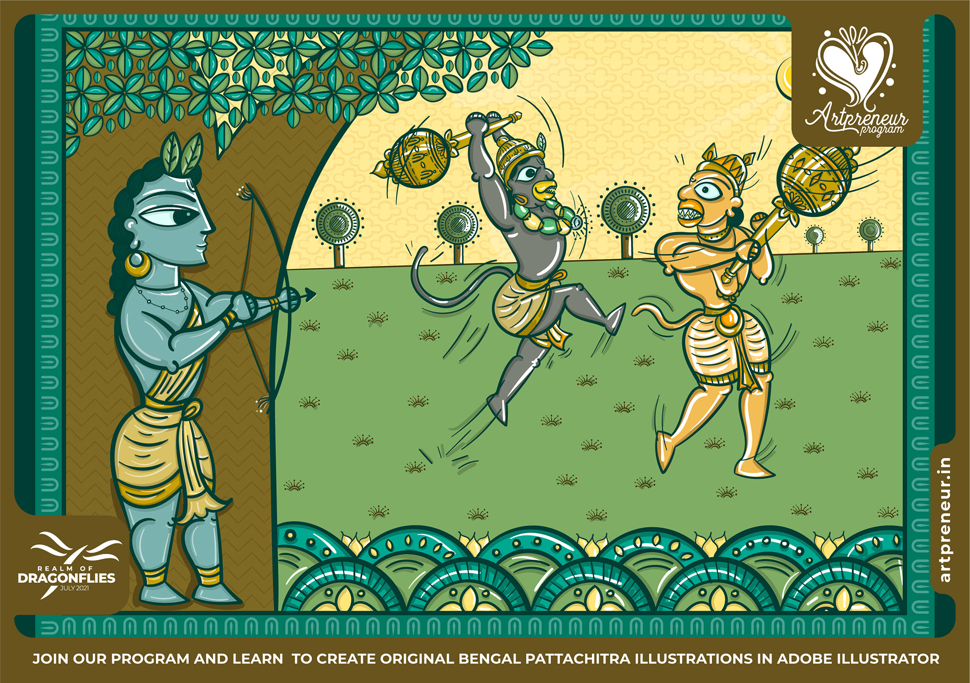 The Bengal Pattachitra Illustrations, Doodles and Sketches are done by the Realm of Dragonflies Batch students of Artpreneur Online Program. They have not had any prior experience and knowledge in illustrations or folk art forms.
