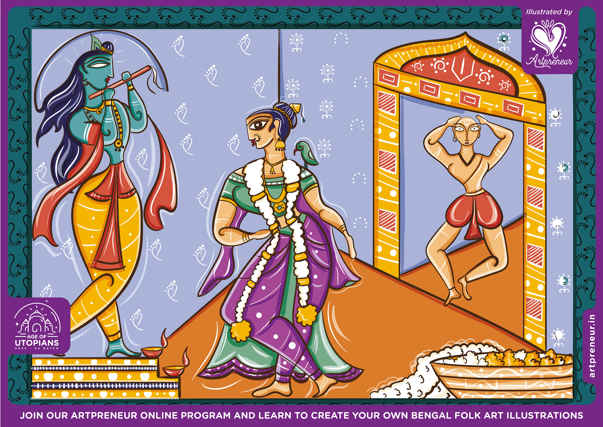 Step into the enchanting realm of Bengal Folk Art with these mesmerizing illustrations, a modern interpretation of the Bengal Pattachitra Art form from West Bengal. These stunning pieces have been created by the Age of Utopians Batch Students for the year 2023-24, who had no prior experience or knowledge in creating their own illustrations in Indian folk art forms.