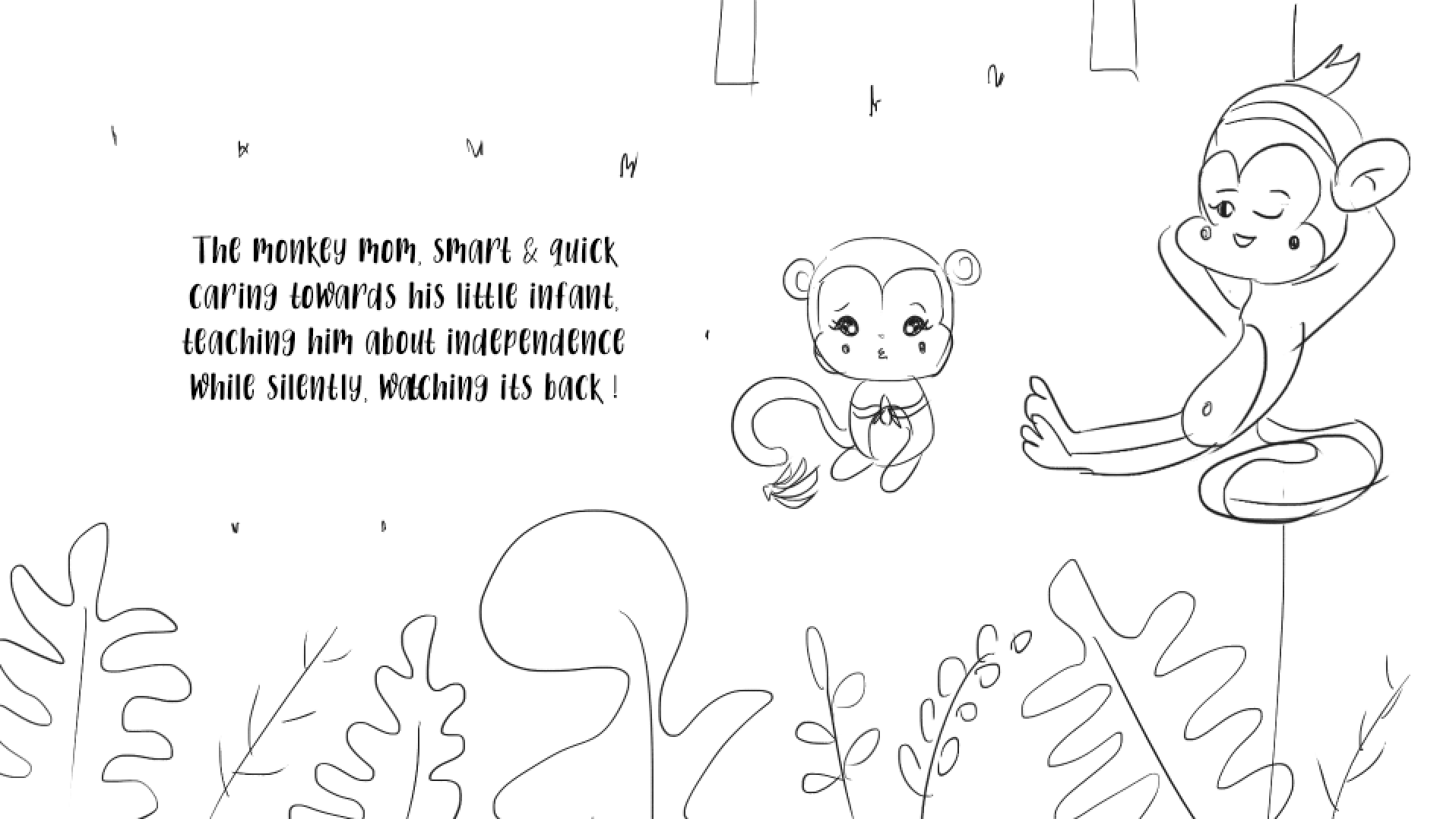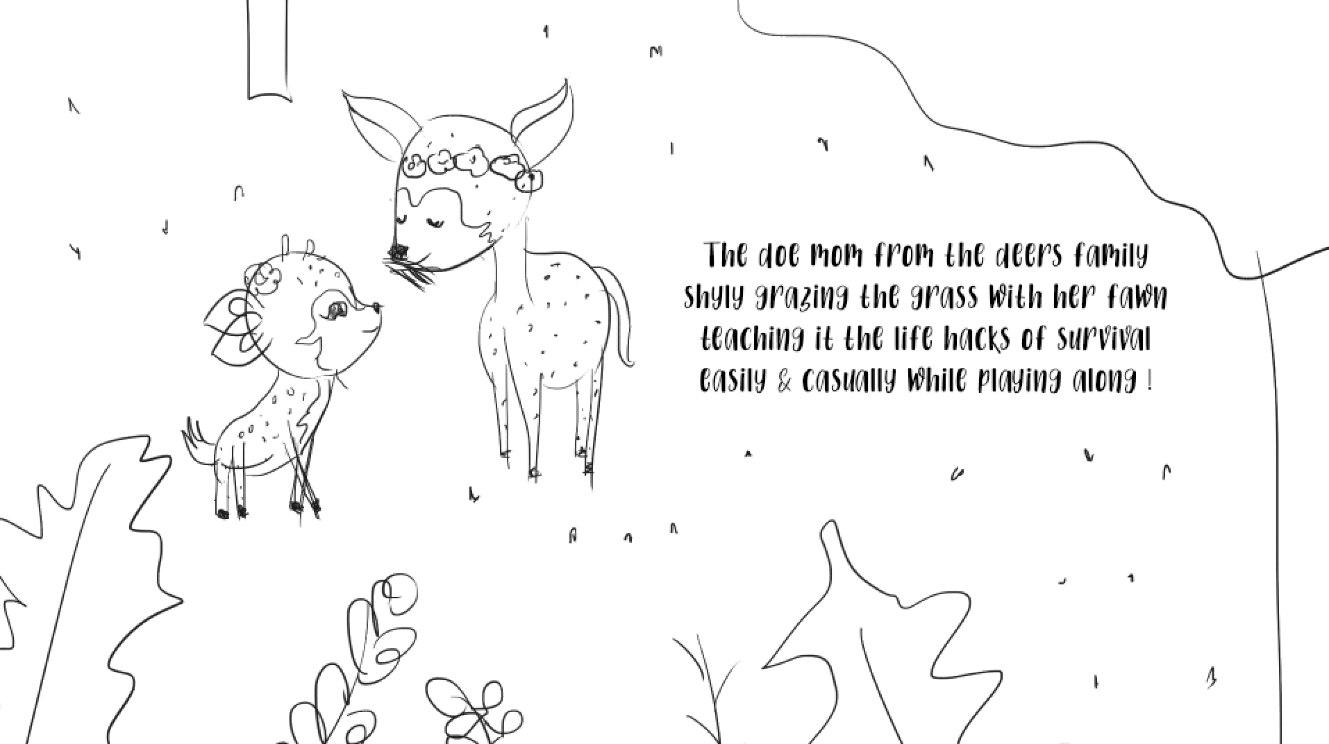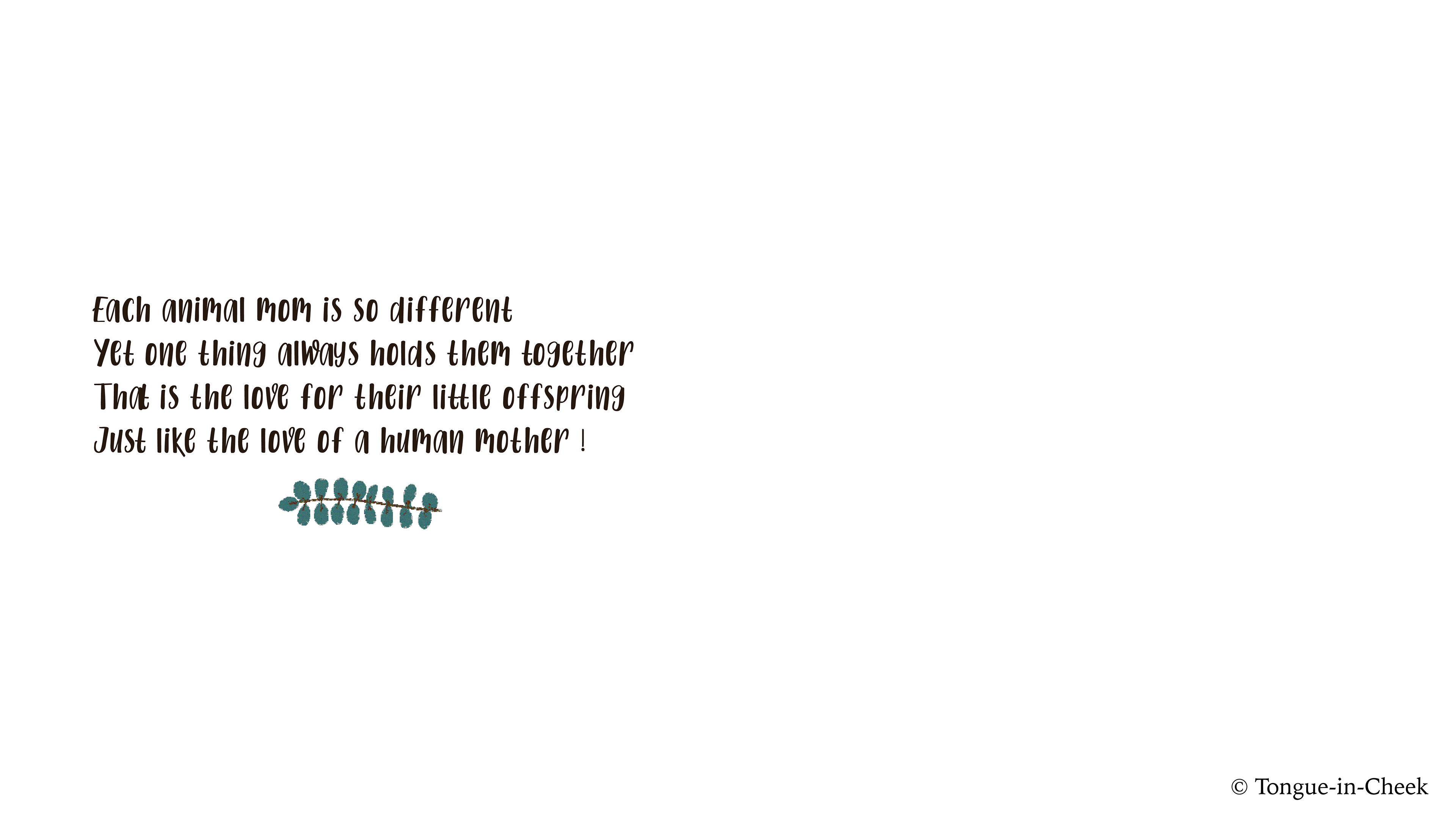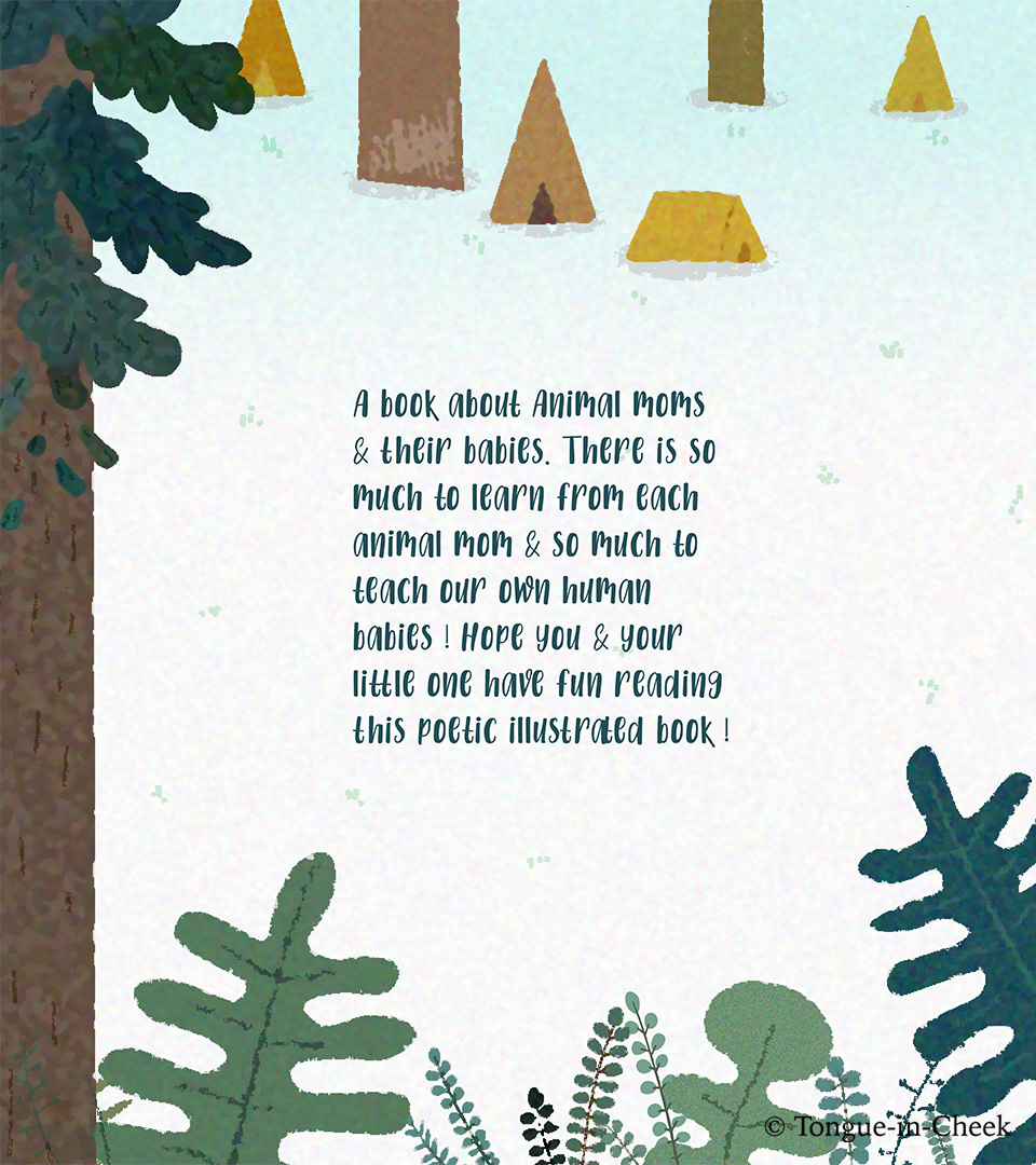 A simple & understandable Poem + Illustrations book for kids. We get to see 12 pairs of animal moms & their babies, where each mom teaches her baby a particular life skill. Through this book, I hope the mom & the kid can connect on a different level, while learning the qualities & names of each animal baby !