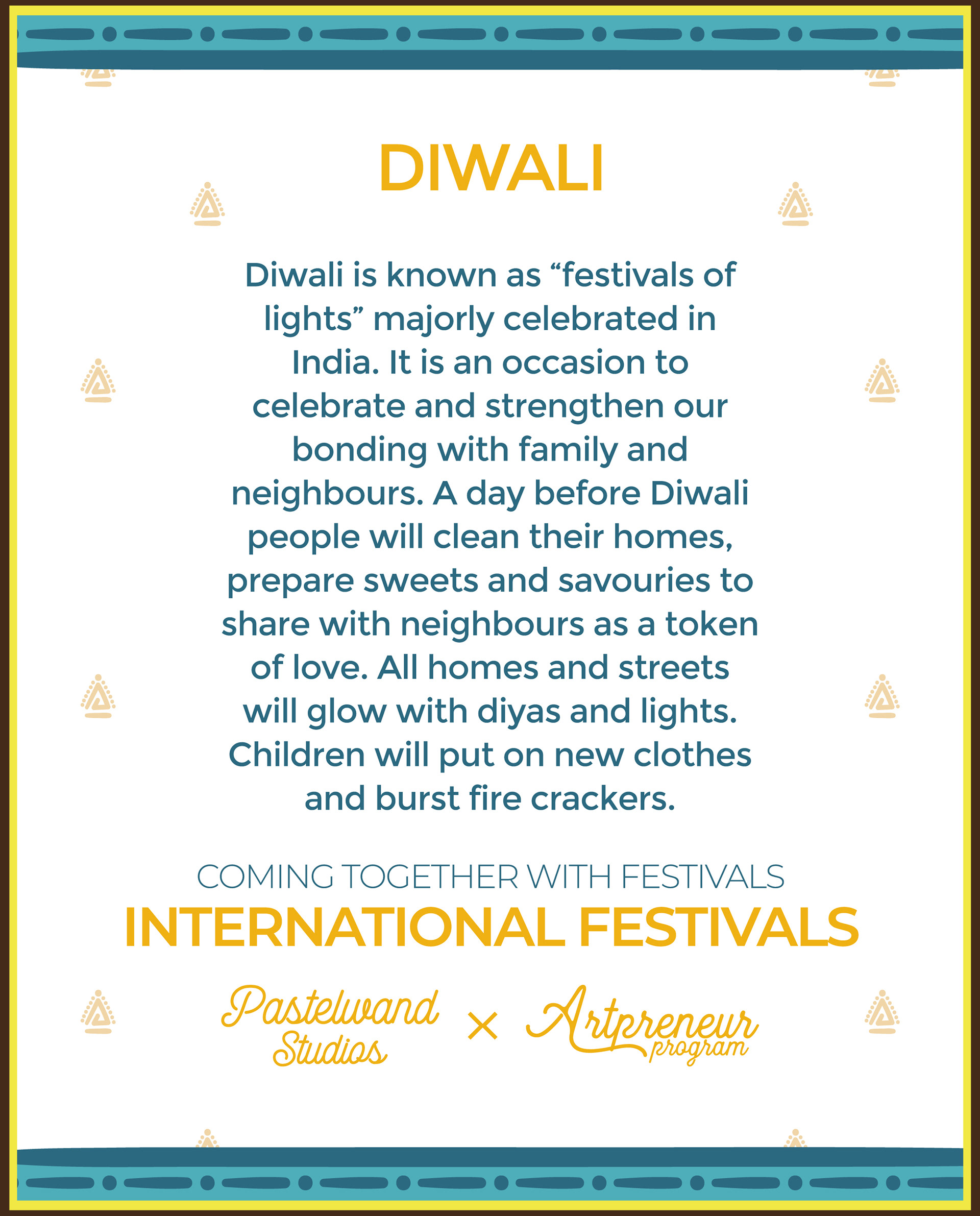 Diwali is known as “festivals of lights” majorly celebrated in India. It is an occasion to celebrate and strengthen our bonding with family and neighbours. A day before Diwali people will clean their homes, prepare sweets and savouries to share with neighbours as a token of love. All homes and streets will glow with diyas and lights. Children will put on new clothes and burst fire crackers.