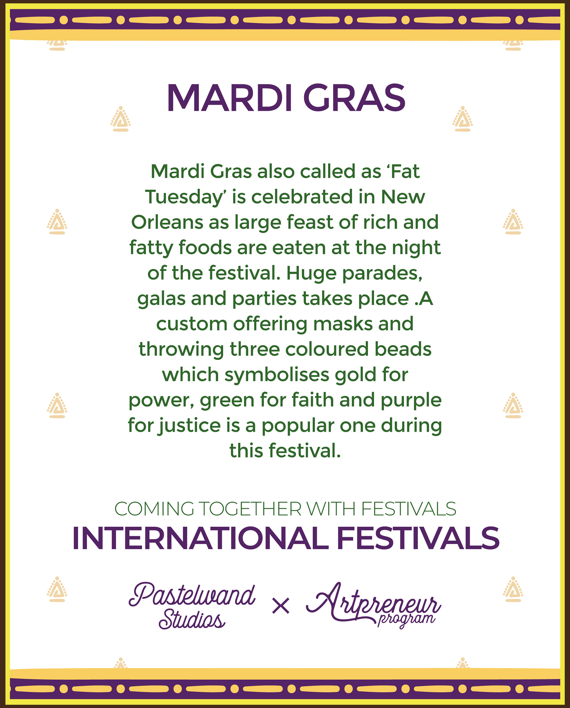 Mardi Gras also called as ‘Fat Tuesday’ is celebrated in New Orleans as large feast of rich and fatty foods are eaten at the night of the festival. Huge parades, galas and parties takes place .A custom offering masks and throwing three coloured beads which symbolises gold for power, green for faith and purple for justice is a popular one during this festival.