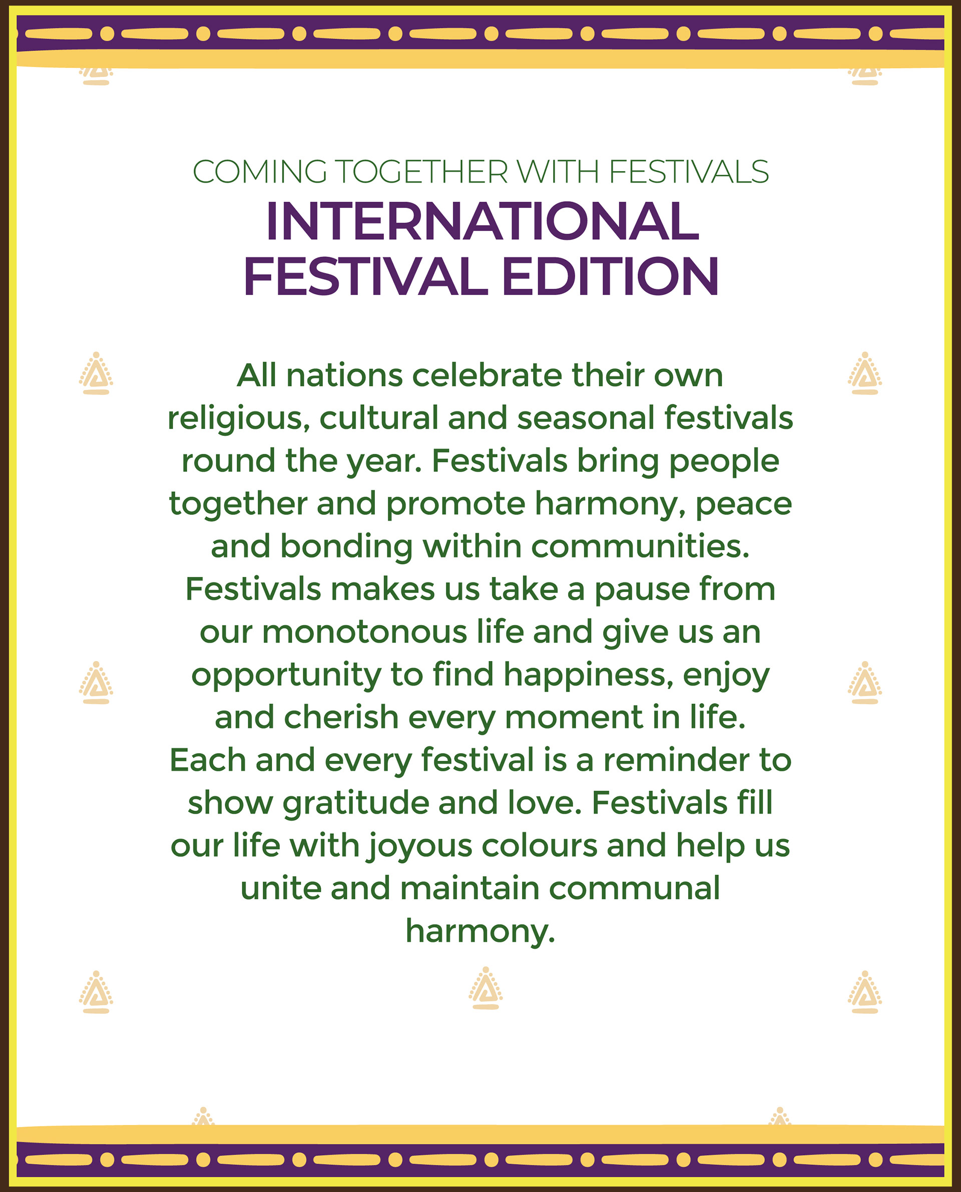 All nations celebrate their own religious, cultural and seasonal festivals round the year. Festivals bring people together and promote harmony, peace and bonding within communities.