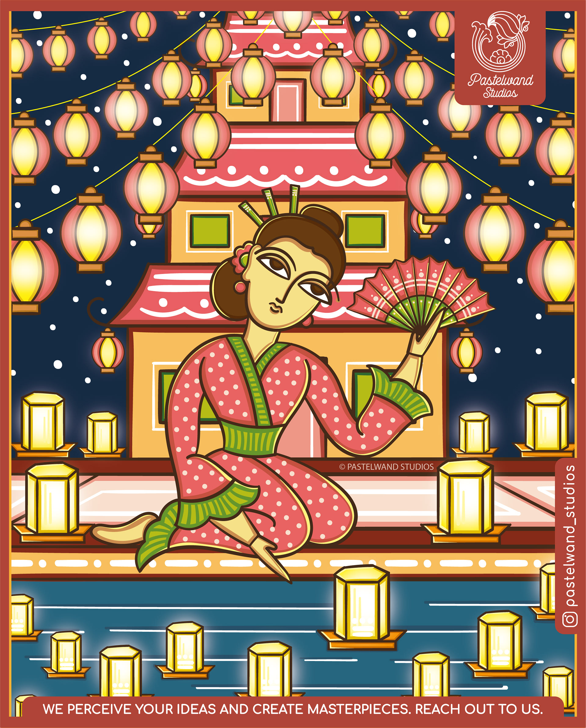 Obon is a beautiful festival celebrated in Japan to pay homage and honour to the ancestors.During Obon, it is believed that their ancestors spirit will return to this world to visit their family. A custom is followed, lighted lanterns a kept in front of the homes to guide the spirits and at the end day the lanterns are made to float on the rivers to guide them to return to their world in peace.