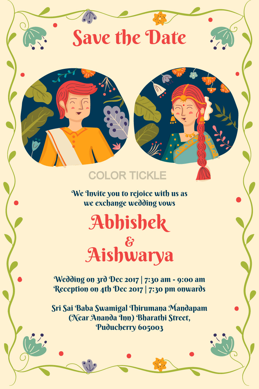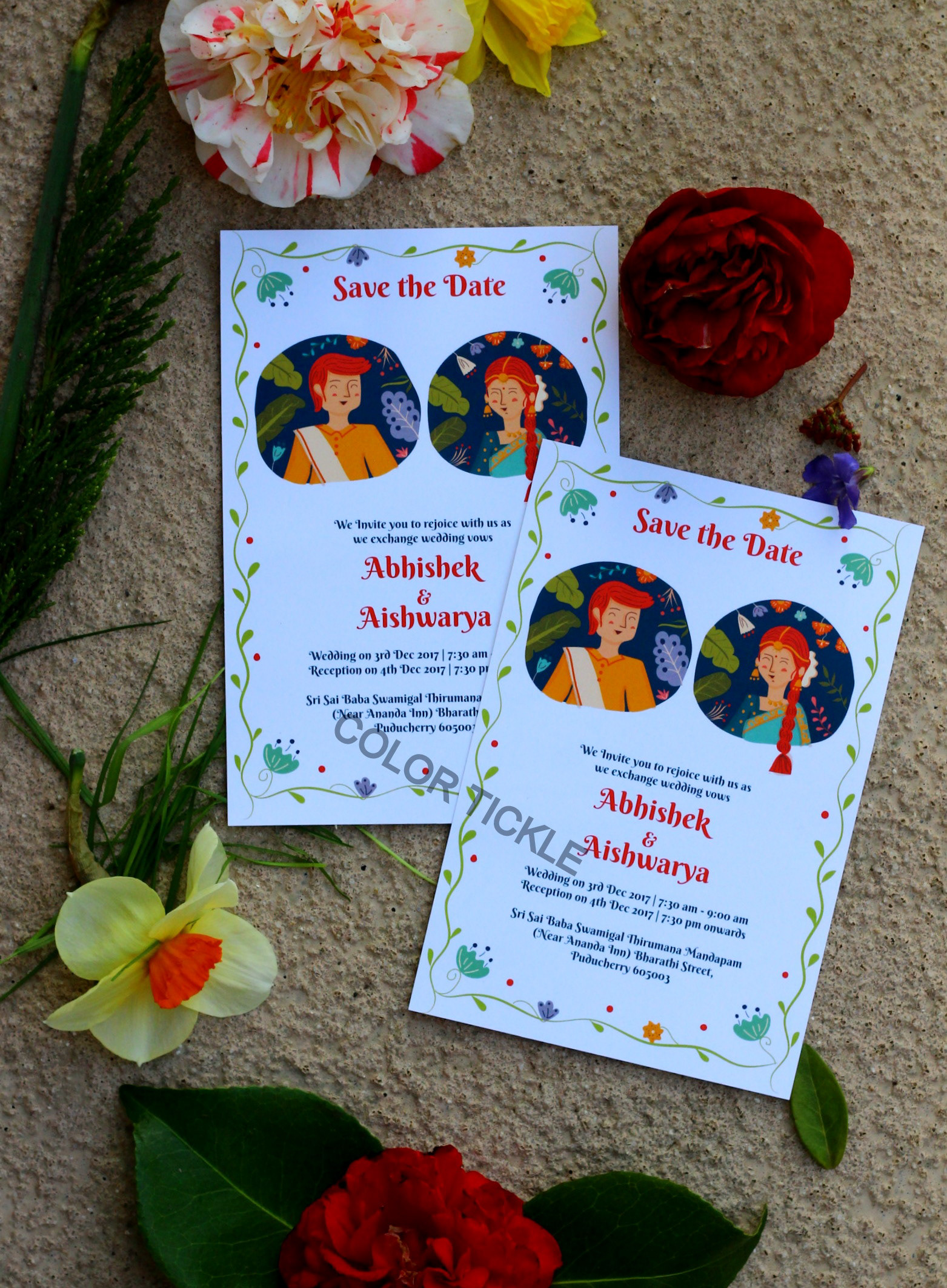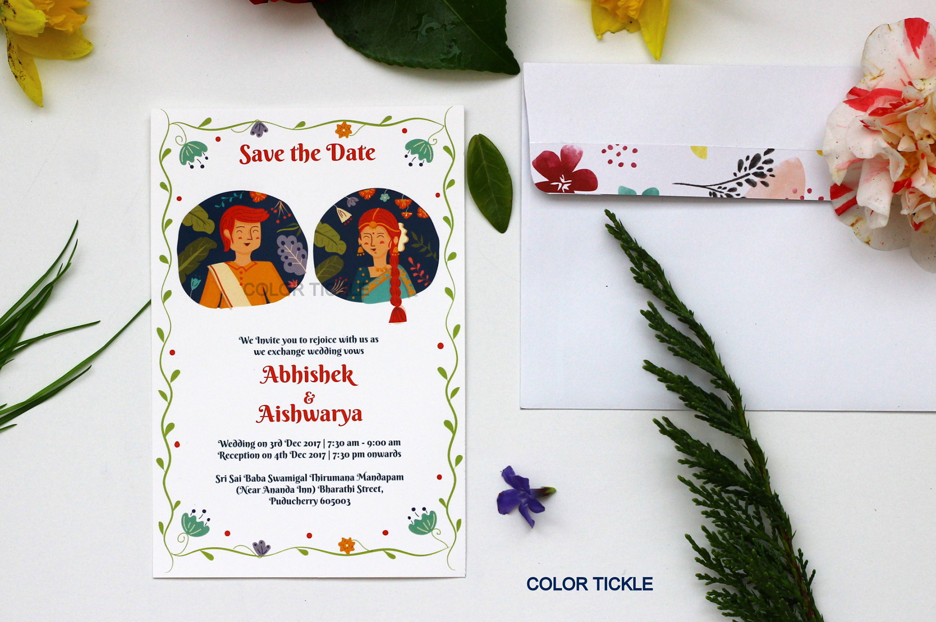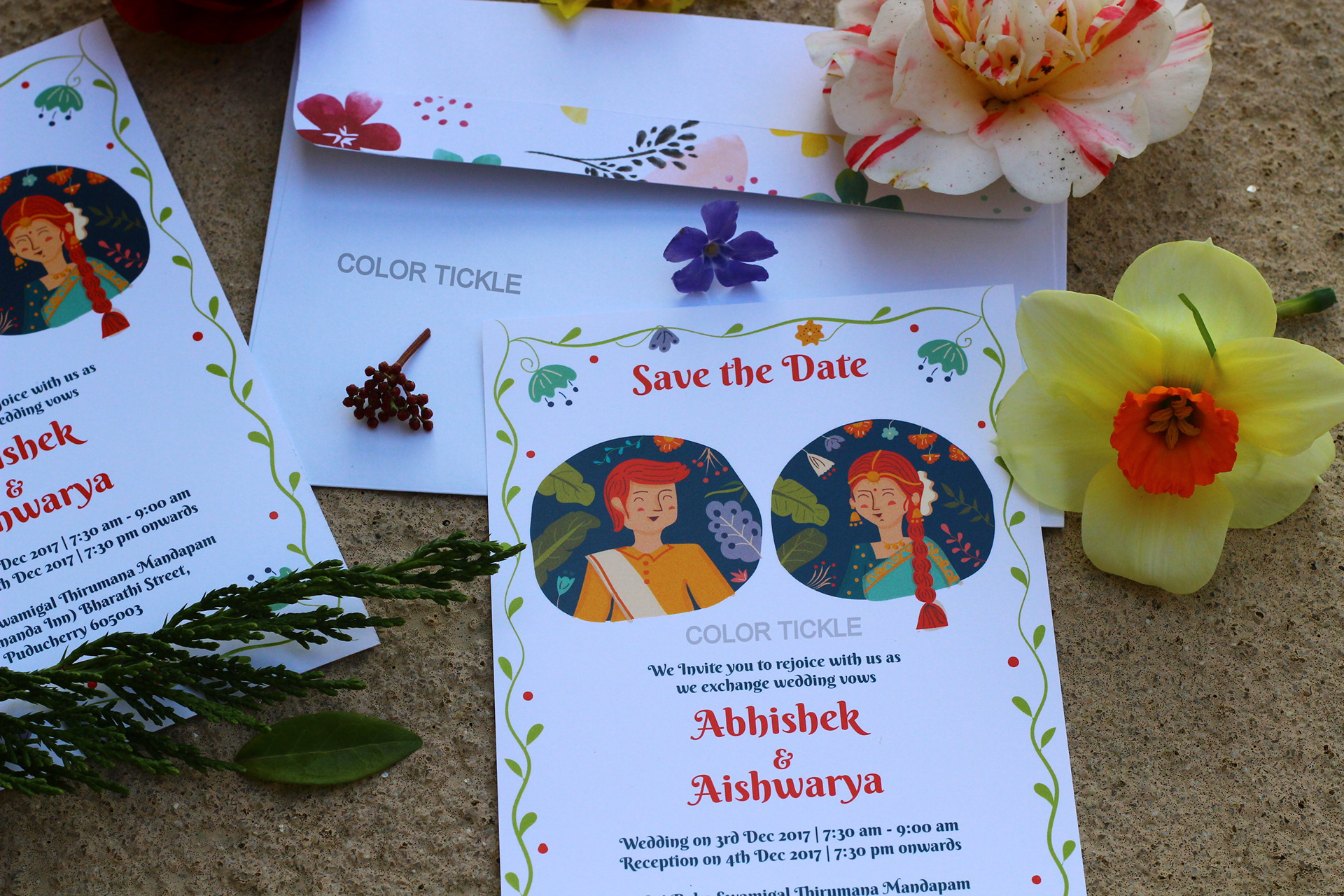 A boho inspired floral invite illustrated to depict a couple who want to keep things classy , elegant and unique . The overall tone of the card is kept subtle , filled with nature's elements like creeper plants and beautiful flowers , while the couple stand out in a contrast background sporting bright traditional clothes - a fine mix of modern style and traditional Indian values .