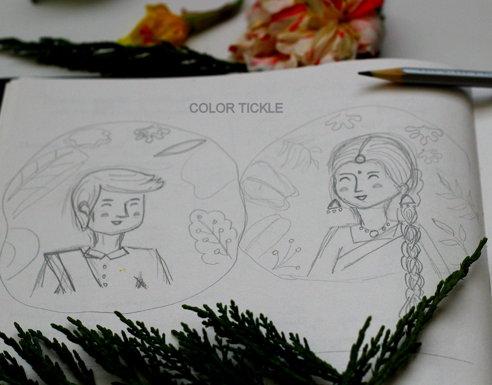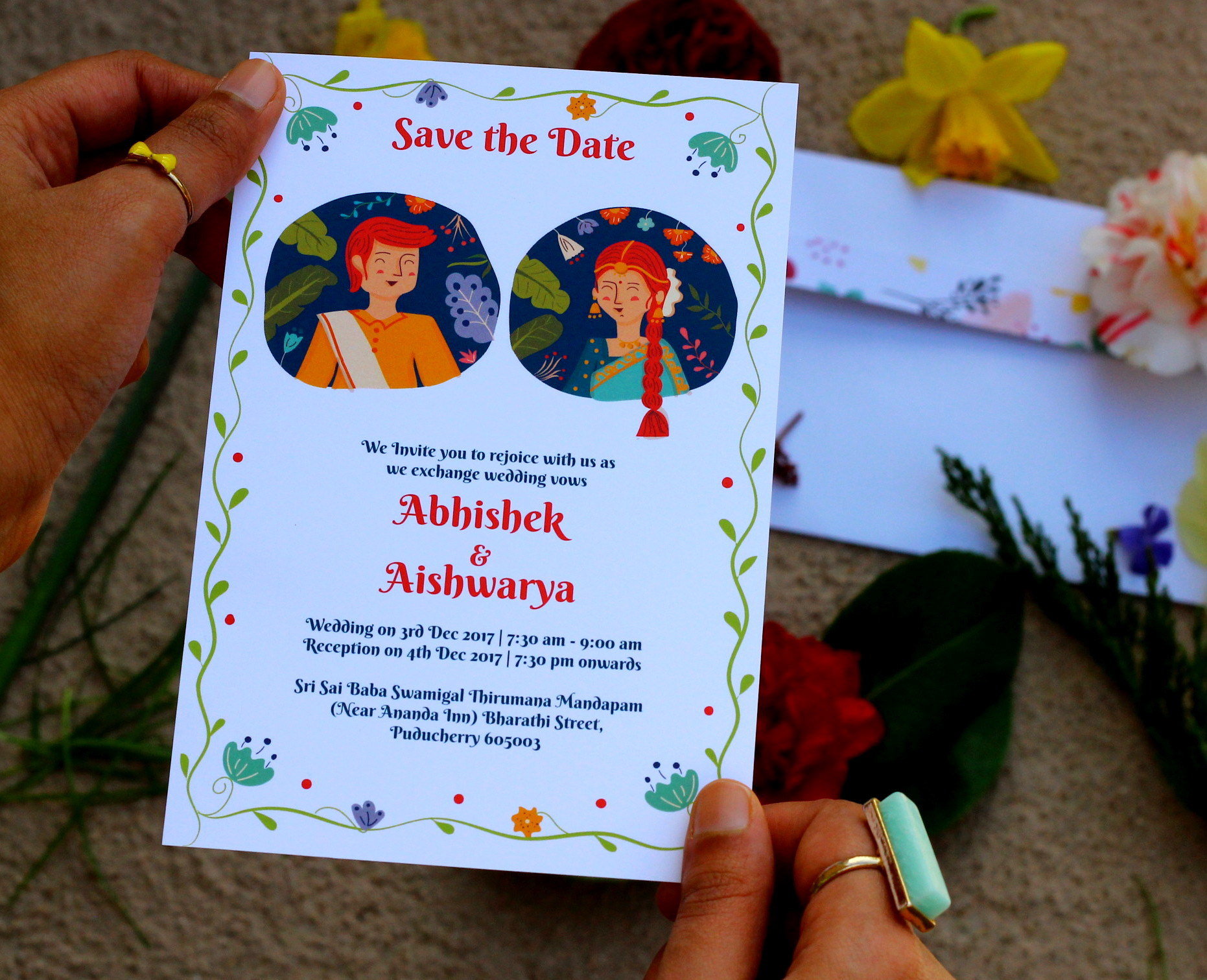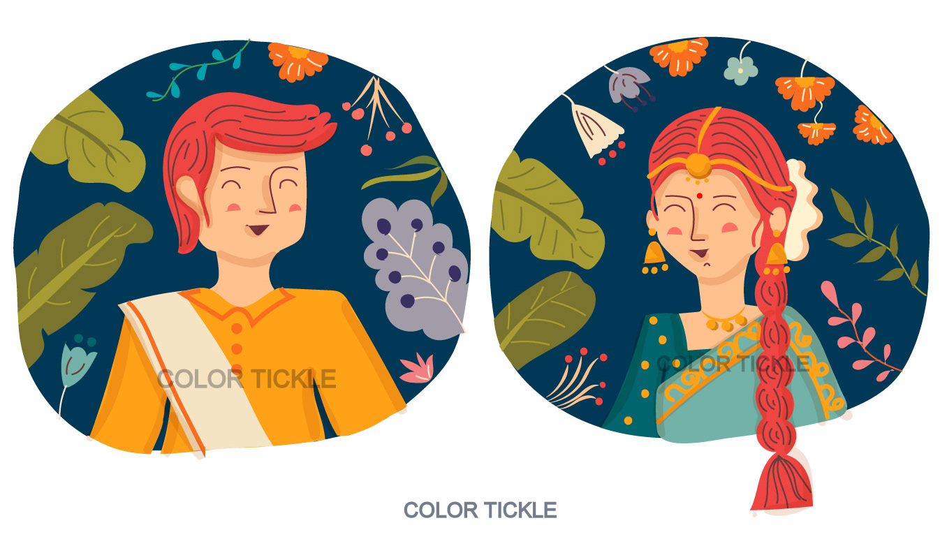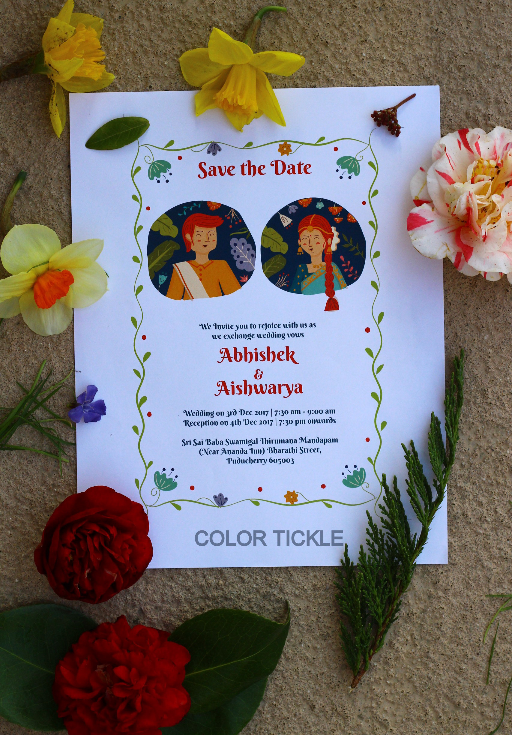 A boho inspired floral invite illustrated to depict a couple who want to keep things classy , elegant and unique . The overall tone of the card is kept subtle , filled with nature's elements like creeper plants and beautiful flowers , while the couple stand out in a contrast background sporting bright traditional clothes - a fine mix of modern style and traditional Indian values .