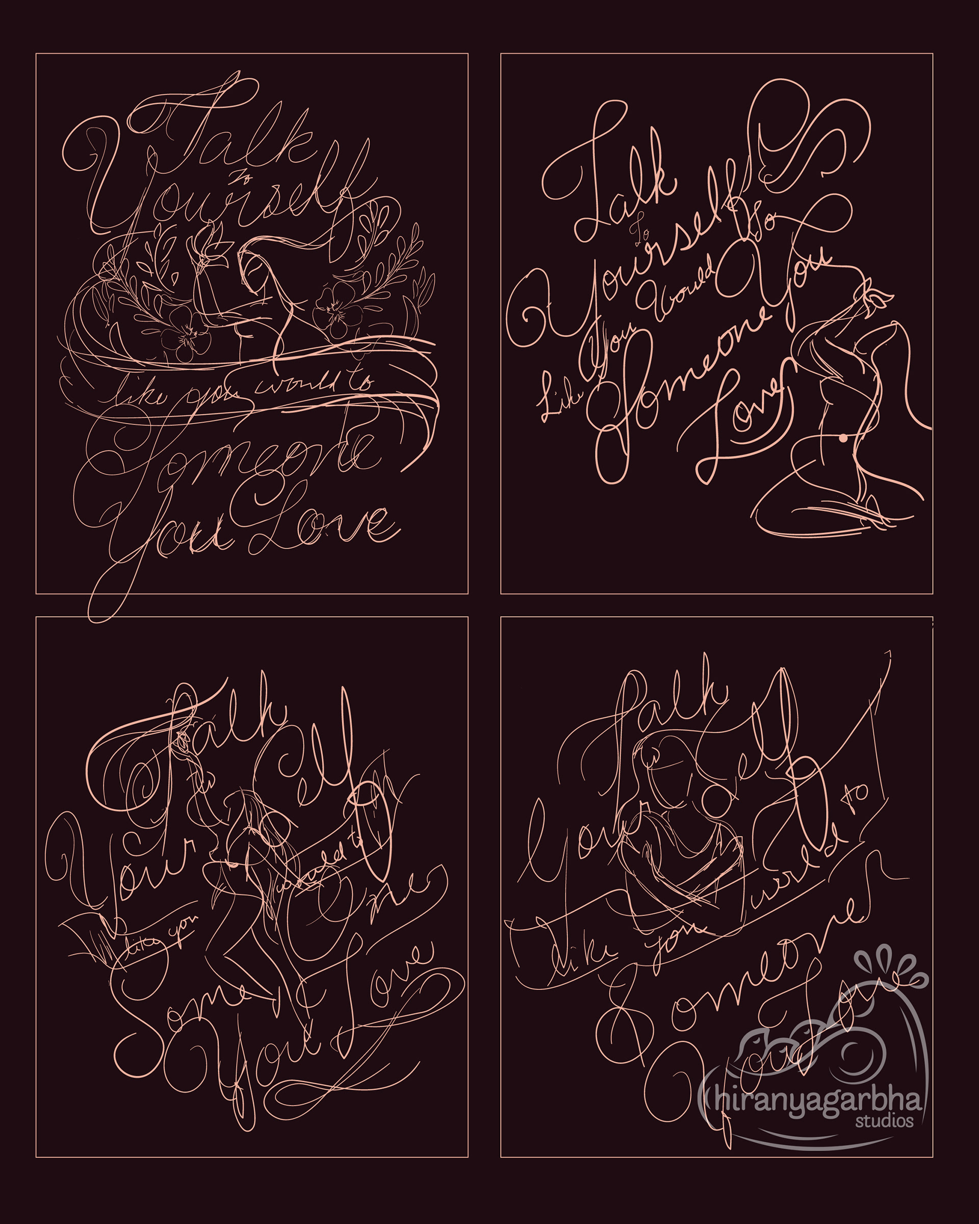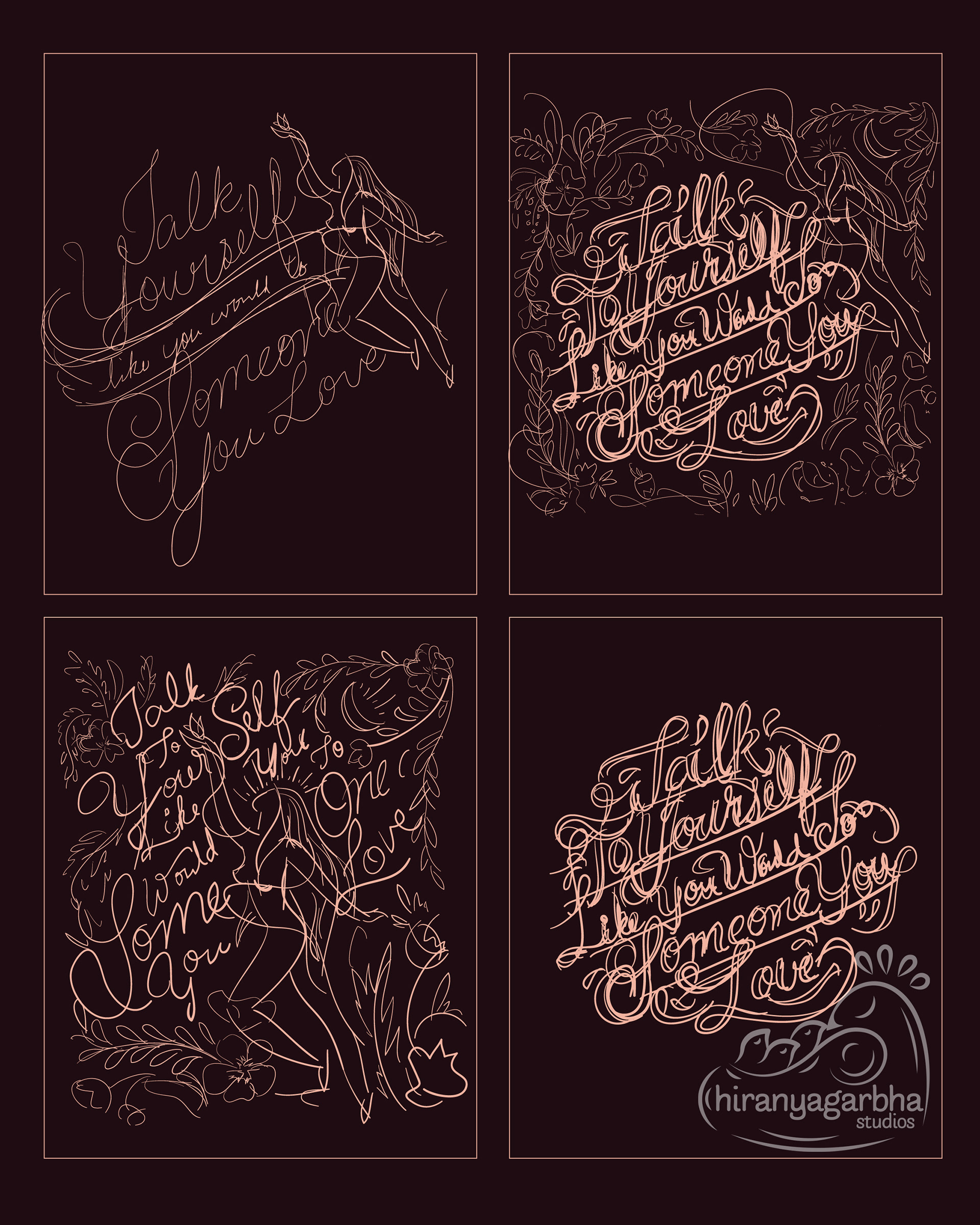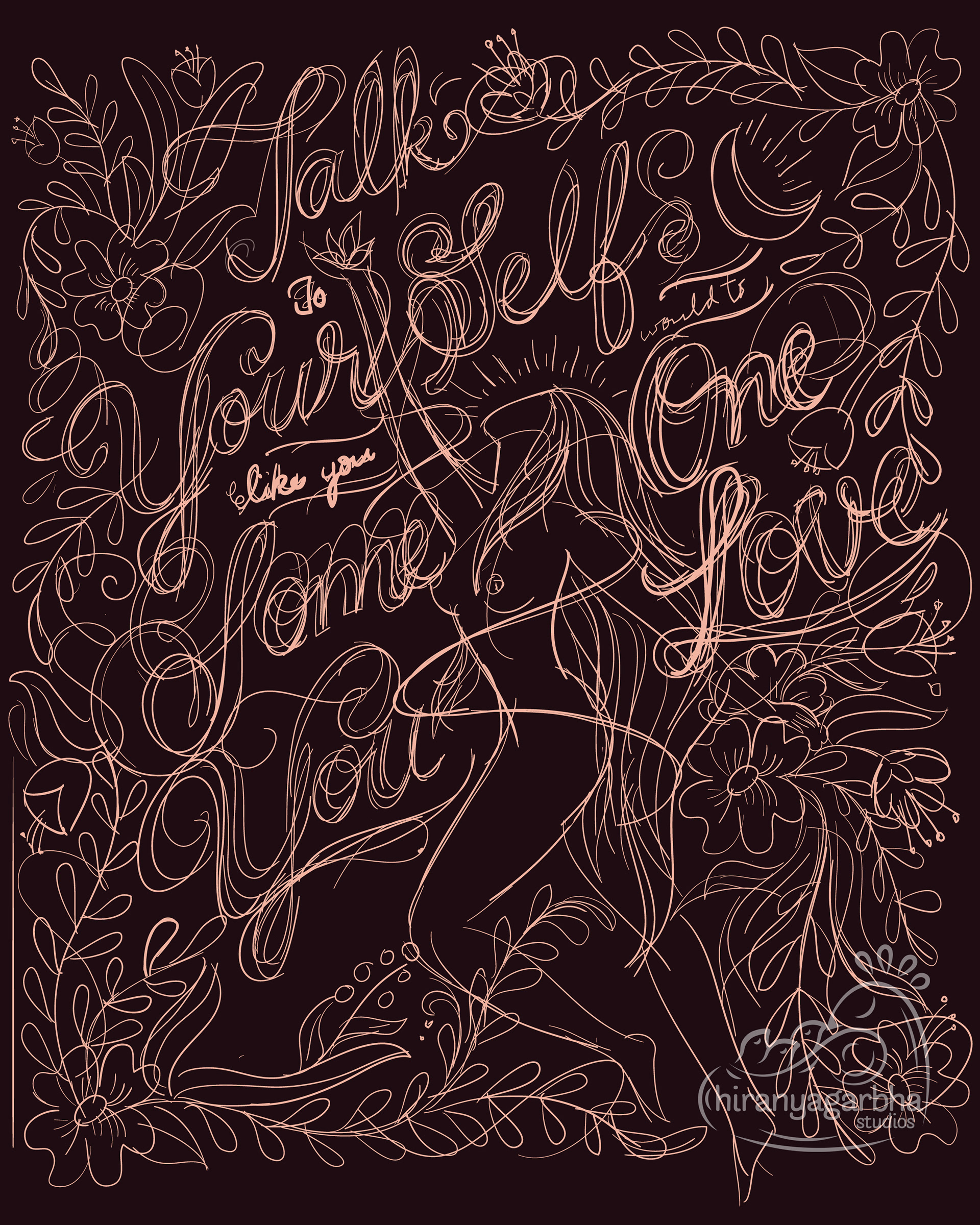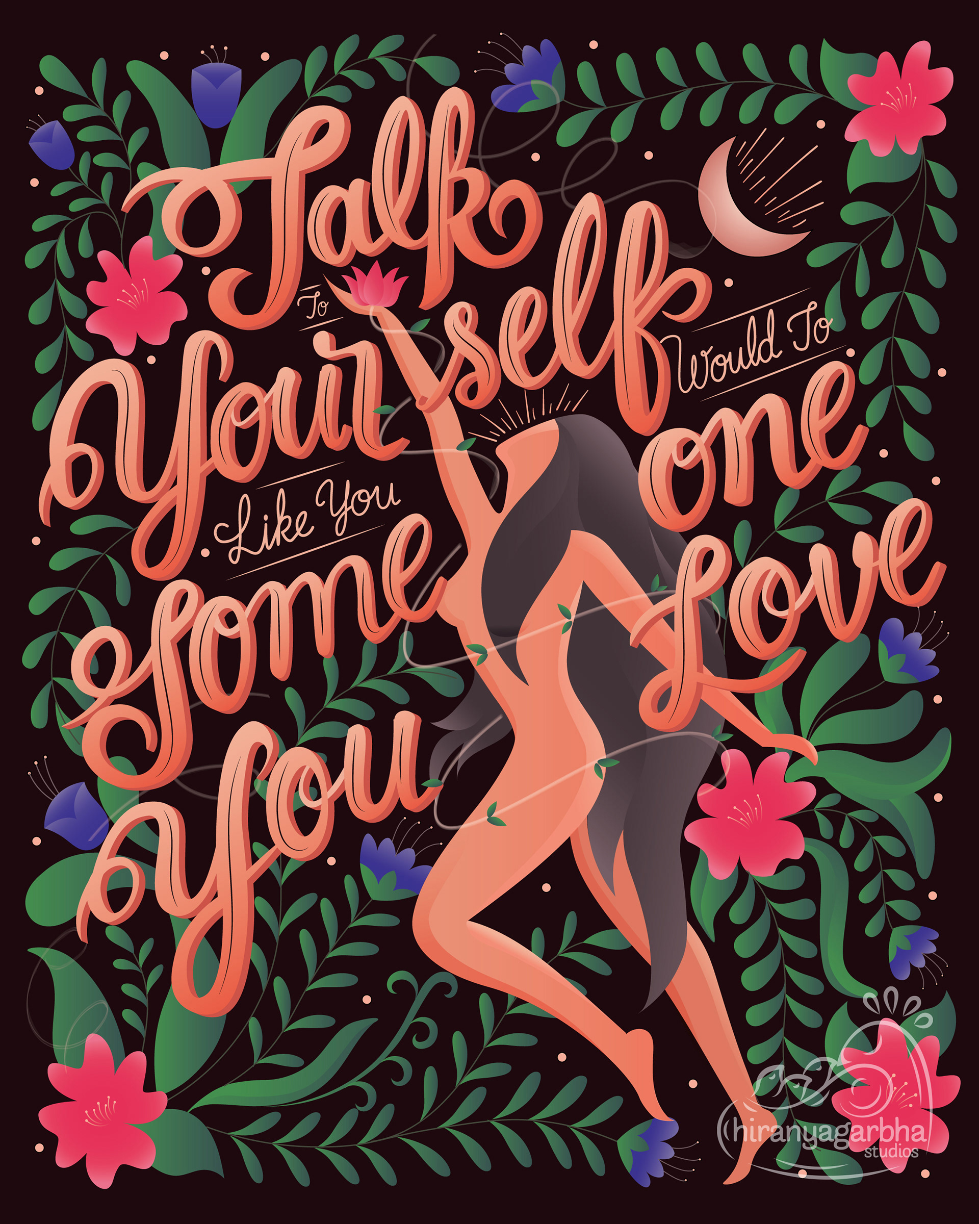 The quote “Talk to yourself like you would to someone you love” by Brené Brown speaks of self love. How often have you found yourself to be that person who adores everything and everyone around you & more importantly, you? Your energy and sparkle from within you are frequently exhilarated by the experience of falling in love with yourself. As soon as you experience it, your aura transforms and miracles begin to occur. It is this experience of self love with a deeper sense of happiness and fulfilment that I tried to encapsulate through the illustrative lettering in the flowing script style.