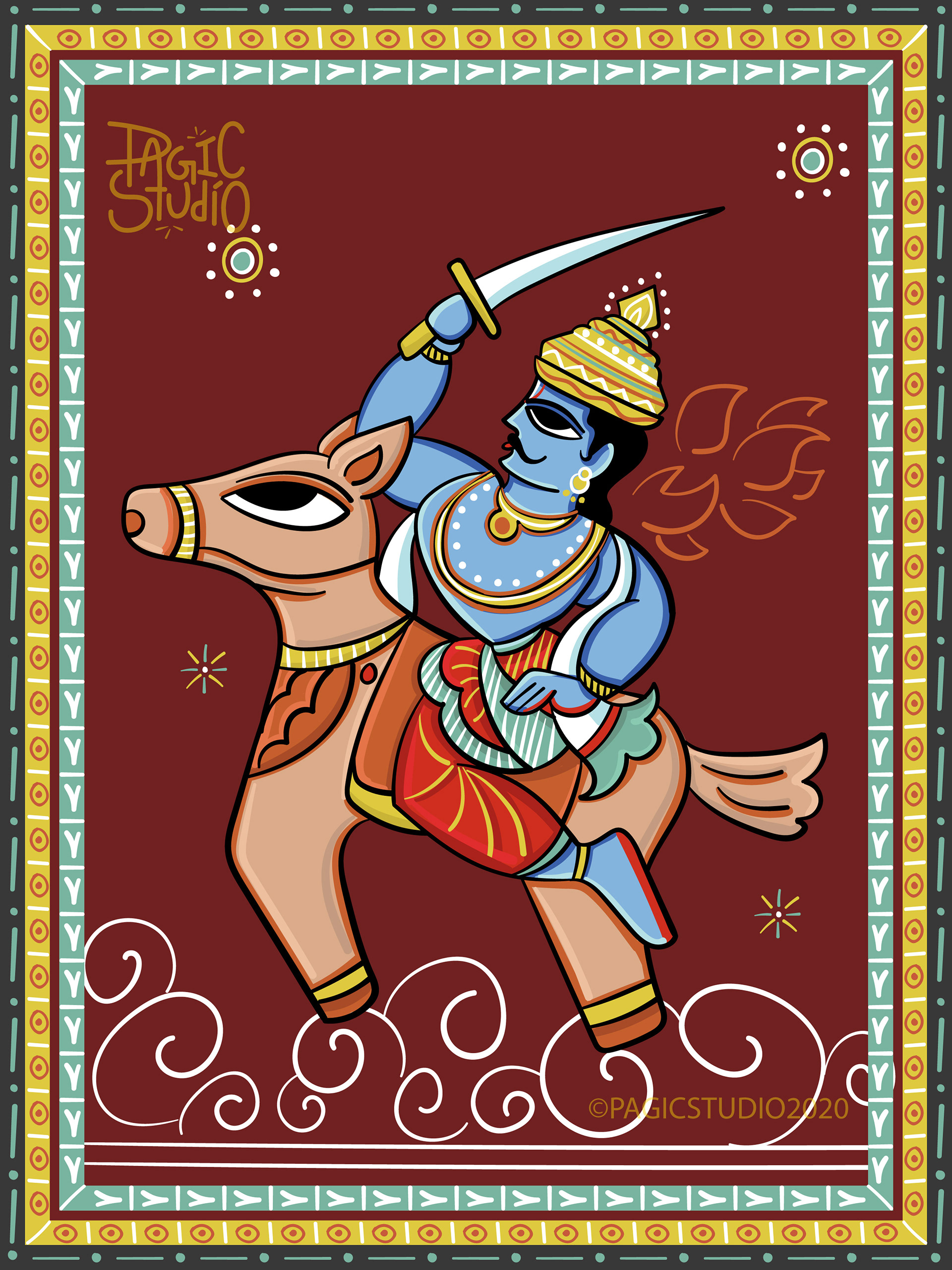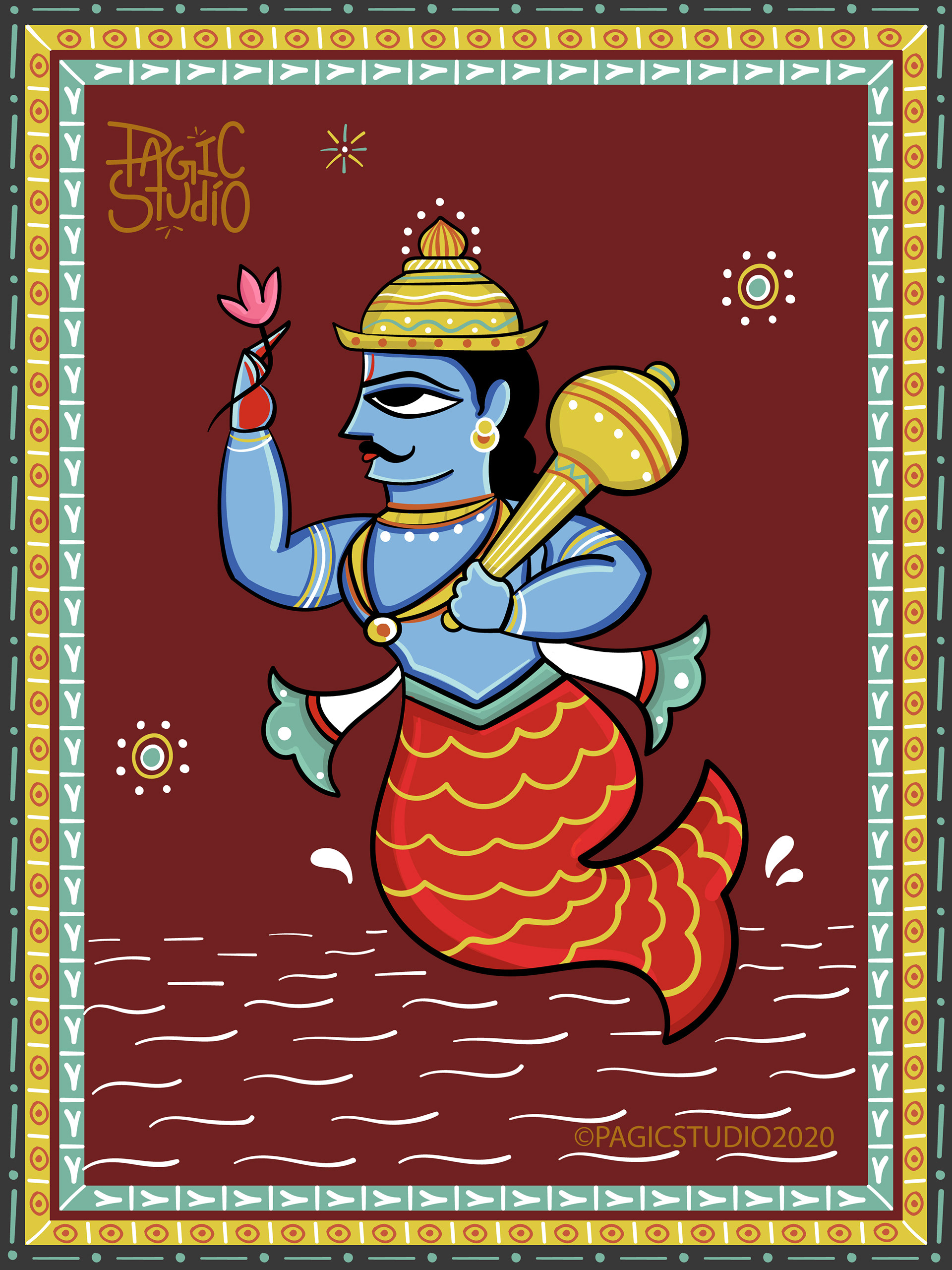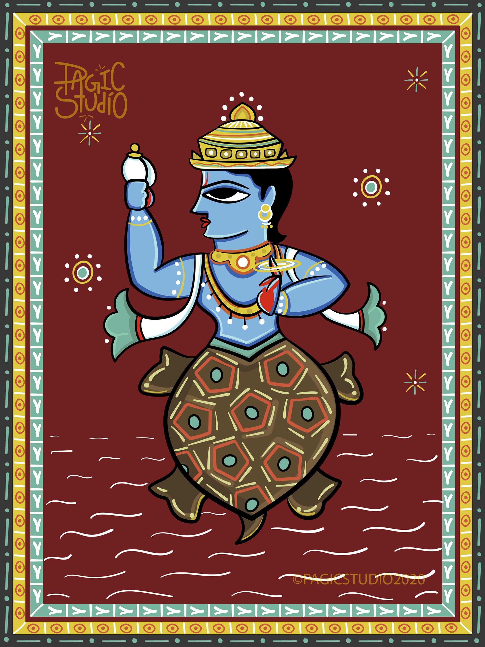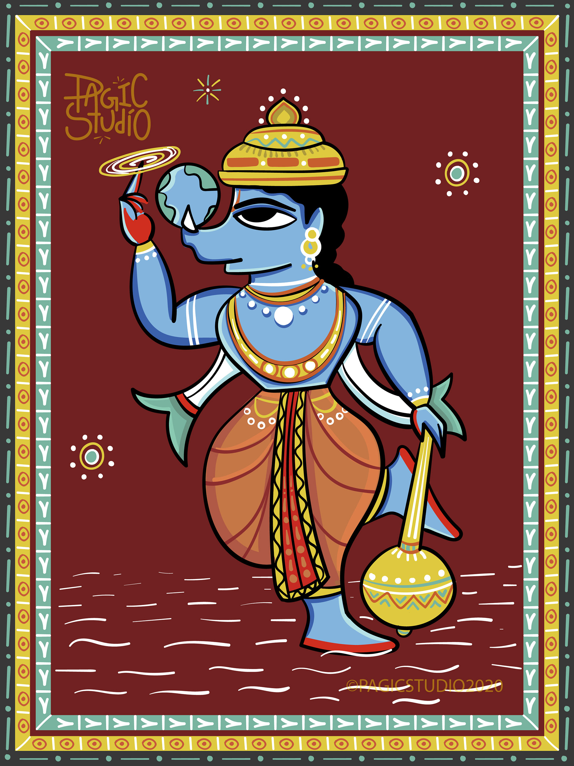 According to Hindu mythology, every time there was an evil overdose on earth, Lord Vishu would reincarnate in different avatars, so that he could end the evil and free the world from its clutches. The 'Dasavatar' stories are so fascinating that they got us interested in this project, where we attempted to illustrate those avatars in 'Bengal Patua' Style, an Indian Folk Art form.