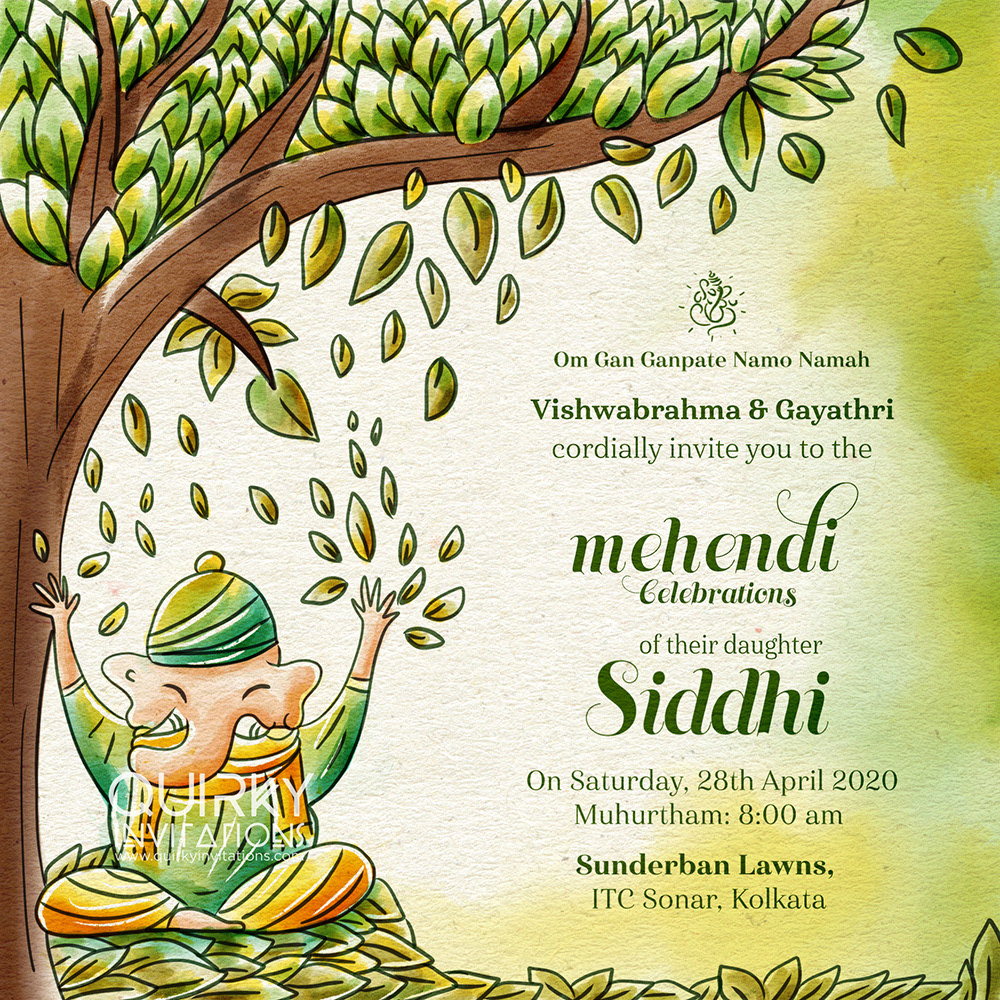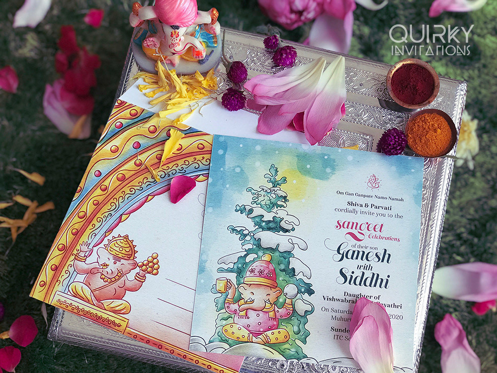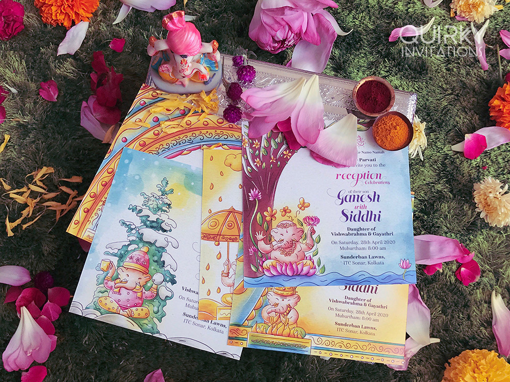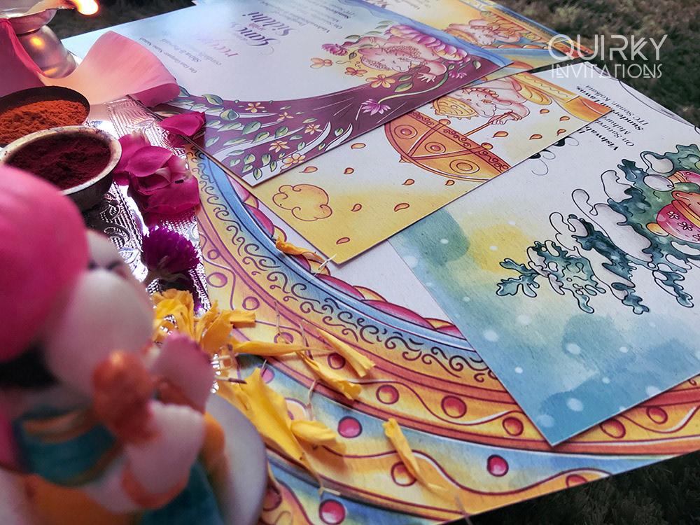 The illustration draws its inspiration from the remover of obstacles, Ganesha, and the different seasons. The invite makes use of a watercolour-style to highlight the auspiciousness of the occasion in a subtle, yet beautiful way.