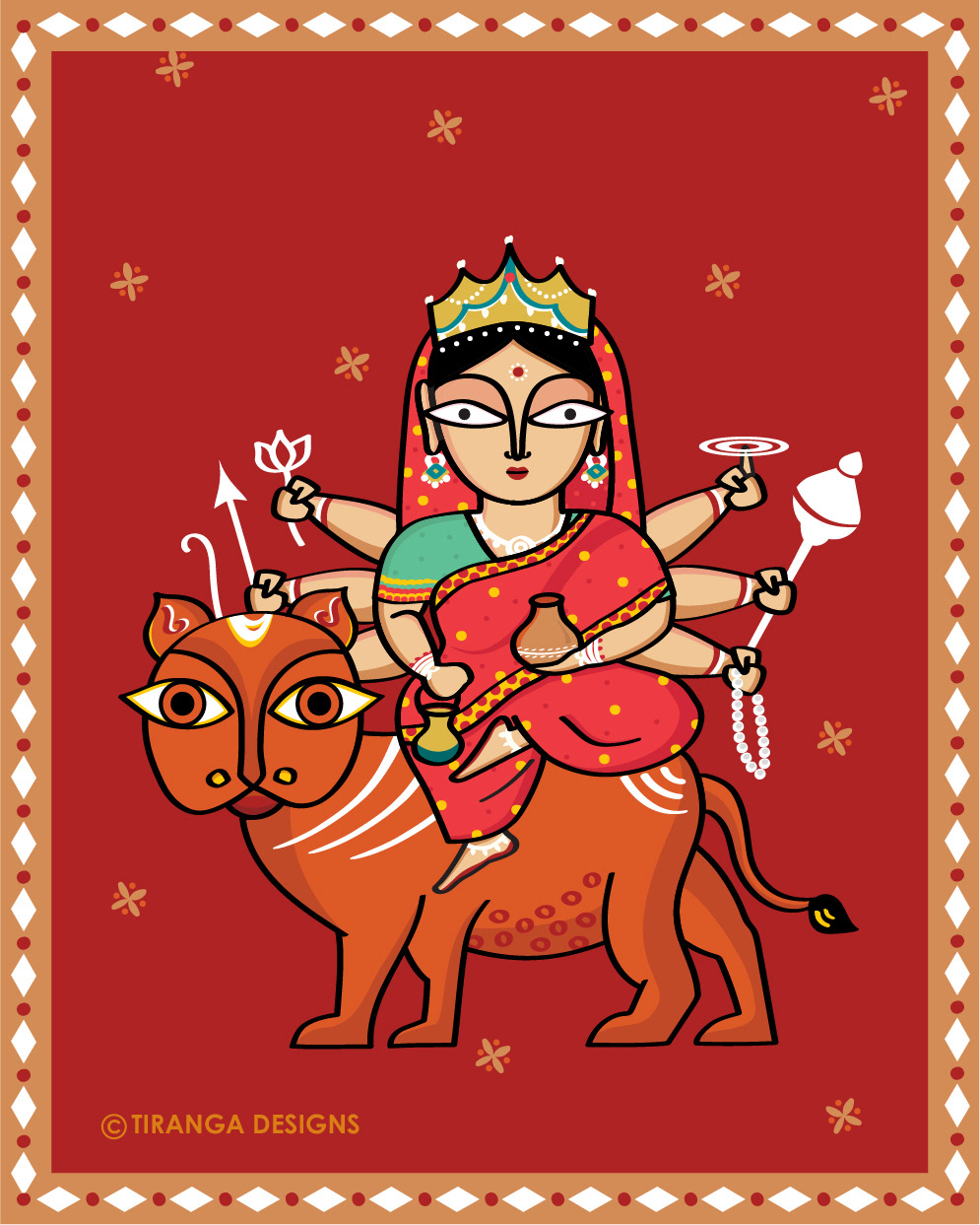 Goddess SKANDAMATA who is worshipped on the fifth day is also known as Panchami. She holds her son Lord Skanda (Kartikeya) the divine warrior god in her lap, who offers us courage and strength and is the deity of the planet Mars.