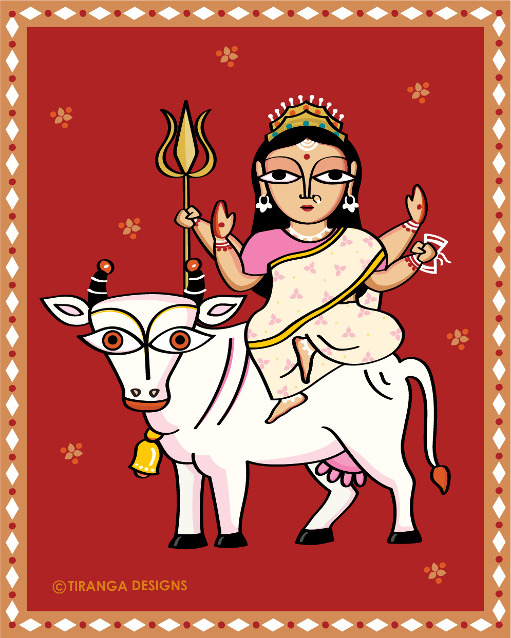 She carries a Trishul and a damru in her hands.