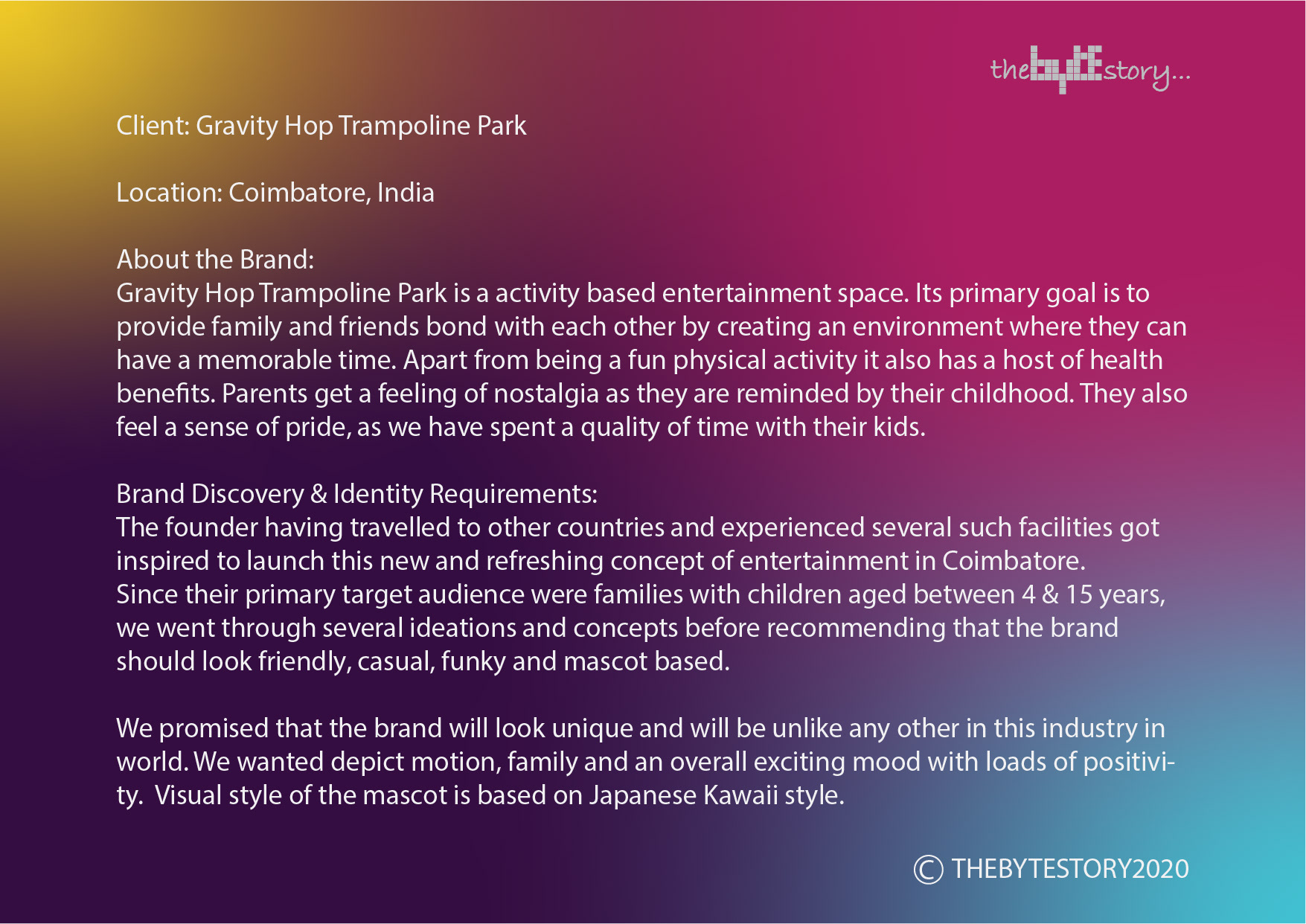 Brand Discovery & Identity Requirements: The founder having travelled to other countries and experienced several such facilities got inspired to launch this new and refreshing concept of entertainment in Coimbatore. After in-depth discussions, competitor analysis and discovery, we identified their primary target audience to be families with children aged between 4 & 15 years, we went through several rounds of ideations, concepts & doodles. We helped identify the Brand Voice to be friendly, casual, funky and the Brand Identity to be mascot-based style. We diligently worked towards a design that will be unique and unlike any other in this industry in world. We wanted depict motion, fun, family and an overall exciting mood with loads of positivity. Visual trend of the mascot is based on Japanese Kawaii style.