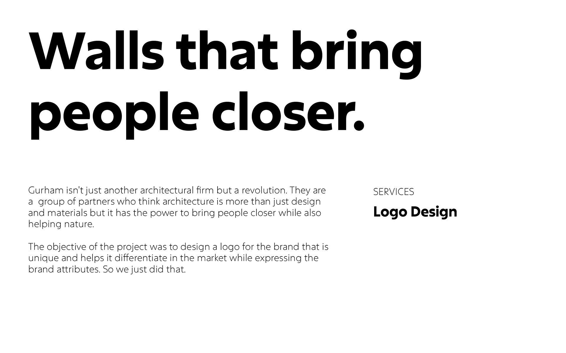 Gurham is a group of partners who think architecture is more than just design and materials but it has the power to bring people closer while also helping nature. The objective of the project was to design a logo for the brand that is unique and helps it differentiate in the market while expressing the brand attributes. So we just did that.