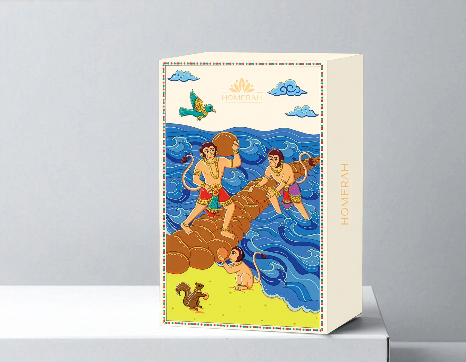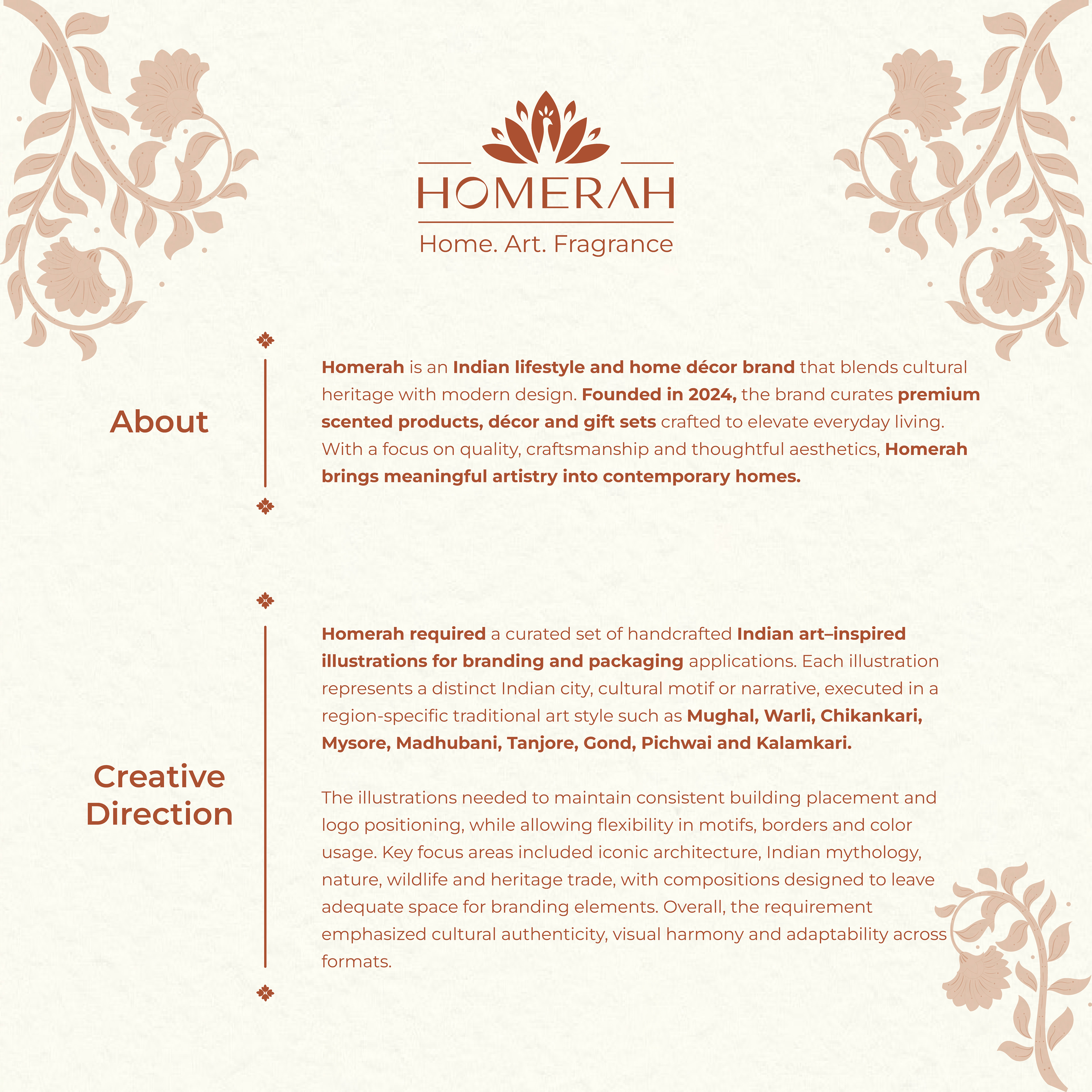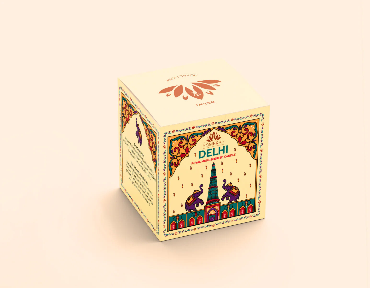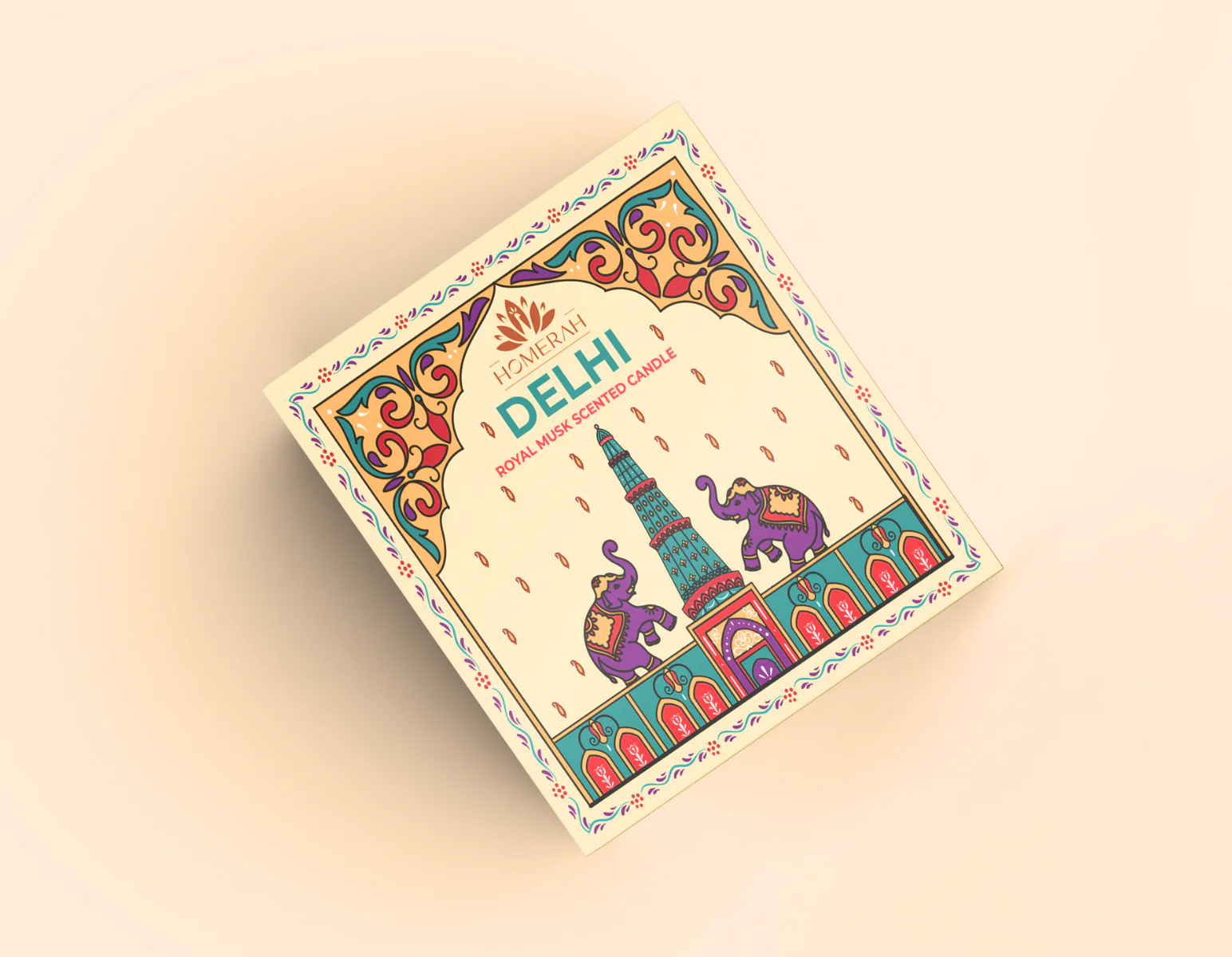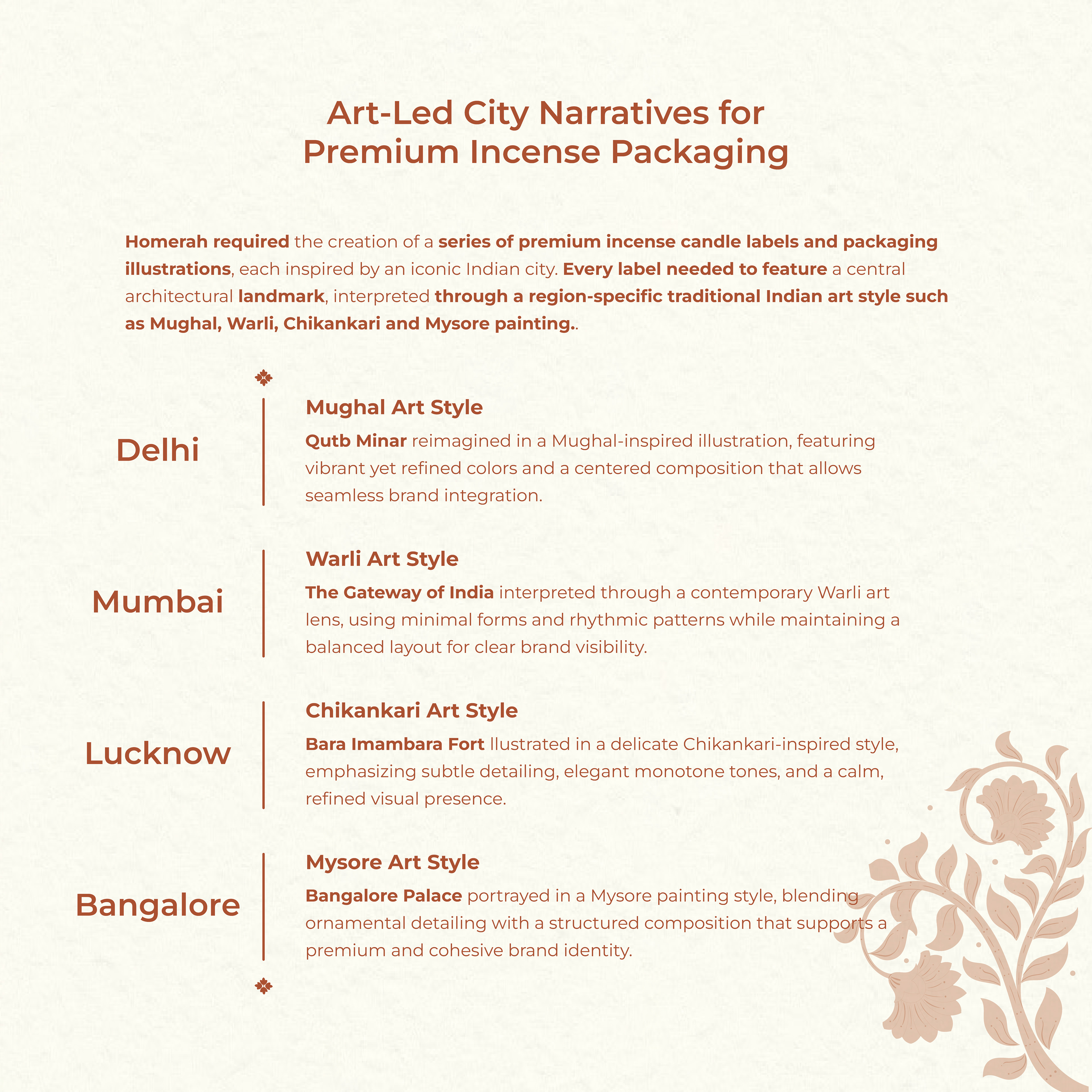 A premium incense candle and gift box design project for Homerah, inspired by India’s rich cultural heritage. Completely visualised and designed by Atma Studios. Each label and package artwork translates iconic cities, traditional art forms and heritage narratives into contemporary illustrations, creating a cohesive, luxurious visual identity across the product range.