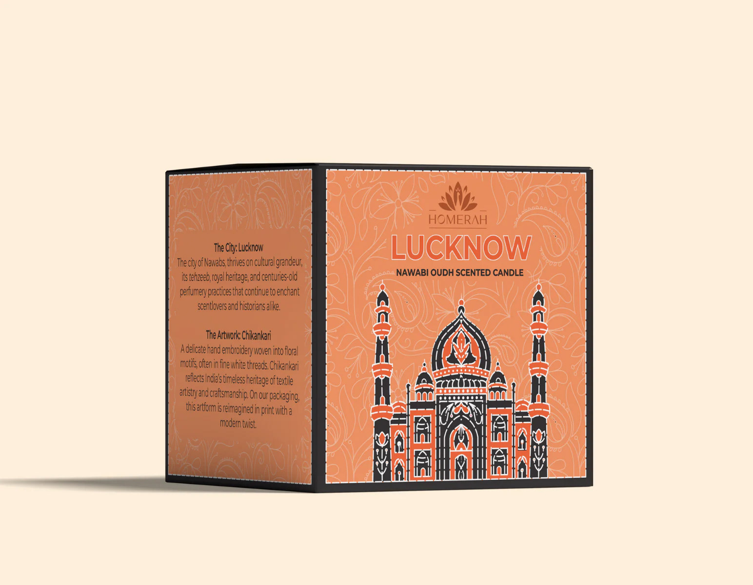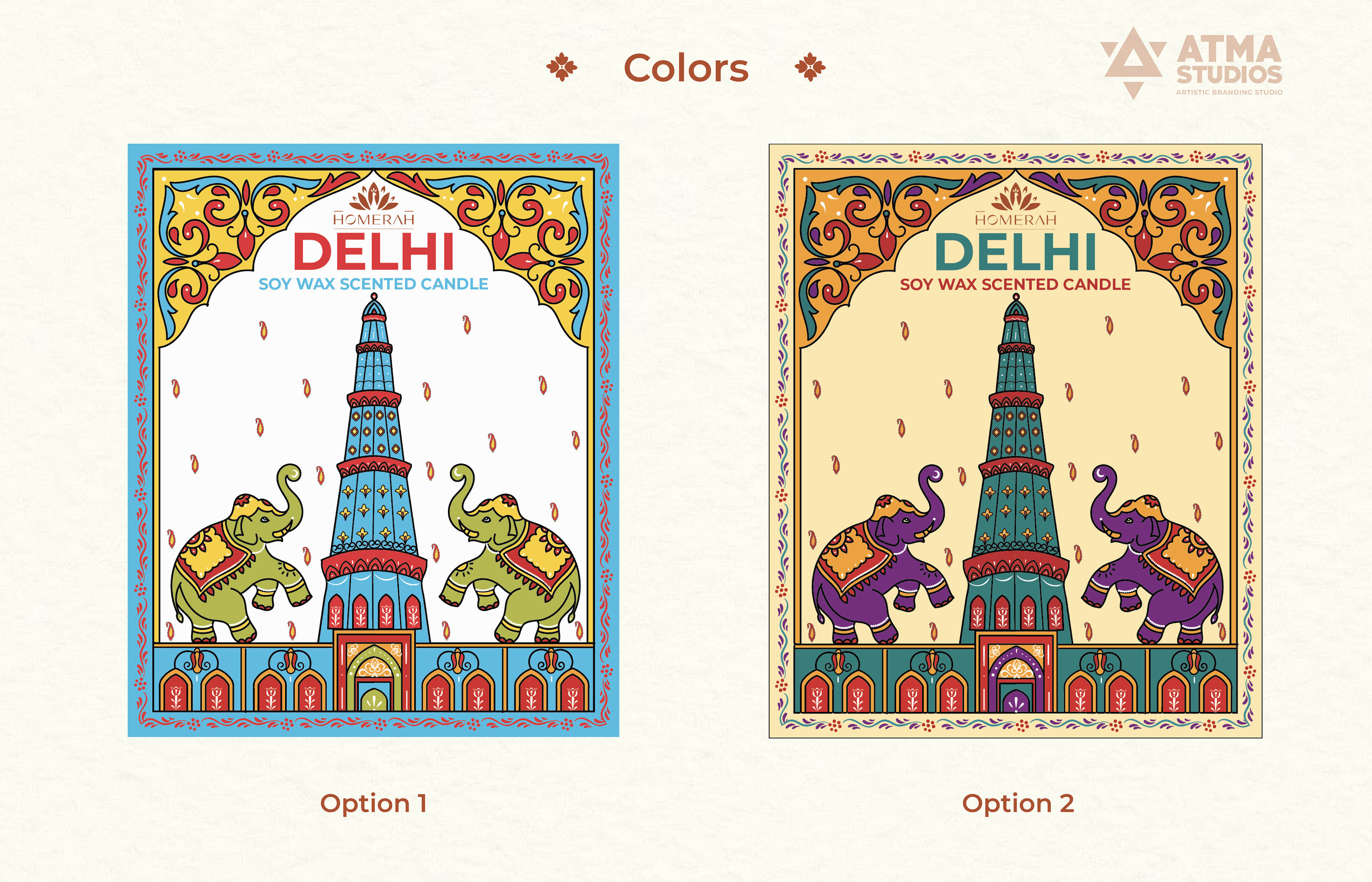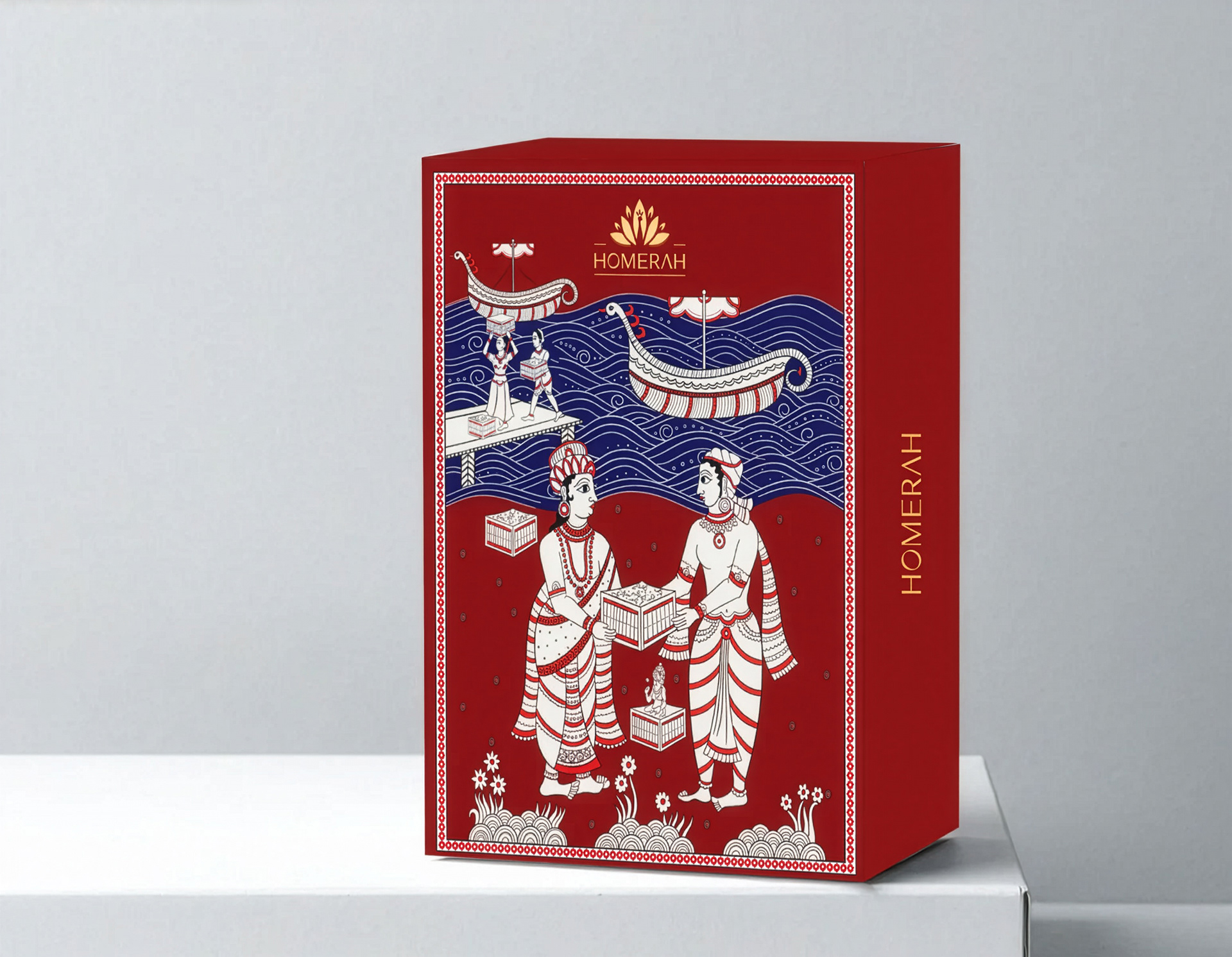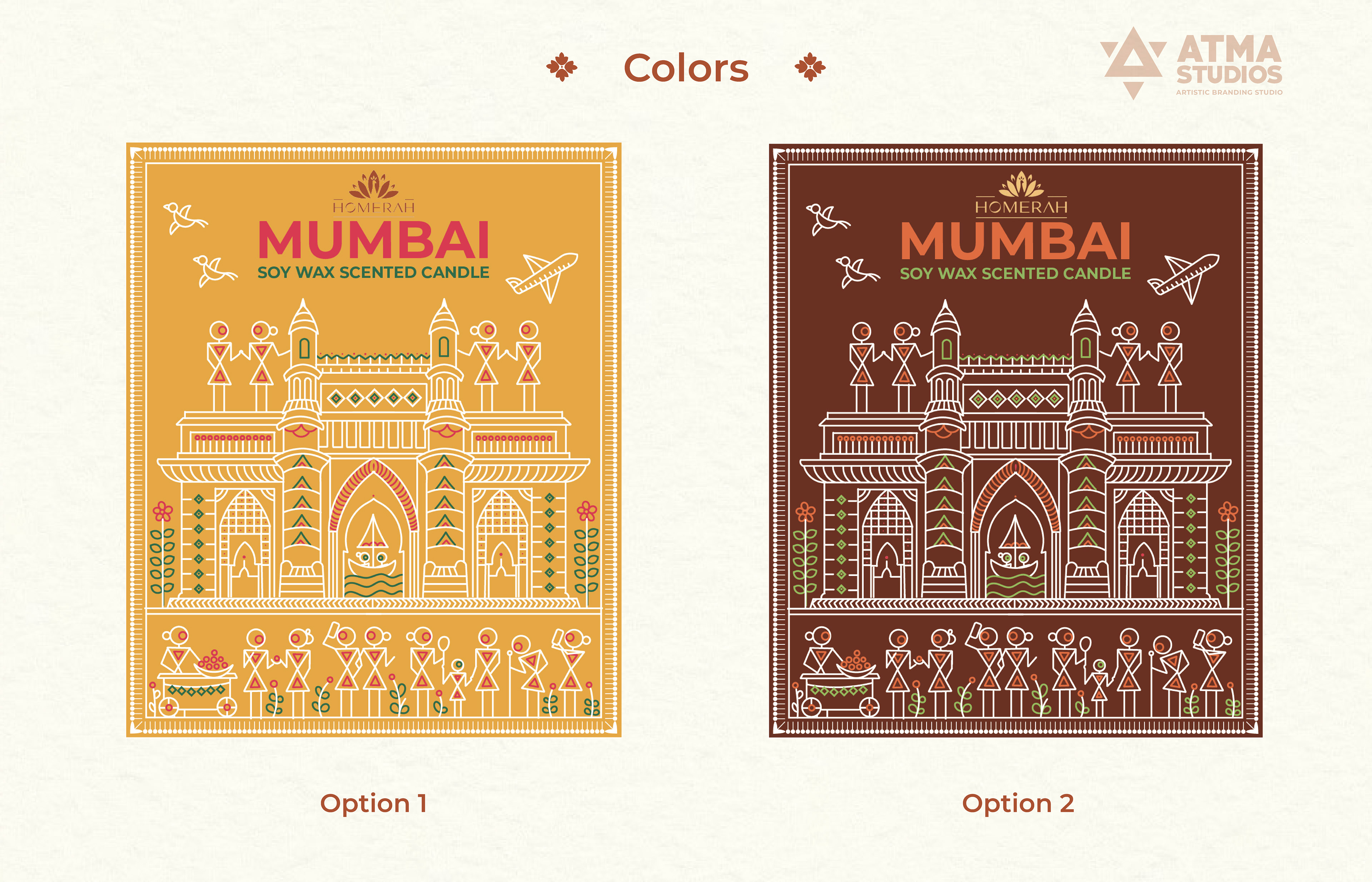A premium incense candle and gift box design project for Homerah, inspired by India’s rich cultural heritage. Completely visualised and designed by Atma Studios. Each label and package artwork translates iconic cities, traditional art forms and heritage narratives into contemporary illustrations, creating a cohesive, luxurious visual identity across the product range.
