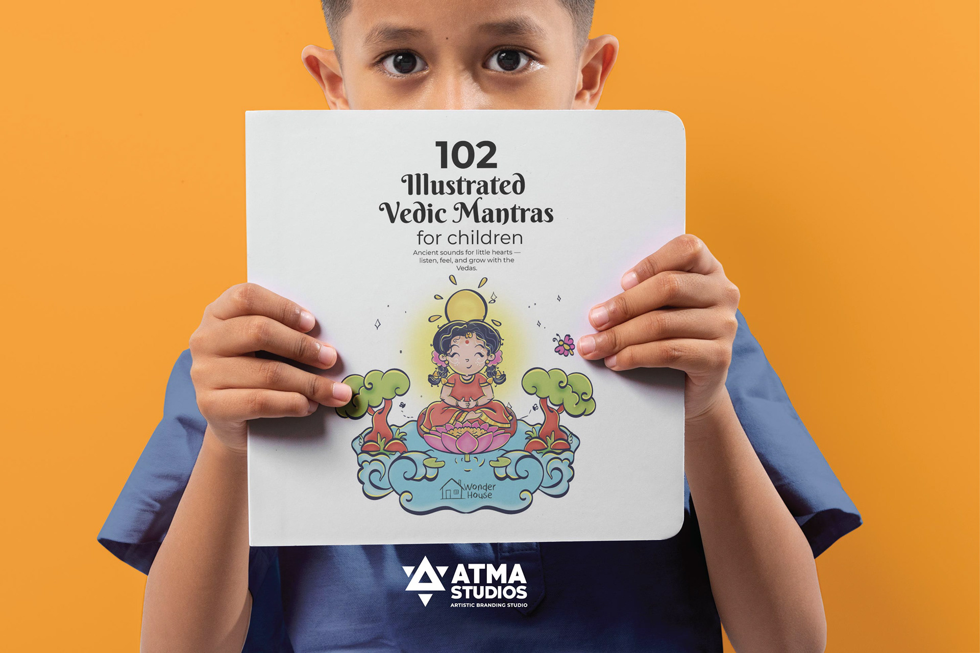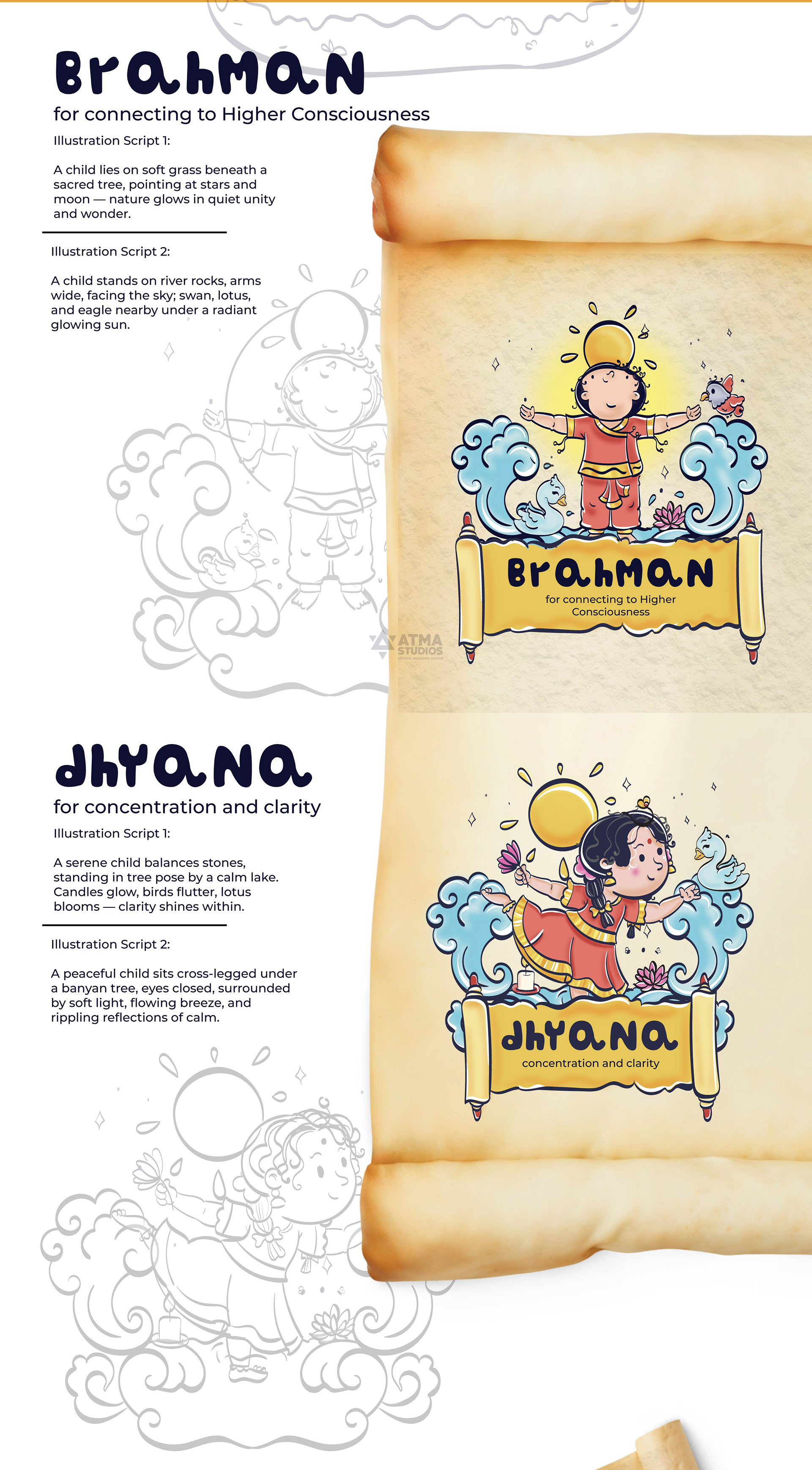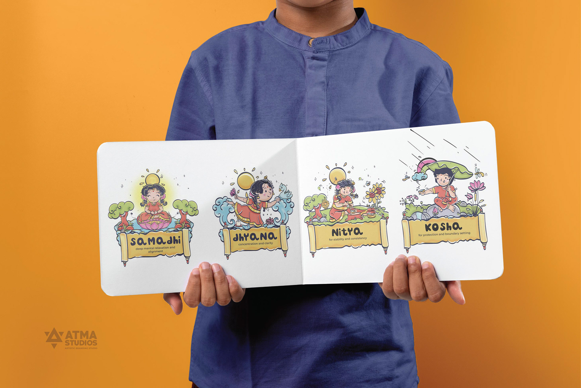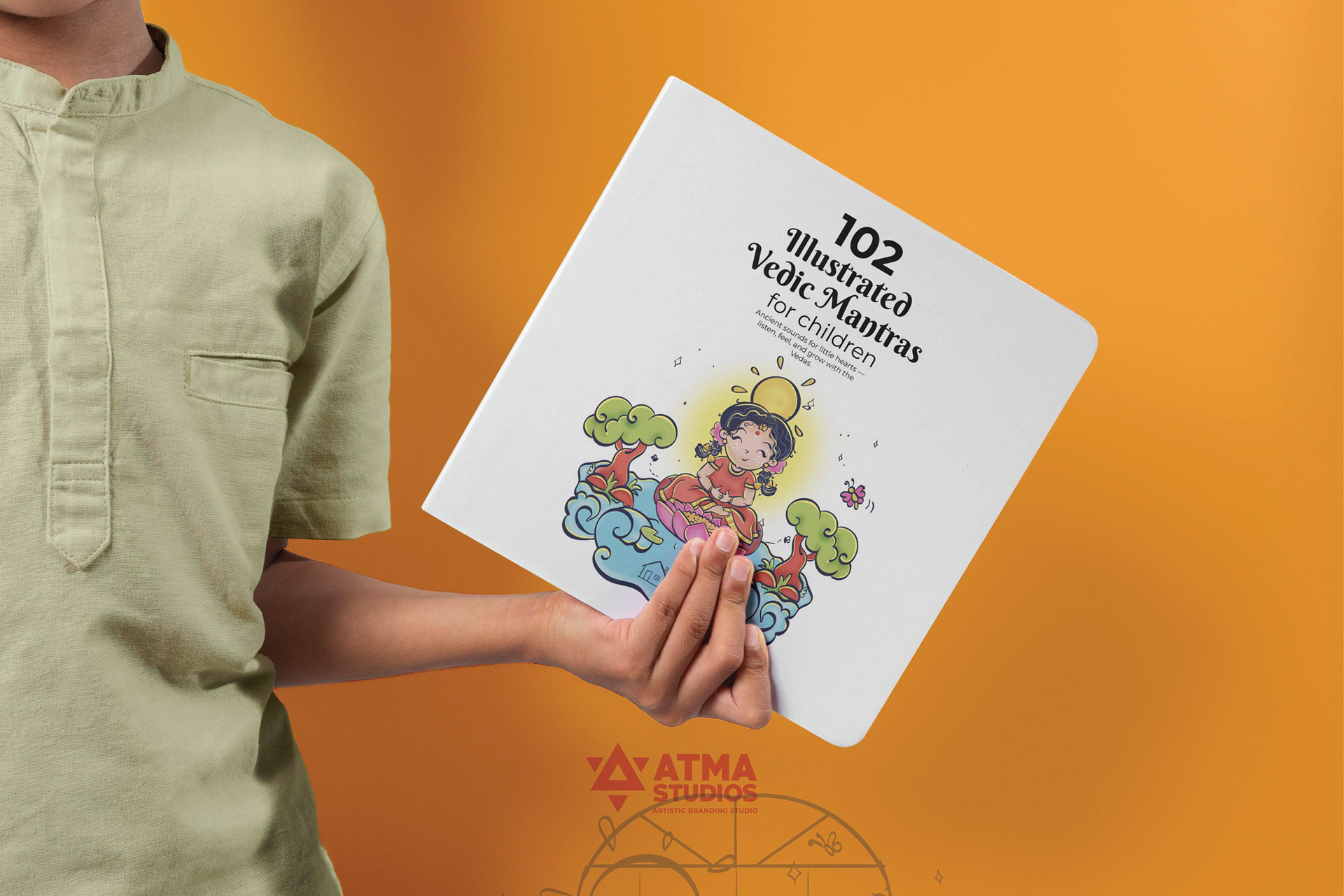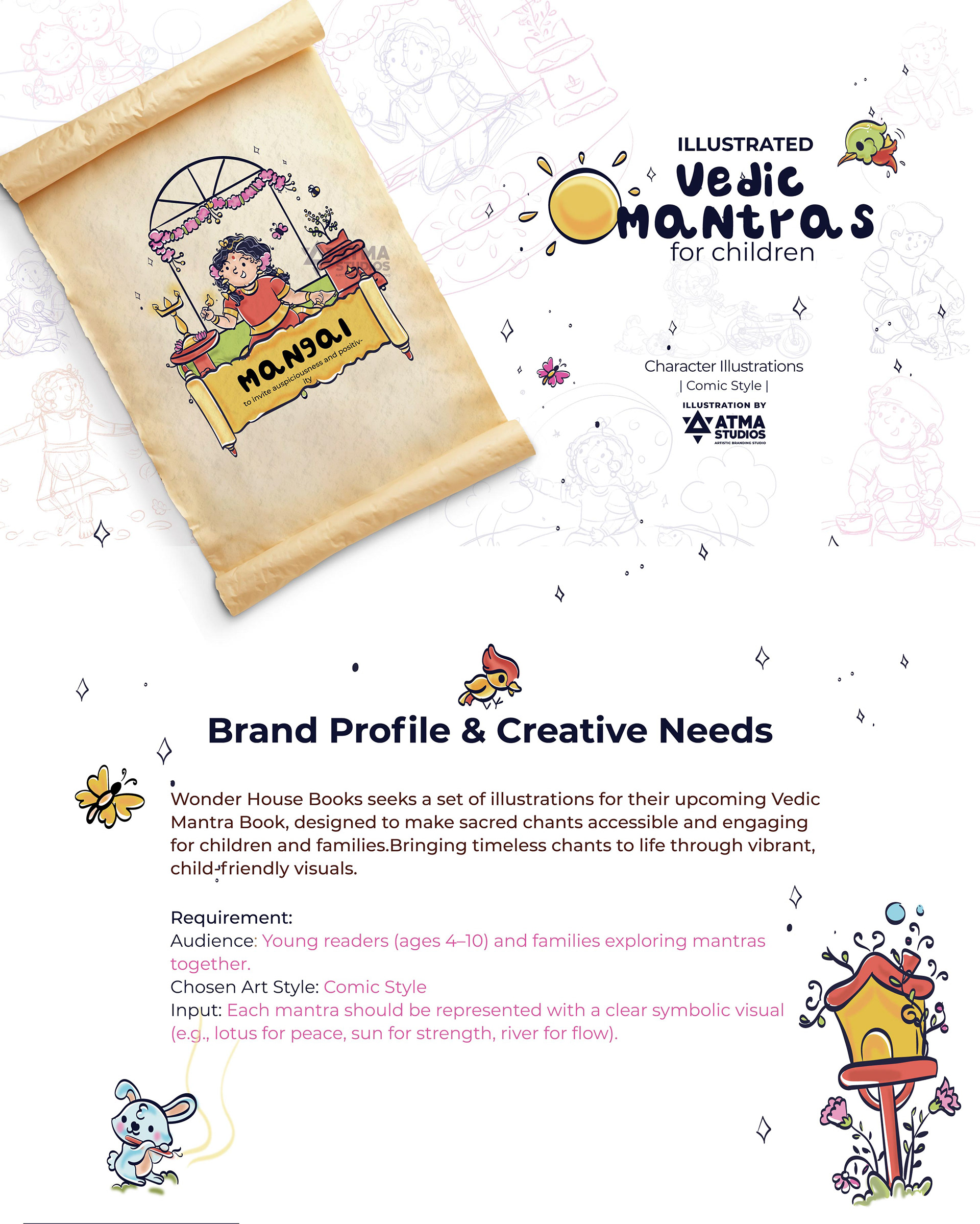 llustrated Vedic Mantras for Children is a visual storytelling project by Atma Studios that makes ancient Vedic chants engaging for young readers through playful comic-style art. Each mantra is illustrated with symbolic elements like lotuses and suns, inspiring mindfulness, compassion, and balance in a child-friendly way.