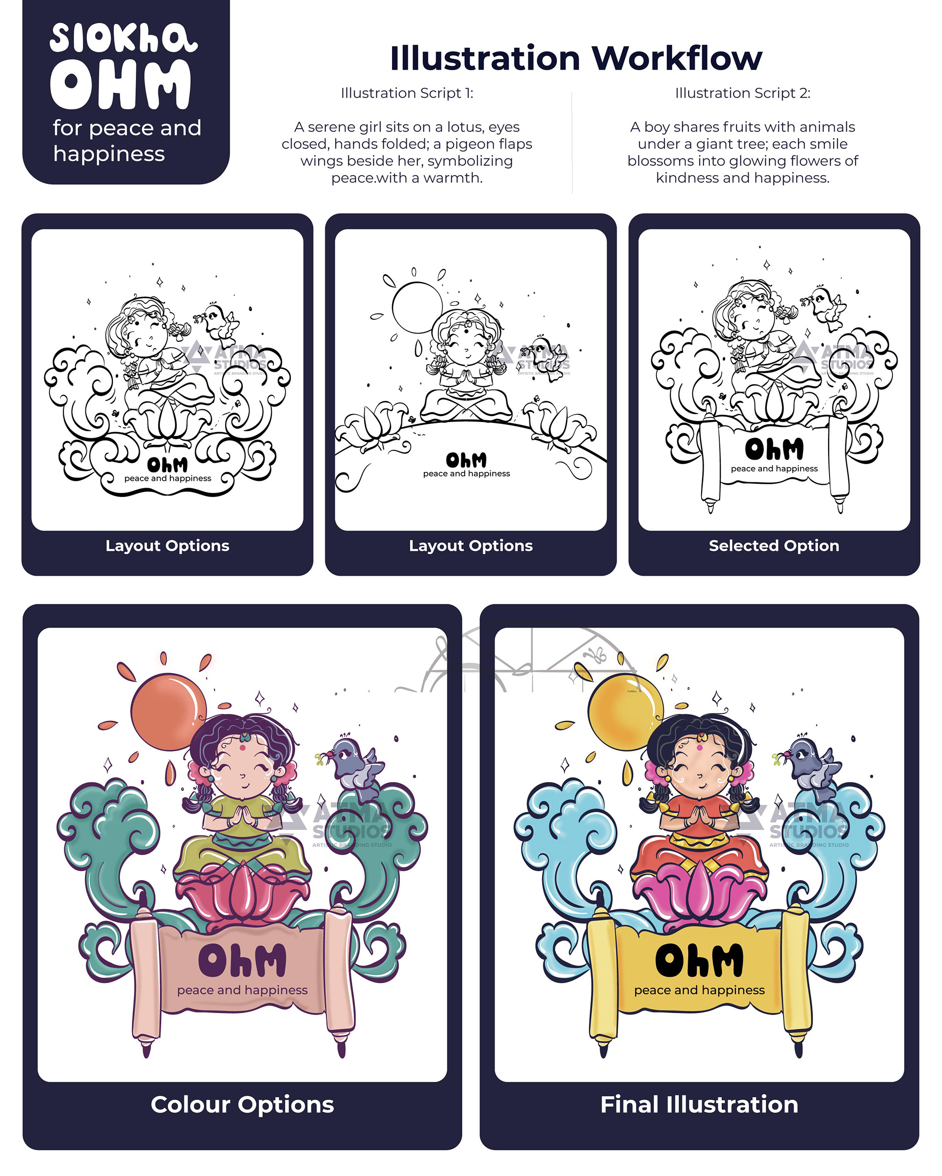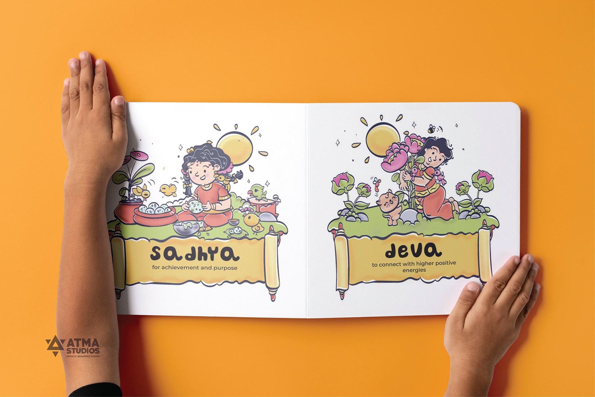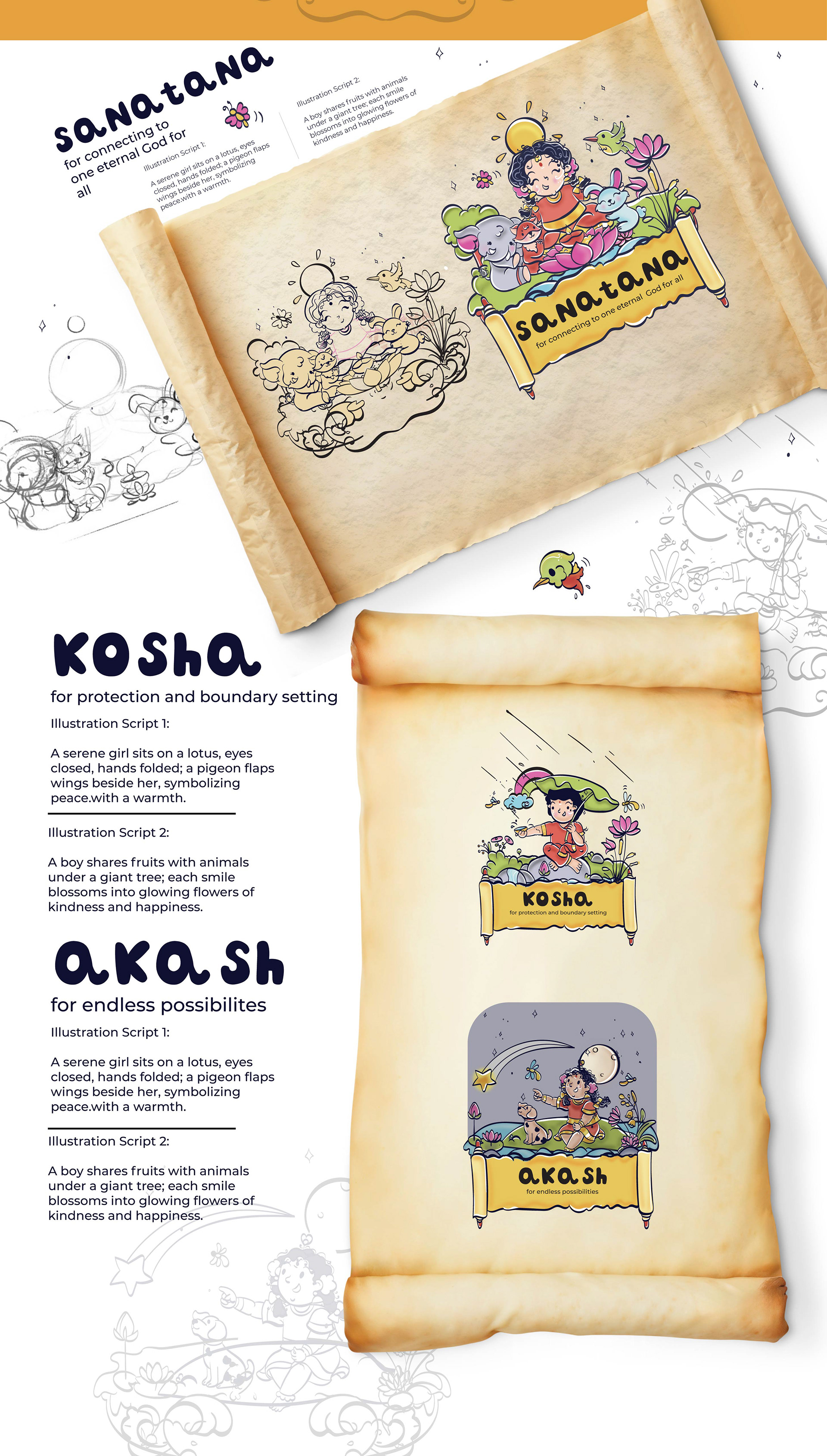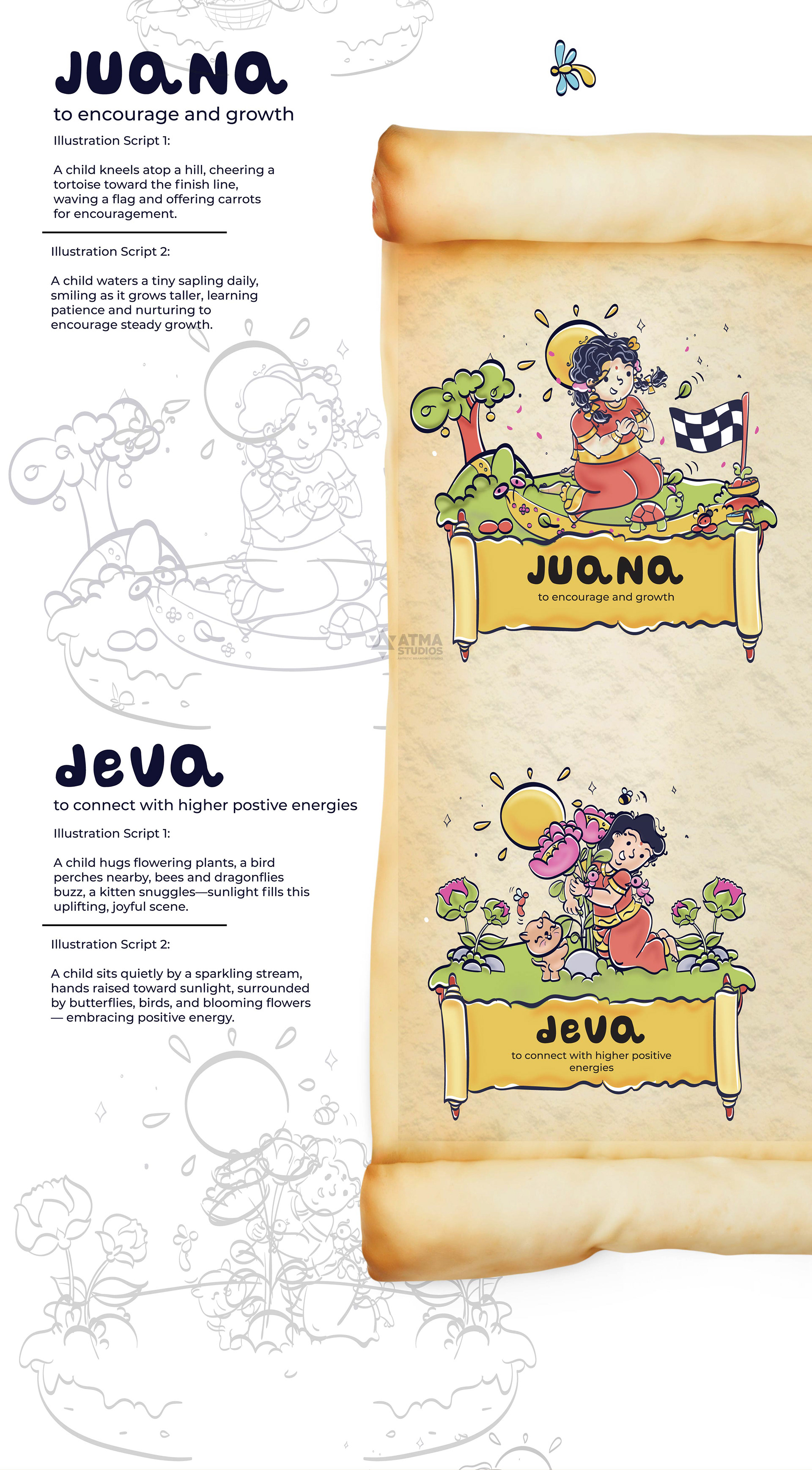 llustrated Vedic Mantras for Children is a visual storytelling project by Atma Studios that makes ancient Vedic chants engaging for young readers through playful comic-style art. Each mantra is illustrated with symbolic elements like lotuses and suns, inspiring mindfulness, compassion, and balance in a child-friendly way.