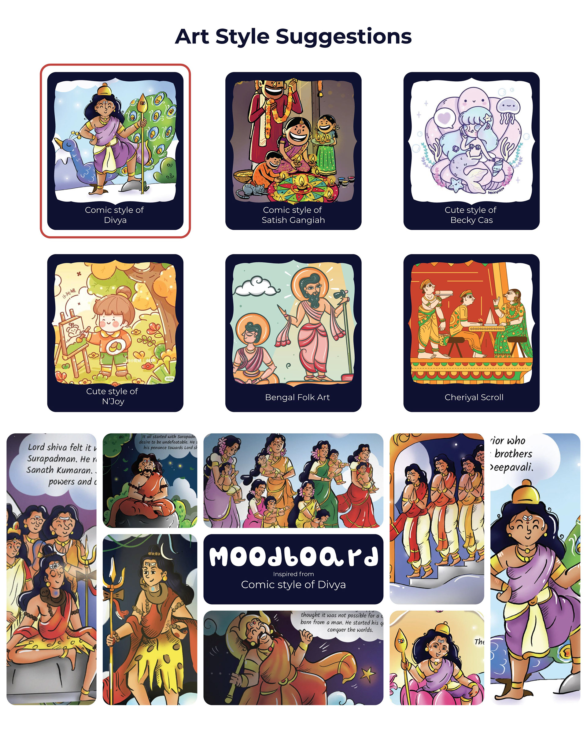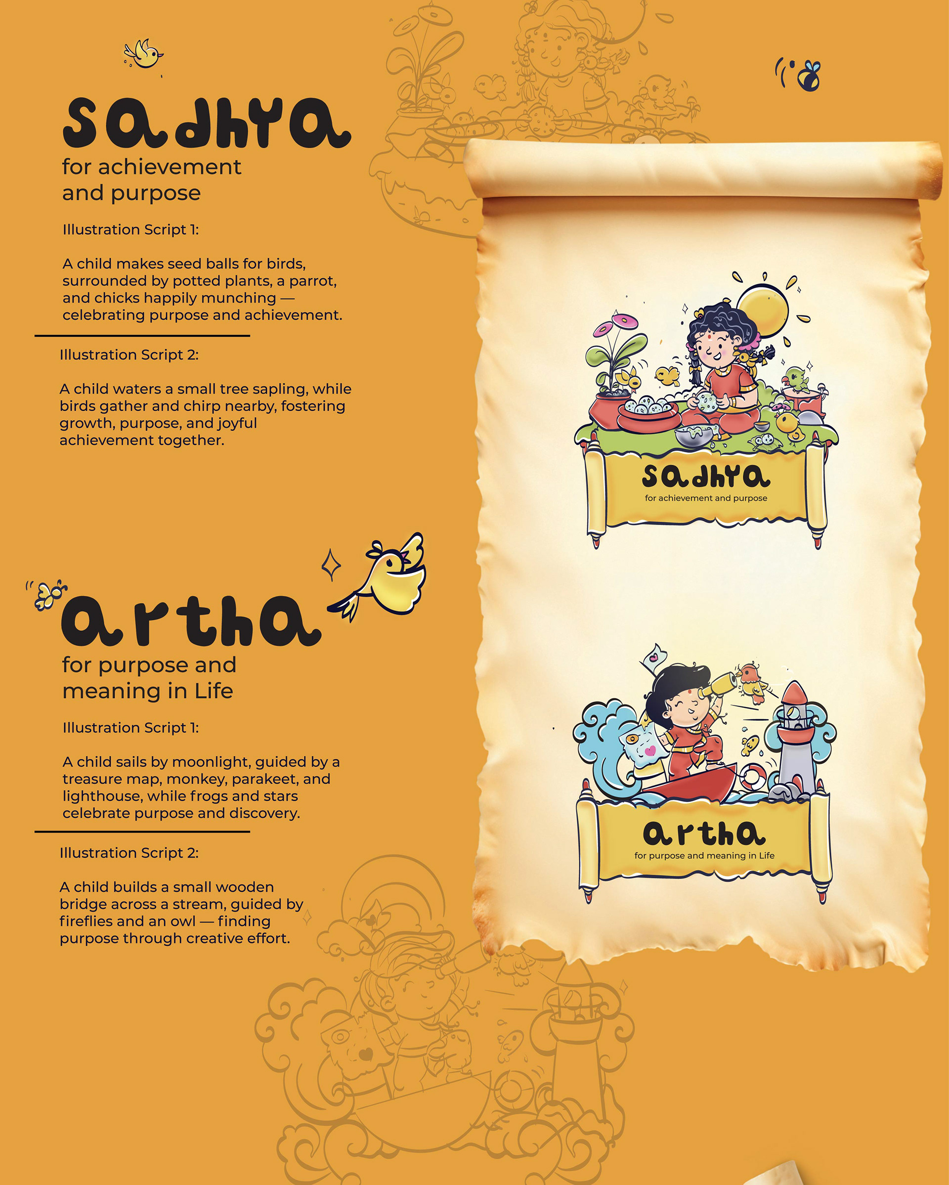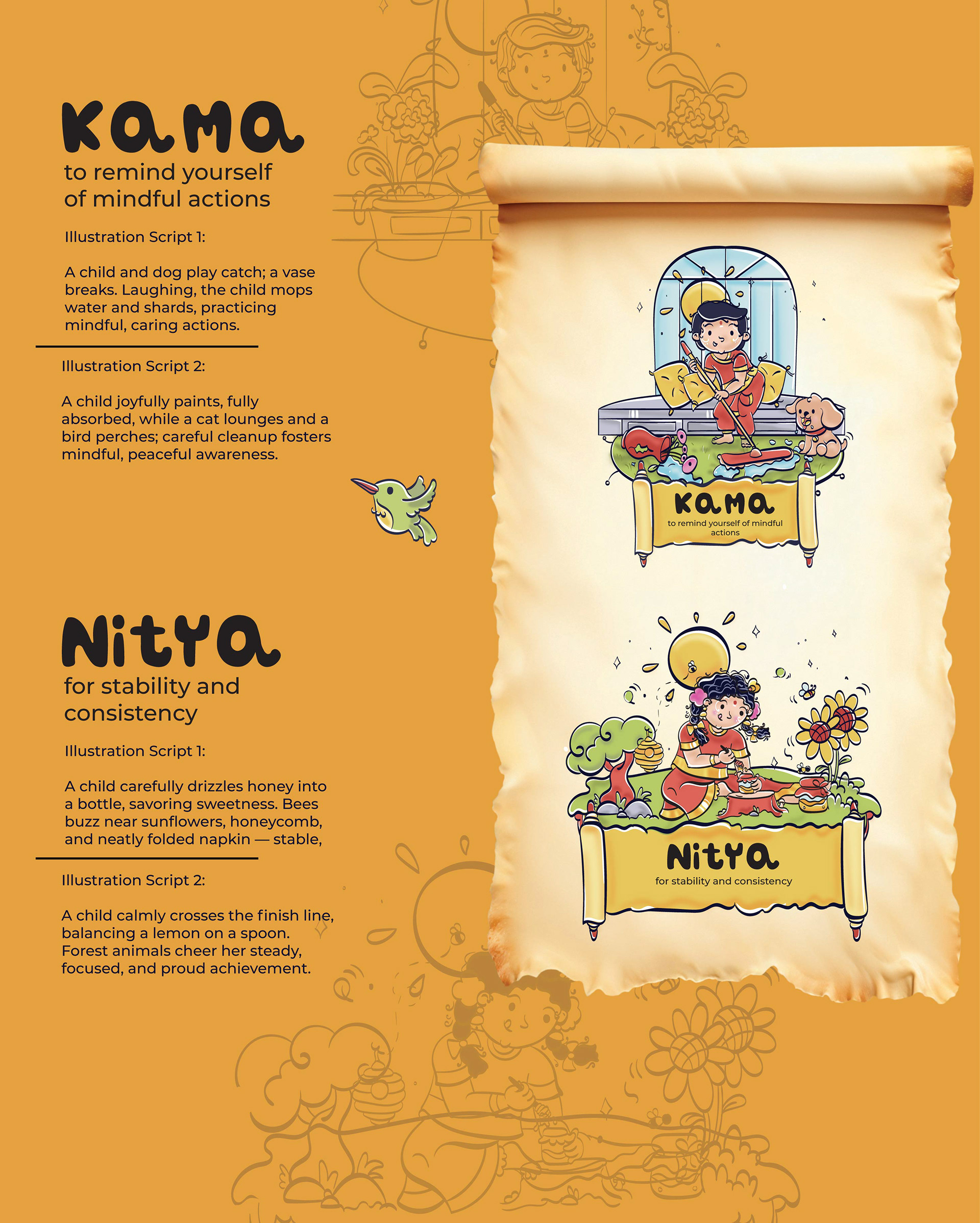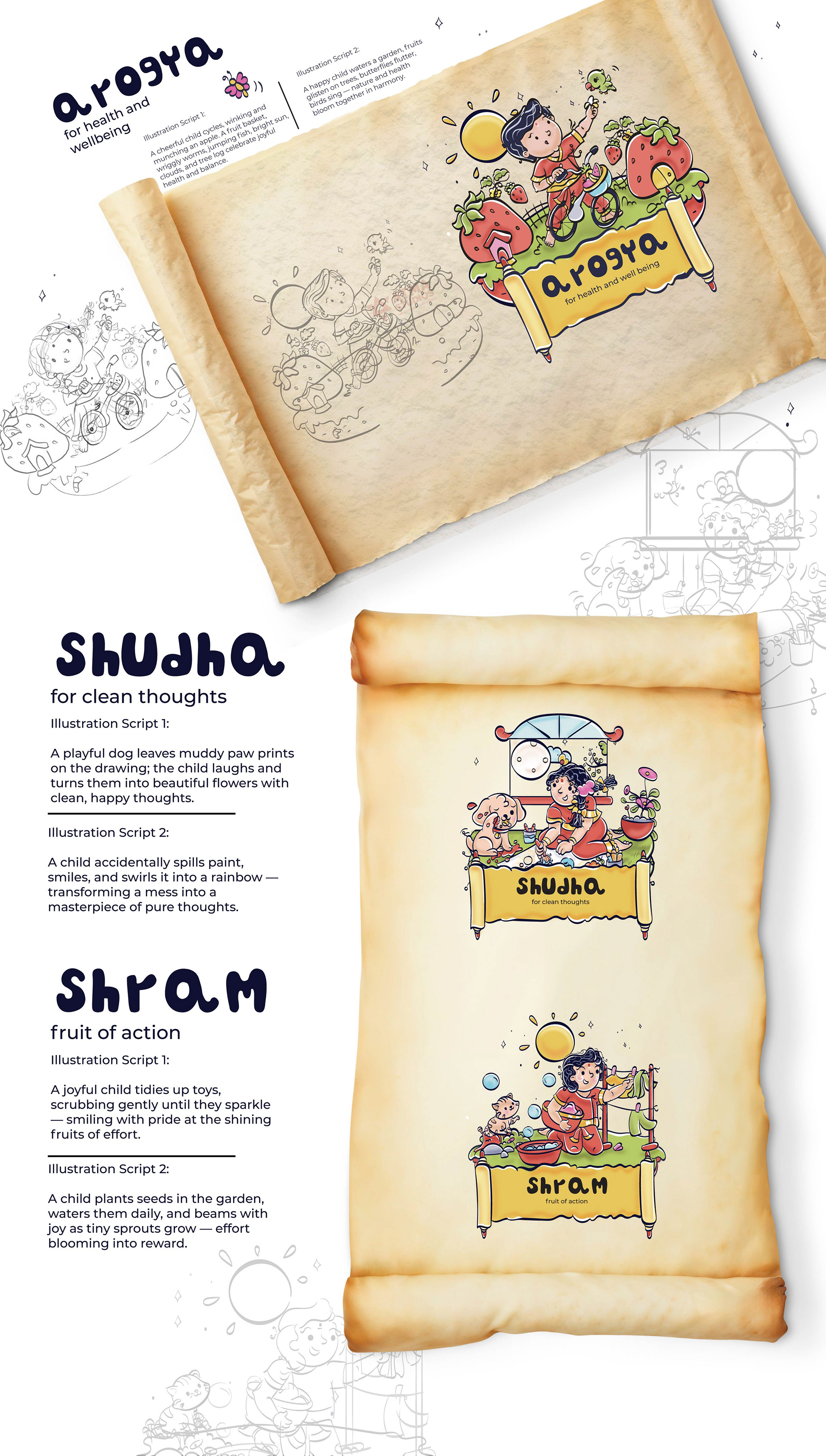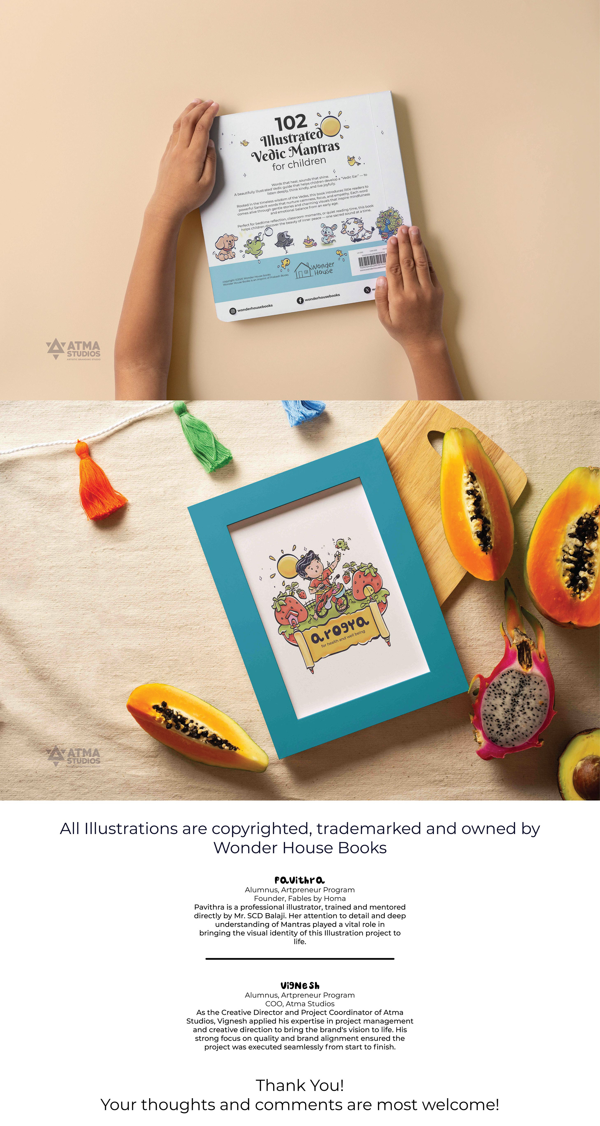 llustrated Vedic Mantras for Children is a visual storytelling project by Atma Studios that makes ancient Vedic chants engaging for young readers through playful comic-style art. Each mantra is illustrated with symbolic elements like lotuses and suns, inspiring mindfulness, compassion, and balance in a child-friendly way.