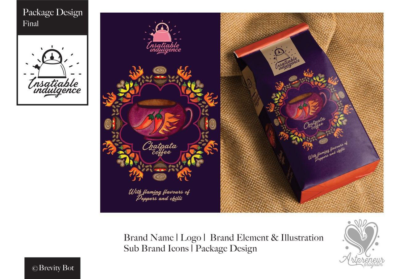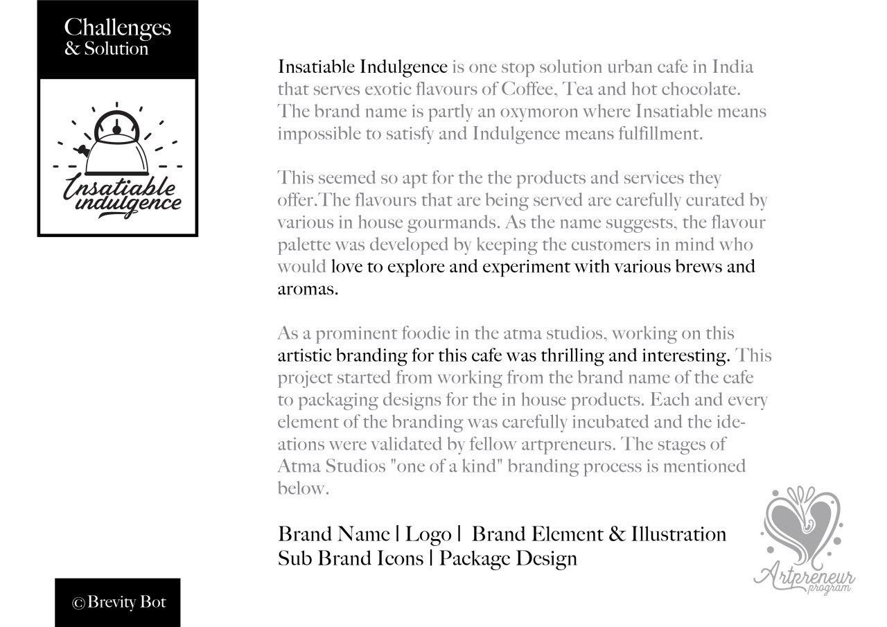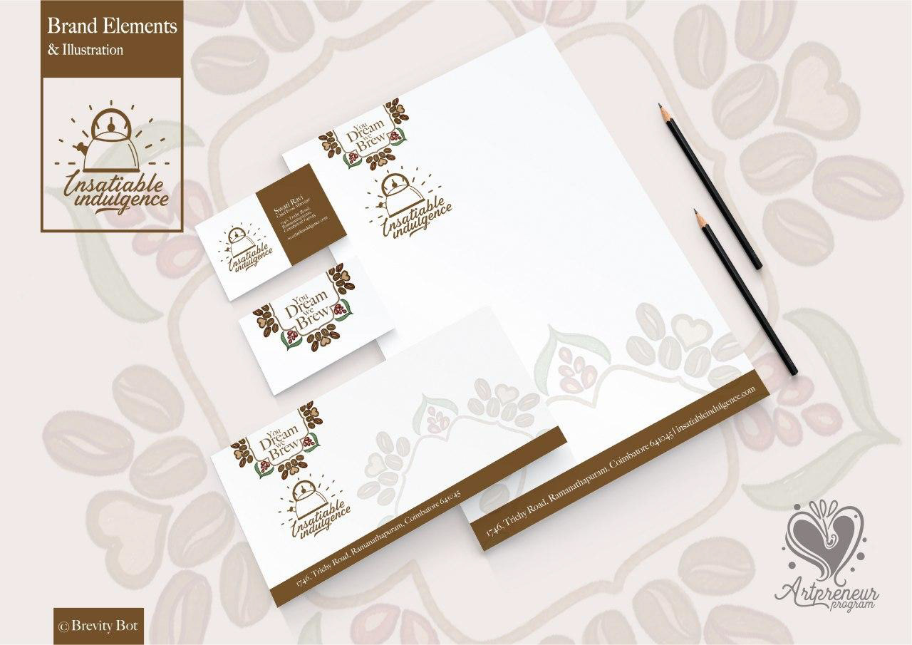 Insatiable Indulgence is an Urban café situated in the prime area of the city. It deals with providing an exotic and extensive range of Coffee, Tea & Hot Chocolate. The Brand Name is an oxymoron and, it resonates well with food lovers and their love to explore and experiment with foods. Right from the Brand name, every step of branding is carefully crafted with an Artistic touch by Artpreneur Swetha Sridharan The idea was to create a brand identity that would attract, envision and communicate their values to the customers.