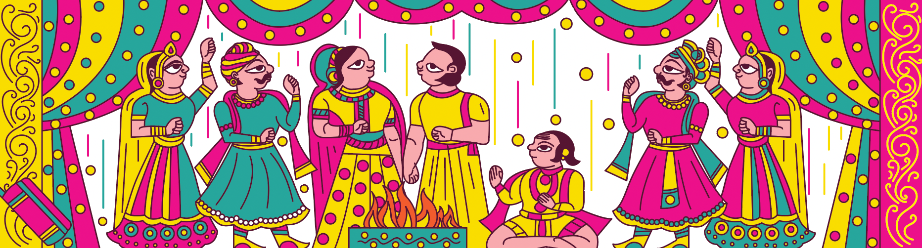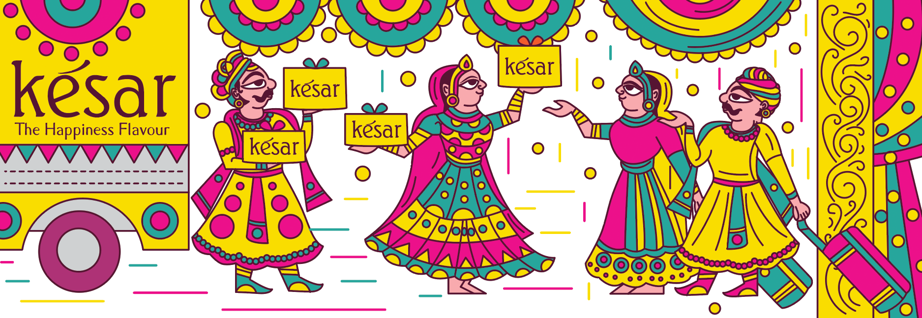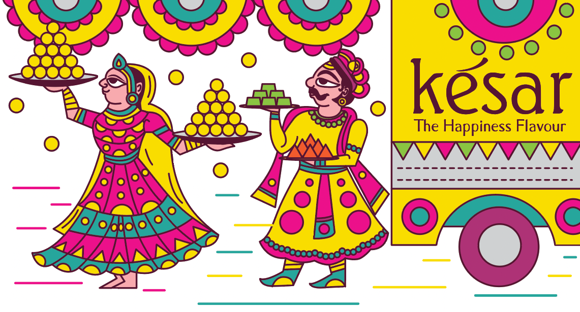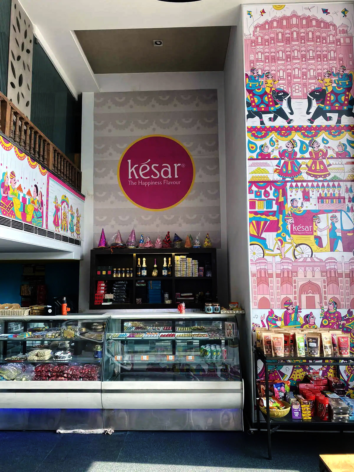 Digital wall mural illustrations of sweets in Indian weddings and events inspired by Rajasthani Phad Paintings for Kesar, a mithai boutique in Jaipur, has a long history of serving gourmet sweets worldwide.