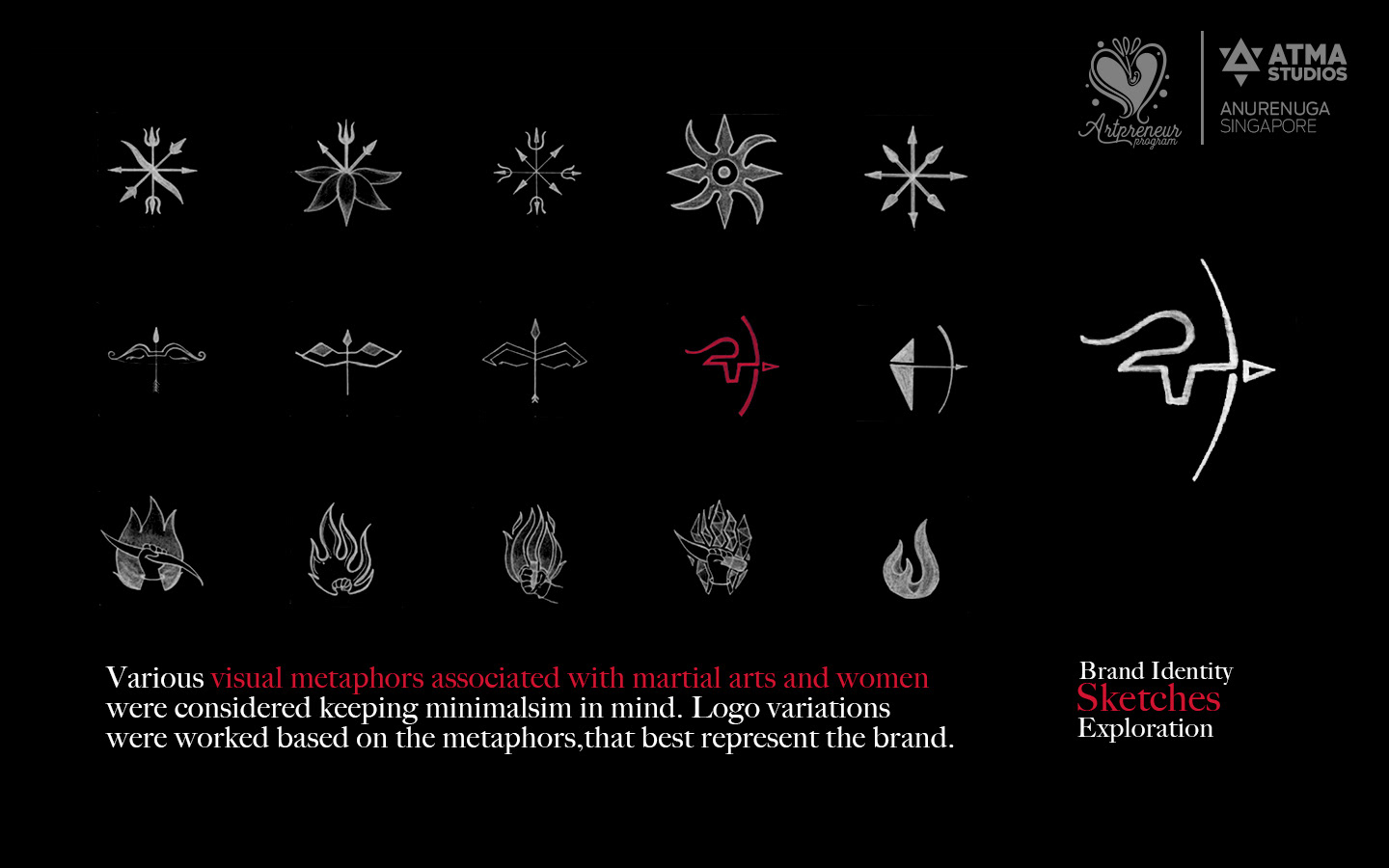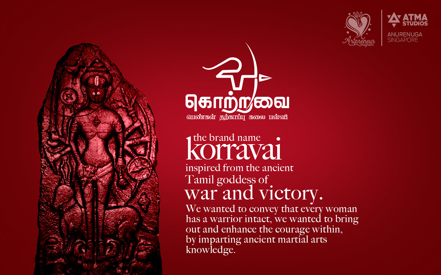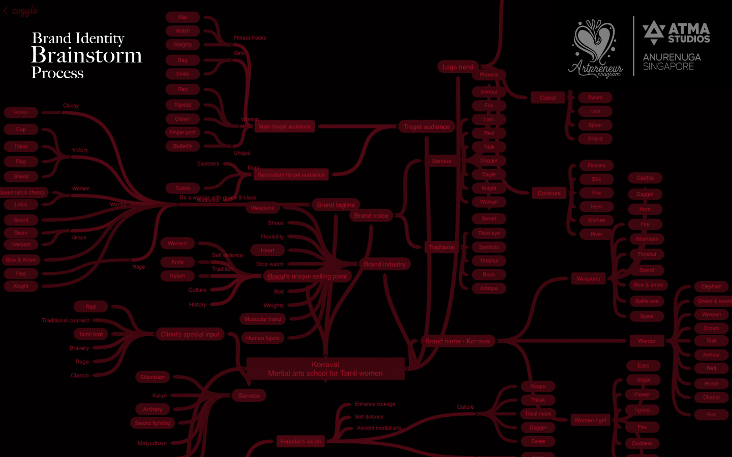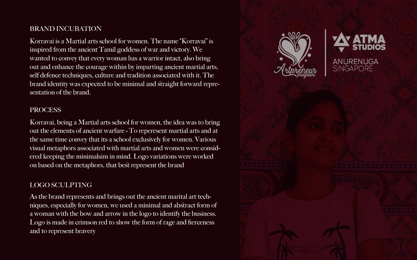 Artpreneur, an online program is a perfect blend of creativity, art and business. Anurenuga, a tribe of the artpreneur community (Singapore team), and a current student in the program has gone through the intense process of logo design and created the brand identity for a virtual brand, Korravai - Martial arts school for women.