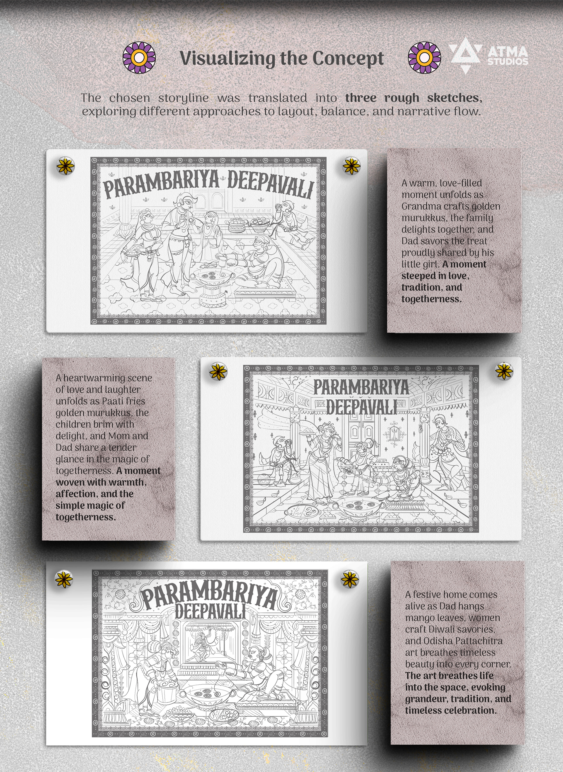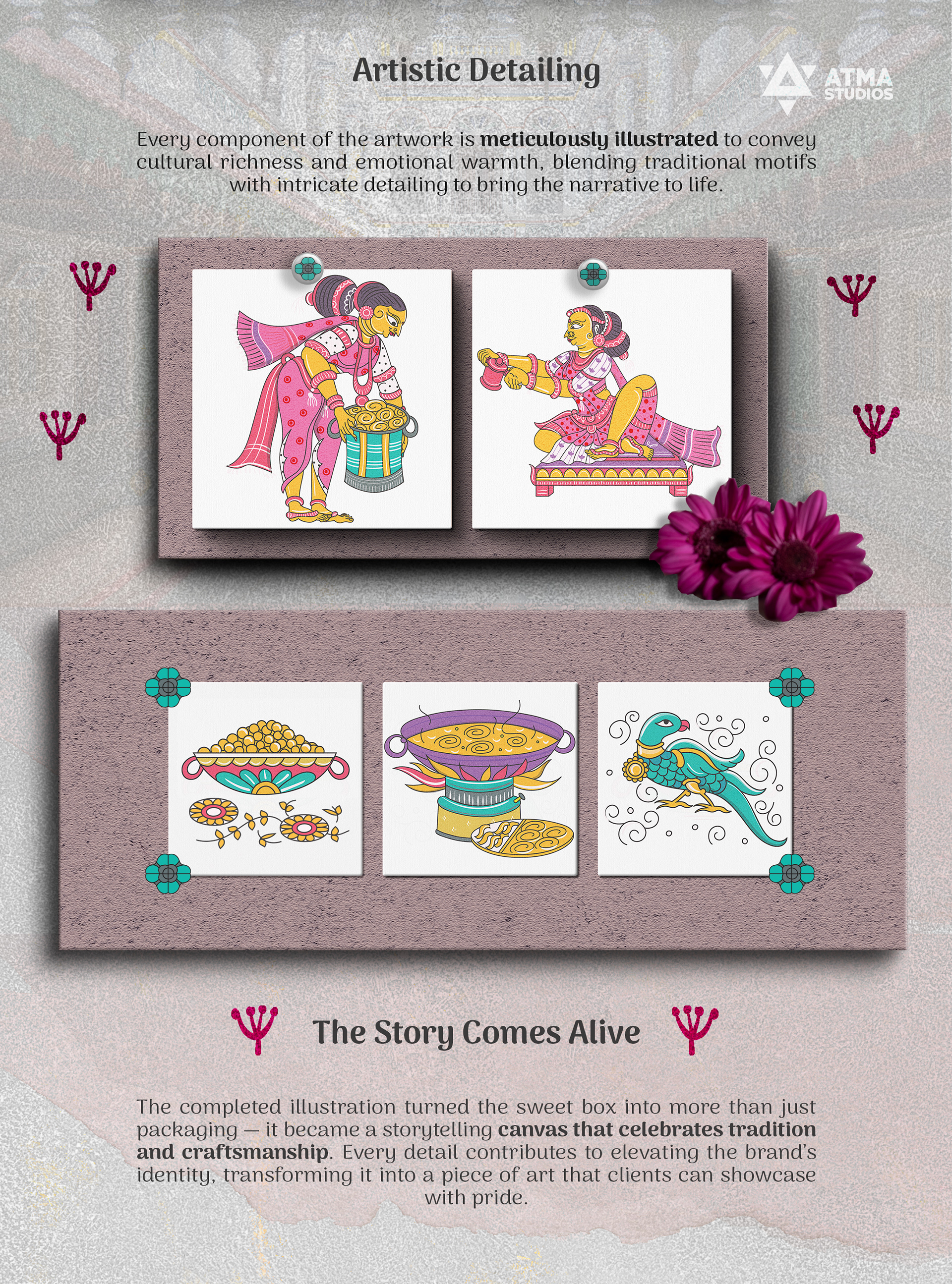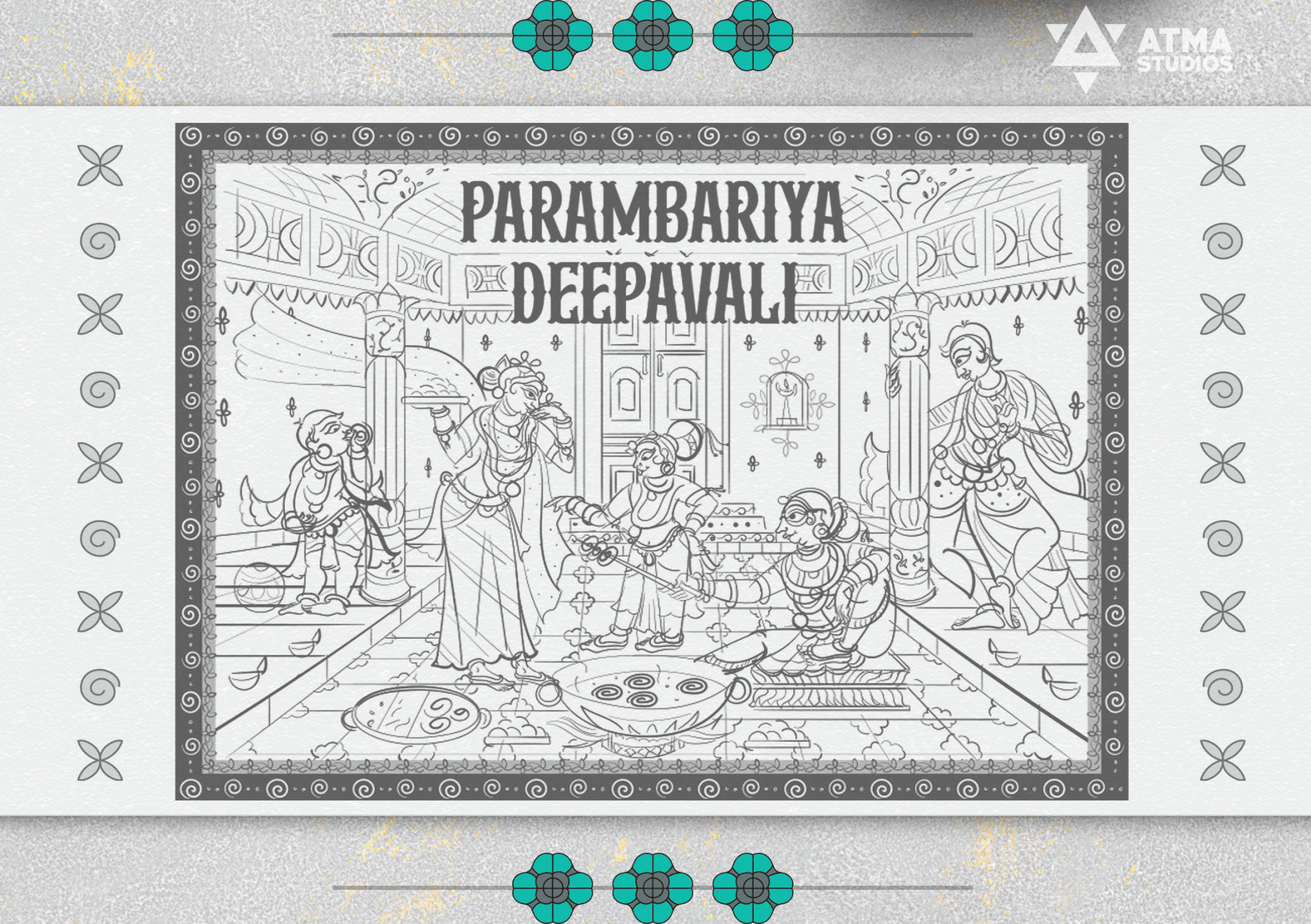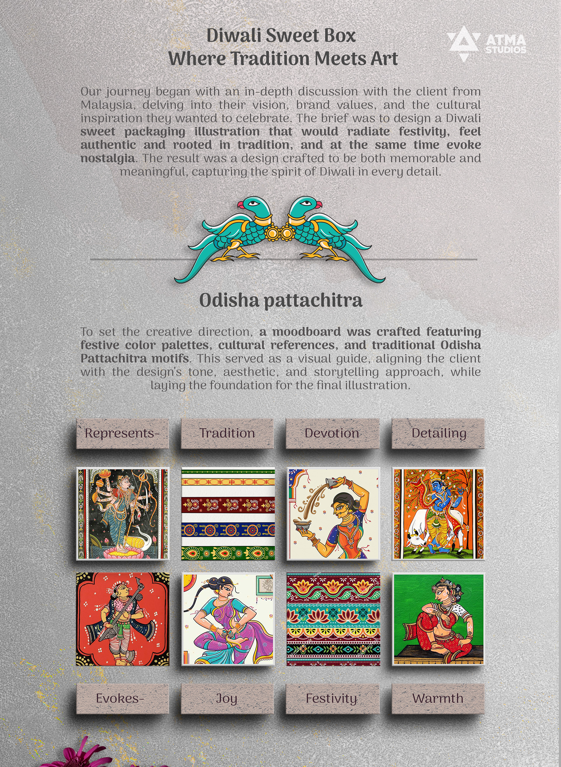Celebrating Tradition and Nostalgia. A Diwali Sweet Box illustrated in the Odisha Pattachitra style, capturing the nostalgic charm of families making murukku at home.