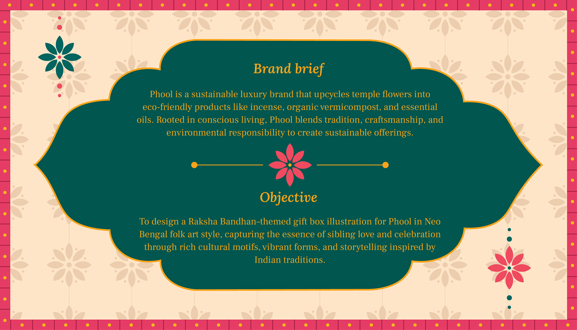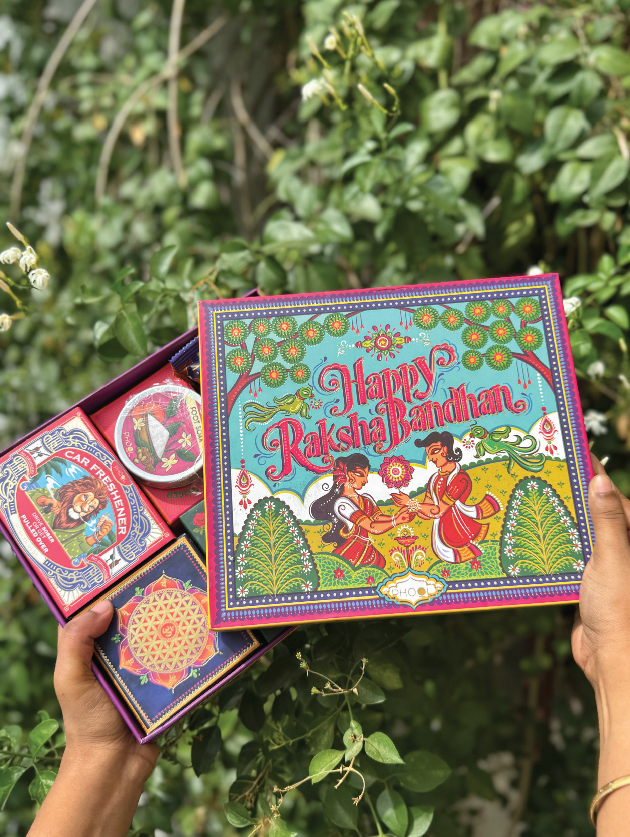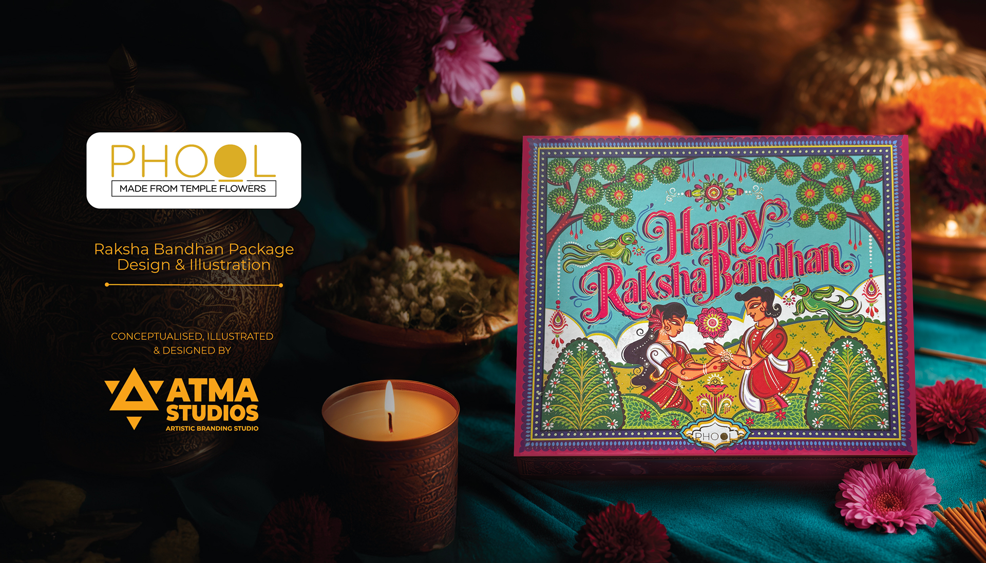Phool’s Raksha Bandhan–themed gift box, designed by Atma Studios, reimagines sibling love and celebration through the vibrant lens of Neo-Bengal folk art. The illustration blends rich cultural motifs, expressive forms, and traditional storytelling to honor Indian heritage. Rooted in sustainable luxury, Phool upcycles temple flowers into eco-friendly products, embodying a harmony of tradition, craftsmanship, and conscious living. The packaging reflects elegance and cultural depth, transforming the art of gift-giving into a joyful and meaningful experience.