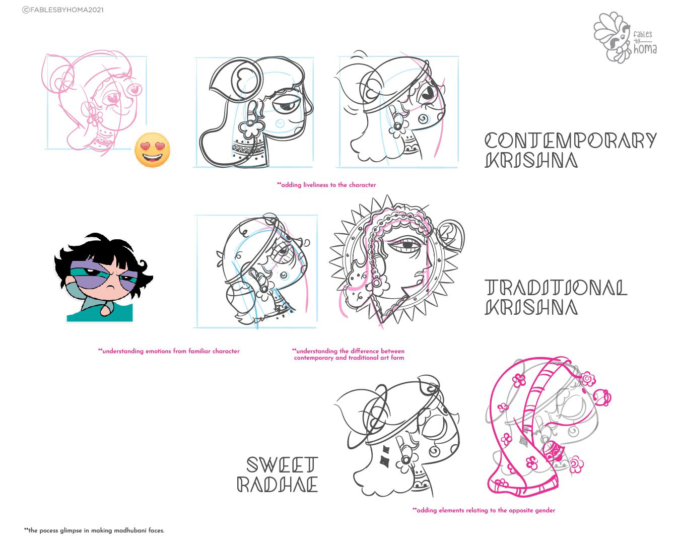 in Madhubani is an Indian folk art form, from Bihar. Geometrical designs, floral, animal, and bird elements are all included in the globalized art form. In this project, we have experimented with the nature of art form by adding curves to rigid geometric shapes. Traditionally, village women created these paintings to express their emotions, hopes, and ideas. We wanted to continue this tradition of emoting via stickers exclusive for telegram.