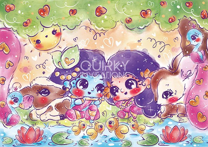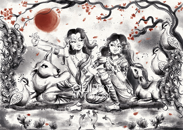 The ornate and vibrant bride and groom illustration style by SCD Balaji, The creator and founder of Quirky Invitations, Artpreneur Program and ATMA Studios. Customers have excitedly demanded that their invitations be made in this style, not just one but in many different cultural themes since the first illustration made its debut in QUIRKY INVITATIONS.This particular illustration style excites every Artpreneur. Radha and Krishna Illustration you see here is by one such Artpreneur.